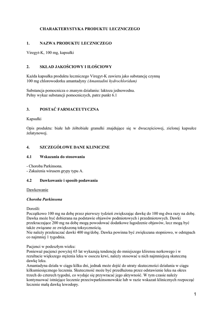 CHARAKTERYSTYKA PRODUKTU LECZNICZEGO 1. NAZWA PRODUKTU LECZNICZEGO Viregyt-K, 100 mg, kapsułki 2. SKŁAD JAKOŚCIOWY I ILOŚCIOWY Każda kapsułka produktu leczniczego Viregyt-K zawiera jako substancję czynną 100 mg chlorowodorku amantadyny (Amantadini hydrochloridum) Substancja pomocnicza o znanym działaniu: laktoza jednowodna. Pełny wykaz substancji pomocniczych, patrz punkt 6.1 3. POSTAĆ FARMACEUTYCZNA Kapsułki Opis produktu: białe lub żółtobiałe granulki znajdujące się w dwuczęściowej, zielonej kapsułce żelatynowej. 4. SZCZEGÓŁOWE DANE KLINICZNE 4.1 Wskazania do stosowania - Choroba Parkinsona. - Zakażenia wirusem grypy typu A. 4.2 Dawkowanie i sposób podawania Dawkowanie Choroba Parkinsona Dorośli: Początkowo 100 mg na dobę przez pierwszy tydzień zwiększając dawkę do 100 mg dwa razy na dobę. Dawka może być dobierana na podstawie objawów podmiotowych i przedmiotowych. Dawki przekraczające 200 mg na dobę mogą powodować dodatkowe łagodzenie objawów, lecz mogą być także związane ze zwiększoną toksycznością. Nie należy przekraczać dawki 400 mg/dobę. Dawka powinna być zwiększana stopniowo, w odstępach co najmniej 1 tygodnia. Pacjenci w podeszłym wieku: Ponieważ pacjenci powyżej 65 lat wykazują tendencję do mniejszego klirensu nerkowego i w rezultacie większego stężenia leku w osoczu krwi, należy stosować u nich najmniejszą skuteczną dawkę leku. Amantadyna działa w ciągu kilku dni, jednak może dojść do utraty skuteczności działania w ciągu kilkumiesięcznego leczenia. Skuteczność może być przedłużona przez odstawienie leku na okres trzech do czterech tygodni, co wydaje się przywracać jego aktywność. W tym czasie należy kontynuować istniejące leczenie przeciwparkinsonowskie lub w razie wskazań klinicznych rozpocząć leczenie małą dawką lewodopy. 1 Odstawianie amantadyny powinno być stopniowe, np. połowa dawki w odstępach tygodniowych. Nagłe przerwanie leczenia może zaostrzyć objawy choroby Parkinsona niezależnie od odpowiedzi pacjenta na leczenie (patrz punkt 4.4). Leczenie skojarzone: w trakcie wstępnego leczenia amantadyną należy kontynuować leczenie każdym już stosowanym lekiem przeciwparkinsonowskim. Jest wówczas możliwe stopniowe zmniejszanie dawki tamtego leku. Dawkę należy zmniejszać szybciej w razie nasilonych działań niepożądanych. U pacjentów otrzymujących duże dawki leków przeciwcholinergicznych lub lewodopy faza wstępna leczenia amantadyną powinna być przedłużona do 15 dni. W zakażeniach wirusem grypy A: Zalecane jest możliwie jak najwcześniejsze rozpoczynanie leczenia grypy i kontynuowanie go przez 4 do 5 dni. Przy rozpoczynaniu leczenia amantadyną w ciągu 48 godzin od wystąpienia objawów, czas trwania gorączki i innych objawów jest krótszy o 1-2 dni, a zwykle towarzysząca grypie reakcja zapalna drzewa oskrzelowego ustępuje szybciej. Dorośli: 100 mg na dobę przez zalecany okres. Pacjenci w starszym wieku (powyżej 65 lat): czynność nerek ma wpływ na stężenia amantadyny w osoczu krwi. U pacjentów w starszym wieku półokres eliminacji jest dłuższy, a klirens nerkowy związku zmniejszony w porównaniu z osobami młodymi. Odpowiednia może być dawka dobowa poniżej 100 mg, lub 100 mg podawana w odstępach dłuższych niż jeden dzień. Dzieci i młodzież W zakażeniach wirusem grypy A: Dzieci w wieku 10-15 lat: 100 mg na dobę przez zalecany okres. Dzieci poniżej 10 lat: dawkowanie nie zostało ustalone. U pacjentów z zaburzeniami czynności nerek: dawka amantadyny powinna być zmniejszona. Można to uzyskać przez zmniejszenie całkowitej dawki dobowej, lub przez wydłużenie odstępu między dawkami według klirensu kreatyniny. Przykładowo Klirens kreatyniny ml/(min) Dawka < 15 Lek przeciwwskazany. 15 – 35 100 mg co 2 do 3 dni. > 35 100 mg codziennie Sposób podawania Kapsułki do stosowania doustnego. 4.3 Przeciwwskazania Nadwrażliwość na substancję czynną lub na którąkolwiek substancję pomocniczą wymienioną w punkcie 6.1 Osoby, u których występują drgawki. Choroba wrzodowa żołądka w wywiadzie. Ciężka choroba nerek. Ciąża. 4.4 Specjalne ostrzeżenia i środki ostrożności dotyczące stosowania Viregyt-K powinien być stosowany z zachowaniem ostrożności u pacjentów ze stanami splątania i omamami oraz podstawowymi chorobami psychicznymi, u pacjentów z zaburzeniami czynności wątroby lub nerek oraz z aktualnymi lub przebytymi chorobami sercowo-naczyniowymi. Należy 2 zachować ostrożność przy przepisywaniu amantadyny z innymi lekami mającymi wpływ na OUN (patrz punkt 4.5). Nagłe przerwanie leczenia może zaostrzyć objawy choroby Parkinsona lub objawy naśladujące złośliwy zespół neuroleptyczny (NMS) jak również objawy związane z czynnościami poznawczymi (np. katatonia, splątanie, dezorientacja, pogorszenie czynności umysłowych, majaczenie). Nie należy nagle przerywać leczenia produktem leczniczym Viregyt-K u pacjentów leczonych jednocześnie neuroleptykami. Były pojedyncze zgłoszenia wywołania lub nasilenia złośliwego zespołu neuroleptycznego lub katatonii wywołanej neuroleptykami po odstawieniu amantadyny u pacjentów przyjmujących neuroleptyki. Rzadko zgłaszano występowanie podobnego zespołu po odstawieniu amantadyny i innych leków przeciwparkinsonowskich u pacjentów, którzy nie przyjmowali jednocześnie leków wpływających na psychikę. Oporność na amantadynę występuje w trakcie seryjnego pasażowania szczepów wirusów grypy in vitro lub in vivo w obecności leku. Jawne przenoszenie wirusów opornych na lek mogło być przyczyną niepowodzenia profilaktyki i leczenia u osób mających kontakt w warunkach domowych i u pacjentów w domach opieki. Jednak do tej pory nie ma danych, że wirusy oporne wywołują chorobę, która w jakikolwiek sposób różni się od wywoływanej przez wirusy wrażliwe. Ponieważ istniały przypadki prób samobójczych przy użyciu a