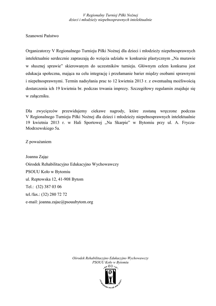 V Regionalny Turniej Piłki Nożnej dzieci i młodzieży niepełnosprawnych intelektualnie Szanowni Państwo Organizatorzy V Regionalnego Turnieju Piłki Nożnej dla dzieci i młodzieży niepełnosprawnych intelektualnie serdecznie zapraszają do wzięcia udziału w konkursie plastycznym „Na murawie w słusznej sprawie” skierowanym do uczestników turnieju. Głównym celem konkursu jest edukacja społeczna, mająca na celu integrację i przełamanie barier między osobami sprawnymi i niepełnosprawnymi. Termin nadsyłania prac to 12 kwietnia 2013 r. z ewentualną możliwością dostarczenia ich 19 kwietnia br. podczas trwania imprezy. Szczegółowy regulamin znajduje się w załączniku. Dla zwycięzców przewidujemy ciekawe nagrody, które zostaną wręczone podczas V Regionalnego Turnieju Piłki Nożnej dla dzieci i młodzieży niepełnosprawnych intelektualnie 19 kwietnia 2013 r. w Hali Sportowej „Na Skarpie” w Bytomiu przy ul. A. FryczaModrzewskiego 5a. Z poważaniem Joanna Zając Ośrodek Rehabilitacyjno Edukacyjno Wychowawczy PSOUU Koło w Bytomiu ul. Reptowska 12, 41-908 Bytom Tel.: (32) 387 03 06 tel./fax.: (32) 280 72 72 e-mail: [email protected] Ośrodek Rehabilitacyjno Edukacyjno Wychowawczy PSOUU Koło w Bytomiu V Regionalny Turniej Piłki Nożnej dzieci i młodzieży niepełnosprawnych intelektualnie Regulamin Konkursu Plastycznego pt.: „Na murawie w słusznej sprawie”. Organizator konkursu: Ośrodek Rehabilitacyjno Edukacyjno Wychowawczy PSOUU Koło w Bytomiu, ul. Reptowska 12, 41-908 Bytom Tel.: (32) 387 03 06 Adresaci: konkurs skierowany jest do szkół, instytucji, fundacji oraz stowarzyszeń biorących udział w V Regionalnym Turnieju Piłki Nożnej dla dzieci i młodzieży niepełnosprawnych intelektualnie. Termin nadsyłania prac: 12 kwietnia 2013 r. z ewentualną możliwością dostarczenia prac 19 kwietnia br. podczas trwania imprezy. Cele konkursu: - edukacja społeczna, mająca na celu integrację i przełamanie barier między osobami sprawnymi i niepełnosprawnymi, - promowanie kształcenia i wychowania przez sport, - aktywizacja twórcza uczestników. Warunki uczestnictwa: 1. W konkursie mogą brać udział wszyscy uczestnicy V Regionalnego Turnieju Piłki Nożnej dla dzieci i młodzieży niepełnosprawnych intelektualnie, który obędzie się 19 kwietnia 2013 r. w Hali Sportowej „Na Skarpie” w Bytomiu przy ul. A. Frycza-Modrzewskiego 5a. 2. Każda placówka może złożyć dowolną ilość prac. 3. Prace mogą być wykonywane dowolną techniką malarską lub rysunkową w formacie nie przekraczającym A3. 4. Prace wykonuje się indywidualnie lub grupowo z ewentualną pomocą opiekuna. Ośrodek Rehabilitacyjno Edukacyjno Wychowawczy PSOUU Koło w Bytomiu V Regionalny Turniej Piłki Nożnej dzieci i młodzieży niepełnosprawnych intelektualnie 5. Każda praca powinna zawierać następujące informacje: a) imię i nazwisko autora/autorów pracy, b) dokładne dane instytucji którą reprezentuje (nazwa, adres, numer telefonu oraz adres mailowy do korespondencji). 6. Prace należy przesłać do OREW w Bytomiu (Ośrodek Rehabilitacyjno Edukacyjno Wychowawczy PSOUU Koło w Bytomiu, ul. Reptowska 12, 41-908 Bytom) lub dostarczyć osobiście z dopiskiem „Na murawie w słusznej sprawie”. Do pracy prosimy dołączyć podpisany załącznik do regulaminu (zgoda na przetwarzanie danych osobowych oraz wykorzystanie pracy). 7. Ocena prac zostanie dokonana przez organizatorów Turnieju Piłki Nożnej. 8. Kryterium przyznania nagród: - ogólne wrażenie artystyczne, - praca zgodna z tematem, - oryginalność ujęcia tematu. 9. Organizatorzy przewidują nagrody za I, II i III miejsce. 10. Uczestnicy oraz laureaci konkursu otrzymają dyplom potwierdzający udział w konkursie. 11. Ogłoszenie wyników i wręczenie nagród oraz dyplomów nastąpi podczas V Regionalnego Turnieju Piłki Nożnej dla dzieci i młodzieży niepełnosprawnych intelektualnie w dniu 19 kwietnia 2013 roku. 12. Niniejszy regulamin dostępny jest na stronach: www.orew.miechowice.info/home.html www.facebook.com/VRegionalnyTurniejPilkiNoznej www.turniejorew.psouubytom.org Szczegółowych informacji o konkursie udziela: Joanna Zając: [email protected] Tel.: (32) 387 03 06 Ośrodek Rehabilitacyjno Edukacyjno Wychowawczy PSOUU Koło w Bytomiu V Regionalny Turniej Piłki Nożnej dzieci i młodzieży niepełnosprawnych intelektualnie Załącznik do Regulaminu Konkursu Plastycznego „Na murawie w słusznej sprawie”. ZGODA NA PRZETWARZANIE DANYCH OSOBOWYCH ORAZ WYKORZYSTANIE PRACY Wyrażam zgodę na przetwarzanie danych osobowych, na potrzeby realizacji Konkursu Plastycznego „Na murawie w słusznej sprawie” zgodnie z ustawą z dnia 29 sierpnia 1997 r. o ochronie danych osobowych ( Dz. U. 1997 nr 133, poz. 883 ). Wyrażam zgodę na wykorzystanie przez organizatora konkursu zgłoszonej pracy na wszystkich polach eksploatacji, a w szczególności na potrzeby tego konkursu, promocji oraz jej publikowania, zgodnie z ustawą z 4 lutego 1994 r. o prawie autorskim i prawach pokrewnych (t.j. Dz. U. z 2006 r., Nr 90, poz. 631 z późn. zm.) ……………………………… imię i nazwisko uczestnika ………………………………… podpis pełnoletniego uczestnika lub jego pełnoprawnego opiekuna Ośrodek Rehabilitacyjno Edukacyjno Wychowawczy PSOUU Koło w Bytomiu