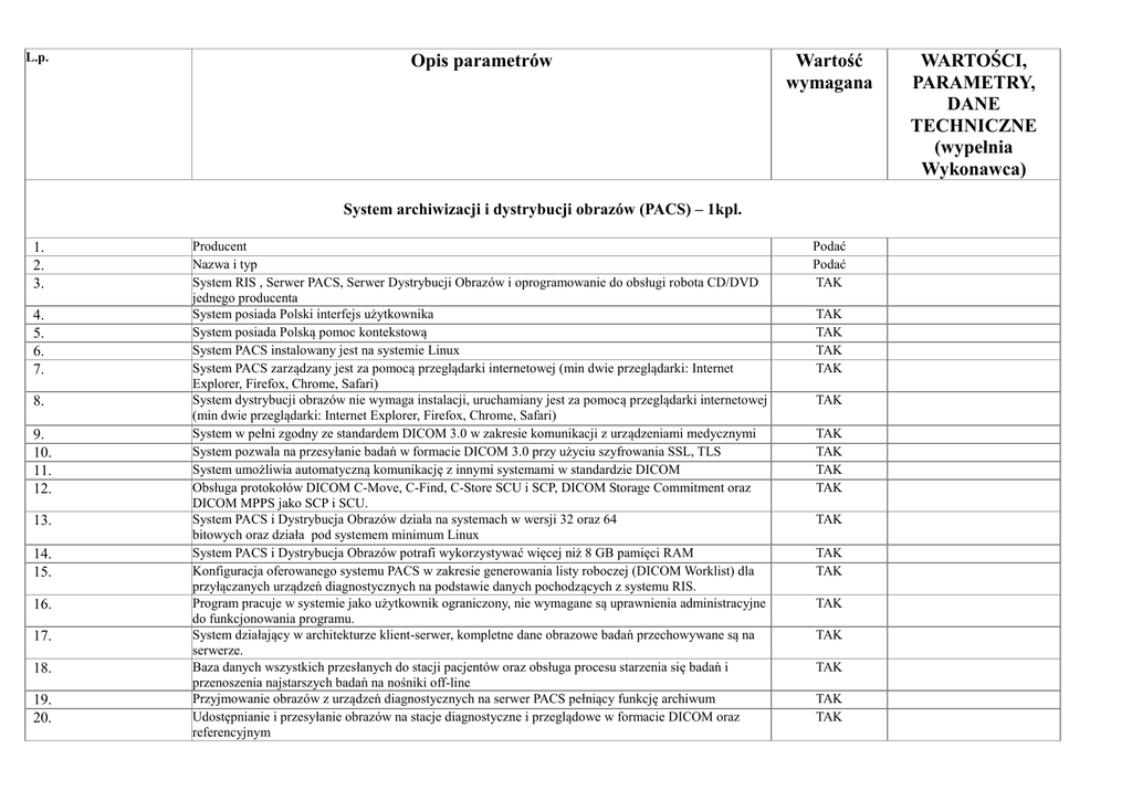 L.p. Opis parametrów Wartość wymagana System archiwizacji i dystrybucji obrazów (PACS) – 1kpl. 1. 2. 3. 4. 5. 6. 7. 8. 9. 10. 11. 12. 13. 14. 15. 16. 17. 18. 19. 20. Producent Nazwa i typ System RIS , Serwer PACS, Serwer Dystrybucji Obrazów i oprogramowanie do obsługi robota CD/DVD jednego producenta System posiada Polski interfejs użytkownika System posiada Polską pomoc kontekstową System PACS instalowany jest na systemie Linux System PACS zarządzany jest za pomocą przeglądarki internetowej (min dwie przeglądarki: Internet Explorer, Firefox, Chrome, Safari) System dystrybucji obrazów nie wymaga instalacji, uruchamiany jest za pomocą przeglądarki internetowej (min dwie przeglądarki: Internet Explorer, Firefox, Chrome, Safari) System w pełni zgodny ze standardem DICOM 3.0 w zakresie komunikacji z urządzeniami medycznymi System pozwala na przesyłanie badań w formacie DICOM 3.0 przy użyciu szyfrowania SSL, TLS System umożliwia automatyczną komunikację z innymi systemami w standardzie DICOM Obsługa protokołów DICOM C-Move, C-Find, C-Store SCU i SCP, DICOM Storage Commitment oraz DICOM MPPS jako SCP i SCU. System PACS i Dystrybucja Obrazów działa na systemach w wersji 32 oraz 64 bitowych oraz działa pod systemem minimum Linux System PACS i Dystrybucja Obrazów potrafi wykorzystywać więcej niż 8 GB pamięci RAM Konfiguracja oferowanego systemu PACS w zakresie generowania listy roboczej (DICOM Worklist) dla przyłączanych urządzeń diagnostycznych na podstawie danych pochodzących z systemu RIS. Program pracuje w systemie jako użytkownik ograniczony, nie wymagane są uprawnienia administracyjne do funkcjonowania programu. System działający w architekturze klient-serwer, kompletne dane obrazowe badań przechowywane są na serwerze. Baza danych wszystkich przesłanych do stacji pacjentów oraz obsługa procesu starzenia się badań i przenoszenia najstarszych badań na nośniki off-line Przyjmowanie obrazów z urządzeń diagnostycznych na serwer PACS pełniący funkcję archiwum Udostępnianie i przesyłanie obrazów na stacje diagnostyczne i przeglądowe w formacie DICOM oraz referencyjnym Podać Podać TAK TAK TAK TAK TAK TAK TAK TAK TAK TAK TAK TAK TAK TAK TAK TAK TAK TAK WARTOŚCI, PARAMETRY, DANE TECHNICZNE (wypełnia Wykonawca) 21. 22. 23. 24. 25. 26. 27. 28. 29. 30. 31. 32. 33. 34. 35. 36. Możliwość podglądu pełnych danych o pacjencie i badaniu zawartych w pliku obrazu Walidacja zgodności przychodzących danych obrazowych z danymi z systemu RIS. W przypadku niepomyślnej walidacji integracja systemu PACS z systemem dystrybucji obrazów oraz stacjami diagnostycznymi ma wyświetlać przy otwieraniu obrazu informację o nieudanej walidacji badania. Program współpracuje z archiwum krótkoterminowego z archiwum długoterminowym (off-line) zarządzanie automatycznym przenoszeniem badań pomiędzy archiwami: najdawniej wykonanych najrzadziej przeglądanych najdawniej przeglądanych uwzględnienie (przez zaznaczenie) np. przewlekłych chorób i konieczności powtarzania badań w dłuższym okresie czasu (pozostawienie w archiwum on-line) Program pozwala na ustawienie procesu archiwizacji danych na zewnętrzne nośniki np (po określonej godzinie, w określone dni, zaraz po spłynięciu badania) Program pozwala na ustawienie procesu usuwania z dysku danych znajdujących się na zewnętrznych nośnikach (po przekroczeniu określonego progu zajętości) Program pozwala na wykonywanie kopii bezpieczeństwa na napędzie LTO / CD / DVD Program pozwala na niezależne przechowywanie miniatur, nawet po przeniesieniu badań DICOM na napęd LTO / CD / DVD Program pozwala na wyszukanie pacjenta po jednym z poniższych kryteriów: ID Pacjenta ID Badania Imię i nazwisko Pacjenta Data urodzenia pacjenta Opis badania (studyDescription) Data badania Zarządzanie informacjami i ustawieniami kont użytkowników przez administratora Systemu Program jest zintegrowany z drzewem LDAP (OpenLDAP, Microsoft Active Directory) Program pozwala na centralne zarządzanie użytkownikami w drzewie LDAP i określanie ich przynależności do ról i grup. Aplikacja do zarządzania drzewami LDAP dostępna przez www i jest w stanie dopasować się do dowolnego formatu drzewa LDAP. Program posiada w pełni funkcjonalny program do zarządzania użytkownikami / grupami i rolami (dla LDAP). Program współpracuje z ActiveDirectory. Program pozwala użytkownikowi na logowanie się do systemu PACS i udostępnianie mu zakresu badań zależnie od przyznanych uprawnień (np: tylko badania RTG, tylko badania USG. ).Ograniczenia dostępu współpracują ze stacjami diagnostycznymi. Program pozwala na zarządzanie uprawnieniami użytkowników PACS, RIS i modułu dystrybucji webowej TAK TAK Integracja zapewniająca wyświetlanie listy wszystkich poprzednio wykonanych badań pacjenta w aplikacji systemu dystrybucji obrazów, które zostały wysłane do systemu PACS Uaktualnienia w obiegu danych: Pacjent-Opisy-Badanie, min. zmiana imienia i nazwiska pacjenta, rodzaju badania oraz opisu w systemie RIS powoduje automatycznie zmianę tych danych i ich wyświetlenie w aplikacji systemu dystrybucji obrazów. TAK TAK TAK TAK TAK TAK TAK TAK TAK TAK TAK TAK TAK TAK 37. 38. 39. 40. 41. 42. 43. 44. 45. 46. 47. 48. 49. Możliwość przydzielenia użytkownika systemu do określonej roli, na przykład lekarza radiologa, lekarza klinicysty Możliwość przydzielenia roli użytkownika systemu do określonego oddziału. Na przykład oddział chirurgii, neurologii Możliwość przydzielenia odpowiednich uprawnień dla określonego typu roli użytkownika systemu Rodzaje uprawnień: - uprawnienia do narzędzi administracyjnych i ich poszczególnych opcji, min.: ustawień autoroutingu ustawień archiwizacji off-line dodawania dodatkowych źródeł DICOM kasowanie badań z systemu ustawień kompresji obrazów - uprawnienia do używania poszczególnych narzędzi w stacjach diagnostycznych i w systemie dystrybucji obraz