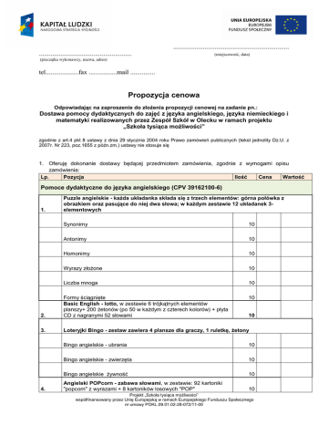 ...................................................................... ........................................................ (miejscowość, data) (pieczątka wykonawcy, nazwa, adres) tel....................fax .................mail ............... Propozycja cenowa Odpowiadając na zaproszenie do złoŜenia propozycji cenowej na zadanie pn.: Dostawa pomocy dydaktycznych do zajęć z języka angielskiego, języka niemieckiego i matematyki realizowanych przez Zespół Szkół w Olecku w ramach projektu „Szkoła tysiąca moŜliwości” zgodnie z art.4 pkt 8 ustawy z dnia 29 stycznia 2004 roku Prawo zamówień publicznych (tekst jednolity Dz.U. z 2007r. Nr 223, poz.1655 z późn.zm.) ustawy nie stosuje się 1. Oferuję dokonanie dostawy będącej przedmiotem zamówienia, zgodnie z wymogami opisu zamówienia: Lp. Pozycja Ilość Cena Wartość Pomoce dydaktyczne do języka angielskiego (CPV 39162100-6) 1. Puzzle angielskie - kaŜda układanka składa się z trzech elementów: górna połówka z obrazkiem oraz pasujące do niej dwa słowa; w kaŜdym zestawie 12 układanek 3elementowych Synonimy 10 Antonimy 10 Homonimy 10 Wyrazy złoŜone 10 Liczba mnoga 10 10 2. Formy ściągnięte Basic English - lotto, w zestawie 6 trójkątnych elementów planszy+ 200 Ŝetonów (po 50 w kaŜdym z czterech kolorów) + płyta CD z nagranymi 52 słowami 3. Loteryjki Bingo - zestaw zawiera 4 plansze dla graczy, 1 ruletkę, Ŝetony 4. 10 Bingo angielskie - ubrania 10 Bingo angielskie - zwierzęta 10 Bingo angielskie Ŝywność 10 Angielski POPcorn - zabawa słowami, w zestawie: 92 kartoniki "popcorn" z wyrazami + 8 kartoników losowych "POP" 10 Projekt „Szkoła tysiąca moŜliwości” współfinansowany przez Unię Europejską w ramach Europejskiego Funduszu Społecznego nr umowy POKL.09.01.02-28-072/11-00 5. 6. Budowanie zdań – grupowy zestaw z klockami Reading Rods 156 klocków Reading Roads w pudełku, 24 dwustronne karty aktywności, ksiąŜka metodyczna, 100 kartoników do demonstracji, 4 podstawki Tworzenie wyrazów – grupowy zestaw z klockami Reading Rods - 109 klocków Reading Roads w pudełku, 24 dwustronne karty aktywności, ksiąŜka metodyczna, 100 kartoników do demonstracji, 4 podstawki 10. Trening budowania zdań angielskich-w zestawie: 32 zdania o wym. 6,5 x 38 cm + 120 kartoników wyrazowych o wym. 6,5 x 6,5 cm+4 drewniane podstawki o wym. 40x4,5x 2 cm Magnetyczne zdania angielskie, w zestawie: magnetyczna podstawa o wym. 20 x 26,5 cm + 14 fraz o wym. 4 x 11,5 cm+ 27 wyrazów + 3 kropki Makatka – Idiom of the Week, w zestawie: makatka z mocnego nylonu z dwoma przezroczystymi kieszeniami (33 x 70 cm)+ 20 dwustronnych kart z 40 idiomami Makatka - angielski alfabet, w zestawie trwała makatka 71x86 cm, 156 kartoników z obrazkami, 52 kartoniki z literami, 4 kartoniki blanko 11. Maty do angielskiego - mata wymiary 90x220 cm 7. 8. 9. 12. 2 2 10 10 2 2 Days of the week 2 Months of the year 2 Karty fotograficzne - w zestawie: 150 dwustronnych kolorowych kart - wym. 7 x 7 cm +pudełko z przedziałkami Advanced Vocabulary 2 2 13. Beginning Vocabulary What's the time? Zegar magnetyczny z angielskim podpisami, w zestawie: tarcza zegarowa z folii magnetycznej z ruchomymi wskazówkami (wym. 48 x 63 cm) + 6 magnetycznych plakietek (w języku angielskim) 14. Word for Word - gra słowna, 112 klocków Reading Rods+klepsydra+4 ołówki+notatnik 4 15. Word sort- sortujemy wyrazy - 5 dwustronnych, laminowanych plansz (27 x 42 cm) + 200 dwustronnych kartoników z grubej tektury 4 16. Układamy angielskie zdania z fotografiami - 55 kartoników ze słowamim +27 kartoników z fotografiami + 4 kartoników ze znakami interpunkcyjnymi - wym. kartonika 5,5 x 6 cm 20 17. Angielskie słówka - puzzle -układanki dla dzieci czytających. Zadaniem jest dobrać w pary obrazek i angielski wyraz. 2 Część 1 - dom 1 Część 2- Ŝywność 1 Część 4 - godziny 1 Projekt „Szkoła tysiąca moŜliwości” współfinansowany przez Unię Europejską w ramach Europejskiego Funduszu Społecznego nr umowy POKL.09.01.02-28-072/11-00 18. 19. Puzzle angielskie - dwustronne puzzle wyrazami jednosylabowymi- 48 elementów Samogłoski krótkie 10 Samogłoski długie 10 BROGY - kaŜdy zestaw zawiera 210 kart podzielonych na 7 grup tematycznych+7 tubek do przechowywania kart BROGY 1 10 BROGY 2 10 20. Cookin up sentences - gra gramatyczna, w zestawie: plansza 48 x 48 cm+150 kartoników części zdania+karty- recepty+ruletka i pionki 10 21. Mata do angielskiego Tornado of colours and shapes - mata wym. 200x200 cm 22. Kostki językowe - w kaŜdym zestawie 6 szt.z miękkiej i trwałej pianki, wymiar boku kostki 4,2 cm. 1 Kostki z pytaniami na rozumienie tekstu 2 Kostki do układania opowiadań - obrazkowe 2 Kostki - pytania do tekstu 2 Kostki do konwersacji 2 23. Alfabetyczna dŜdŜownica - interaktywna mata w jęz. angielskim z trwałego winylu o wymiarach 152 x 81 cm 1 24. Zdjęcia z podpisami - w zestawie 108 kartoników z fotografiami (7x7cm), 108 kartoników z podpisami (3x7cm) 25. 26. Angielskie czasowniki 2 Angielskie rzeczowniki 2 Bingo - materiał dźwiękowy ze zdjęciami, w zestawie płyta CD, 25 dwustronnych kart, 150 czerwonych Ŝetonów Dom i Miasto 2 Czynności i instrumenty muzyczne 2 Zwierzęta i Natura 2 Plansze dydaktyczne typu DUO - producent Stiefel 120x160 cm Professions 2 Projekt „Szkoła tysiąca moŜliwości” współfinansowany przez Unię Europejską w ramach Europejskiego Funduszu Społecznego nr umowy POKL.09.01.02-28-072/11-00 27. 28. 29. 30. Transport 2 Clothes 2 My Family 2 The English Alphabet 2 Time and Seasons 2 Basic Facts about Great Britain 2 Basic English I 2 Basic English II 2 Basic English III 2 Basic English IV 2 Basic English V 2 Go to press - gra planszowa, w zestawie: plansza (48 x 48 cm)+100 kart z tekstami+6 pionków+kostka (język angielski) Speaker's Box - zachęta do mówienia, w zestawie: 86 dwustronnych kartoników (z jednej strony fotografia i tekst, z drugiej sam tekst)+14