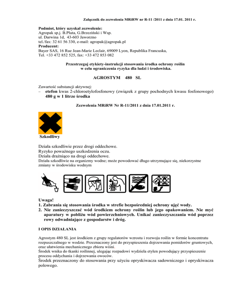 Załącznik do zezwolenia MRiRW nr R-11 /2011 z dnia 17.01. 2011 r. Podmiot, który uzyskał zezwolenie: Agropak sp.j. B.Pluta, G.Brzeziński i Wsp. ul. Darwina 1d, 43-603 Jaworzno tel./fax: 32 61 56 330, e-mail: [email protected] Producent: Bayer SAS, 16 Rue Jean-Marie Leclair, 69009 Lyon, Republika Francuska, Tel. +33 472 852 525, fax: +33 472 853 082 Przestrzegaj etykiety-instrukcji stosowania środka ochrony roślin w celu ograniczenia ryzyka dla ludzi i środowiska. AGROSTYM 480 SL Zawartość substancji aktywnej: − etefon kwas 2-chloroetylofosfonowy (związek z grupy pochodnych kwasu fosfonowego) 480 g w 1 litrze środka Zezwolenia MRiRW Nr R-11/2011 z dnia 17.01.2011 r. Szkodliwy Działa szkodliwie przez drogi oddechowe. Ryzyko poważnego uszkodzenia oczu. Działa drażniąco na drogi oddechowe. Działa szkodliwie na organizmy wodne; może powodować długo utrzymujące się, niekorzystne zmiany w środowisku wodnym Uwaga! 1. Zabrania się stosowania środka w strefie bezpośredniej ochrony ujęć wody. 2. Nie zanieczyszczać wód środkiem ochrony roślin lub jego opakowaniem. Nie myć aparatury w pobliżu wód powierzchniowych. Unikać zanieczyszczania wód poprzez rowy odwadniające z gospodarstw i dróg. I OPIS DZIAŁANIA Agrostym 480 SL jest środkiem z grupy regulatorów wzrostu i rozwoju roślin w formie koncentratu rozpuszczalnego w wodzie. Przeznaczony jest do przyspieszenia dojrzewania pomidorów gruntowych, oraz ułatwienia mechanicznego zbioru wiśni. Środek wnika do tkanki roślinnej, ulegając rozpadowi wydziela etylen powodujący przyspieszenie procesu oddychania i dojrzewania owoców. Środek przeznaczony do stosowania przy użyciu opryskiwacza sadowniczego i opryskiwacza polowego. II ZAKRES STOSOWANIA, TERMINY I DAWKI Pomidor (w gruncie). przyspieszenie dojrzewania. Zalecana dawka: 2,5-3,5 l/ha w 300-600 l wody. Wyższą z zalecanych dawek stosować w temperaturze poniżej 16 oC oraz na rośliny o dużej masie liści. Opryskiwać dokładnie całe rośliny. Stosować jednorazowo w okresie, gdy owoce dojrzałe i dojrzewające tj. czerwone, różowe i zapalone stanowią 10-20%, a owoce zielone (wyrośnięte) 50-65% ogółu owoców na roślinach. Wiśnia. ułatwienie mechanicznego zbioru. Zalecane stężenie: 0,075% (75 ml środka w 100 l wody). Zalecana ilość cieczy użytkowej: 500-700 l/ha. Środek stosować jednorazowo 7-10 dni przed przewidywanym zbiorem owoców z drzew nie opryskiwanych. UWAGI 1. Środek zastosowany na rośliny pomidora w wyższej dawce może powodować przyspieszone zamieranie liści (bez wpływu na plon). 2. Środek zastosować do 4-5 godzin przed spodziewanym deszczem. III OKRES KARENCJI okres od dnia ostatniego zabiegu do dnia zbioru roślin przeznaczonych do konsumpcji pomidor - 7 dni wiśnia - 10 dni IV OKRES PREWENCJI DLA LUDZI, ZWIERZĄT i PSZCZÓŁ okres zapobiegający zatruciu NIE DOTYCZY V SPORZĄDZANIE CIECZY UŻYTKOWEJ Przed przystąpieniem do sporządzania cieczy użytkowej dokładnie ustalić potrzebną jej ilość. Odmierzoną ilość środka wlać do zbiornika opryskiwacza napełnionego małą ilością wody, uzupełnić do potrzebnej ilości i dokładnie wymieszać. Opróżnione opakowanie przepłukać trzykrotnie wodą a popłuczyny wlać do zbiornika opryskiwacza z cieczą użytkową. Ciecz użytkową sporządzać bezpośrednio przed zabiegiem /nie przetrzymywać jej dłużej niż 5 godzin. VI PRZECHOWYWANIE Chronić przed dziećmi. Nie przechowywać razem z żywnością, napojami i paszami dla zwierząt. Przechowywać wyłącznie w oryginalnym opakowaniu w temperaturze powyżej –10oC. VII WARUNKI BEZPIECZNEGO STOSOWANIA ŚRODKA Nie wdychać rozpylonej cieczy roboczej. Unikać zanieczyszczenia oczu. Zanieczyszczone oczy przemyć natychmiast dużą ilością wody i zasięgnąć porady lekarza. Nosić okulary lub ochronę twarzy. Unikać narażenia – przed użyciem zapoznać się z instrukcją. W przypadku awarii lub jeśli źle się poczujesz, niezwłocznie zasięgnij porady lekarza (o ile to możliwe, należy pokazać etykietę). Resztki cieczy użytkowej rozcieńczyć wodą i wypryskać na powierzchni poprzednio opryskiwanej. Wodę użytą do mycia aparatury wypryskać na powierzchni uprzednio opryskiwanej, stosując te same środki ochrony osobistej. W przypadku mycia aparatury przy użyciu środków przeznaczonych do tego celu, z powstałymi popłuczynami należy postępować zgodnie z instrukcją dołączoną do środka myjącego. Opróżnione opakowania traktować jako odpady komunalne. Zabrania się spalania opakowań po środku ochrony roślin we własnym zakresie. UWAGA! ZABRANIA SIĘ WYKORZYSTYWANIA OPRÓŻNIONYCH OPAKOWAŃ PO ŚRODKACH OCHRONY ROŚLIN DO INNYCH CELÓW, W TYM TAKŻE TRAKTOWANIA ICH JAKO SUROWCE WTÓRNE. VIII ANTIDOTUM BRAK, STOSOWAĆ LECZENIE OBJAWOWE POMOC MEDYCZNA W sytuacjach, w których wymagana jest inna pomoc medyczna niż ujęta w wyżej wymienionych ostrzeżeniach, należy skontaktować się z najbliższym ośrodkiem toksykologicznym: Gdańsk Kraków Lublin Łódź Poznań – 58 682 04 04 – 12 411 99 99 – 81 740 89 83 – 42 657 99 00 – 61 847 69 46 Okres ważności Data produkcji Zawartość netto Nr partii - 2 lata - ........ - ........ - …… Rzeszów Sosnowiec Tarnów Warszawa Wrocław – 17 866 40 25 – 32 266 11 45 – 14 631 54 09 – 22 619 66 54 – 71 343 30 08
