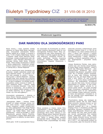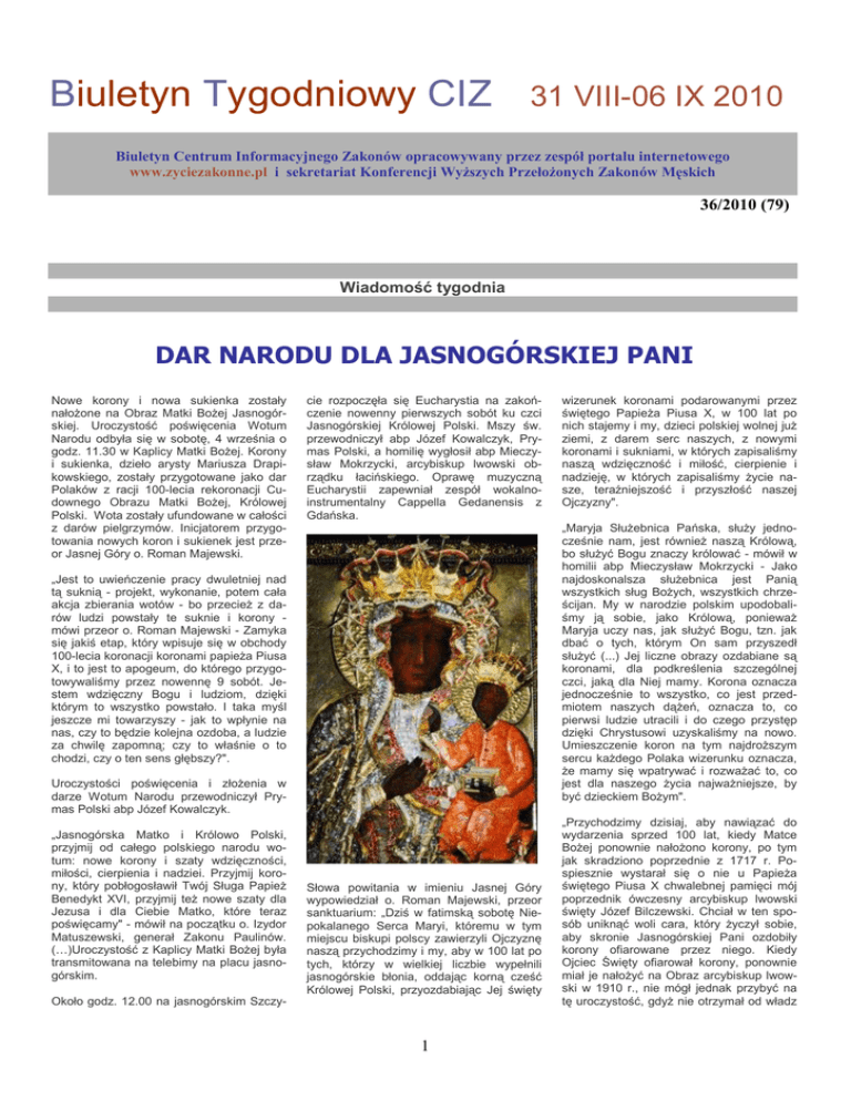 Biuletyn Tygodniowy CIZ 31 VIII-06 IX 2010 Biuletyn Centrum Informacyjnego Zakonów opracowywany przez zespół portalu internetowego www.zyciezakonne.pl i sekretariat Konferencji Wyższych Przełożonych Zakonów Męskich 36/2010 (79) Wiadomość tygodnia DAR NARODU DLA JASNOGÓRSKIEJ PANI Nowe korony i nowa sukienka zostały nałożone na Obraz Matki Bożej Jasnogórskiej. Uroczystość poświęcenia Wotum Narodu odbyła się w sobotę, 4 września o godz. 11.30 w Kaplicy Matki Bożej. Korony i sukienka, dzieło arysty Mariusza Drapikowskiego, zostały przygotowane jako dar Polaków z racji 100-lecia rekoronacji Cudownego Obrazu Matki Bożej, Królowej Polski. Wota zostały ufundowane w całości z darów pielgrzymów. Inicjatorem przygotowania nowych koron i sukienek jest przeor Jasnej Góry o. Roman Majewski. cie rozpoczęła się Eucharystia na zakończenie nowenny pierwszych sobót ku czci Jasnogórskiej Królowej Polski. Mszy św. przewodniczył abp Józef Kowalczyk, Prymas Polski, a homilię wygłosił abp Mieczysław Mokrzycki, arcybiskup lwowski obrządku łacińskiego. Oprawę muzyczną Eucharystii zapewniał zespół wokalnoinstrumentalny Cappella Gedanensis z Gdańska. „Maryja Służebnica Pańska, służy jednocześnie nam, jest również naszą Królową, bo służyć Bogu znaczy królować - mówił w homilii abp Mieczysław Mokrzycki - Jako najdoskonalsza służebnica jest Panią wszystkich sług Bożych, wszystkich chrześcijan. My w narodzie polskim upodobaliśmy ją sobie, jako Królową, ponieważ Maryja uczy nas, jak służyć Bogu, tzn. jak dbać o tych, którym On sam przyszedł służyć (...) Jej liczne obrazy ozdabiane są koronami, dla podkreślenia szczególnej czci, jaką dla Niej mamy. Korona oznacza jednocześnie to wszystko, co jest przedmiotem naszych dążeń, oznacza to, co pierwsi ludzie utracili i do czego przystęp dzięki Chrystusowi uzyskaliśmy na nowo. Umieszczenie koron na tym najdroższym sercu każdego Polaka wizerunku oznacza, że mamy się wpatrywać i rozważać to, co jest dla naszego życia najważniejsze, by być dzieckiem Bożym". „Jest to uwieńczenie pracy dwuletniej nad tą suknią - projekt, wykonanie, potem cała akcja zbierania wotów - bo przecież z darów ludzi powstały te suknie i korony mówi przeor o. Roman Majewski - Zamyka się jakiś etap, który wpisuje się w obchody 100-lecia koronacji koronami papieża Piusa X, i to jest to apogeum, do którego przygotowywaliśmy przez nowennę 9 sobót. Jestem wdzięczny Bogu i ludziom, dzięki którym to wszystko powstało. I taka myśl jeszcze mi towarzyszy - jak to wpłynie na nas, czy to będzie kolejna ozdoba, a ludzie za chwilę zapomną; czy to właśnie o to chodzi, czy o ten sens głębszy?". Uroczystości poświęcenia i złożenia w darze Wotum Narodu przewodniczył Prymas Polski abp Józef Kowalczyk. „Jasnogórska Matko i Królowo Polski, przyjmij od całego polskiego narodu wotum: nowe korony i szaty wdzięczności, miłości, cierpienia i nadziei. Przyjmij korony, który pobłogosławił Twój Sługa Papież Benedykt XVI, przyjmij też nowe szaty dla Jezusa i dla Ciebie Matko, które teraz poświęcamy" - mówił na początku o. Izydor Matuszewski, generał Zakonu Paulinów. (…)Uroczystość z Kaplicy Matki Bożej była transmitowana na telebimy na placu jasnogórskim. wizerunek koronami podarowanymi przez świętego Papieża Piusa X, w 100 lat po nich stajemy i my, dzieci polskiej wolnej już ziemi, z darem serc naszych, z nowymi koronami i sukniami, w których zapisaliśmy naszą wdzięczność i miłość, cierpienie i nadzieję, w których zapisaliśmy życie nasze, teraźniejszość i przyszłość naszej Ojczyzny". Słowa powitania w imieniu Jasnej Góry wypowiedział o. Roman Majewski, przeor sanktuarium: „Dziś w fatimską sobotę Niepokalanego Serca Maryi, któremu w tym miejscu biskupi polscy zawierzyli Ojczyznę naszą przychodzimy i my, aby w 100 lat po tych, którzy w wielkiej liczbie wypełnili jasnogórskie błonia, oddając korną cześć Królowej Polski, przyozdabiając Jej święty Około godz. 12.00 na jasnogórskim Szczy- 1 „Przychodzimy dzisiaj, aby nawiązać do wydarzenia sprzed 100 lat, kiedy Matce Bożej ponownie nałożono korony, po tym jak skradziono poprzednie z 1717 r. Pospiesznie wystarał się o nie u Papieża świętego Piusa X chwalebnej pamięci mój poprzednik ówczesny arcybiskup lwowski święty Józef Bilczewski. Chciał w ten sposób uniknąć woli cara, który życzył sobie, aby skronie Jasnogórskiej Pani ozdobiły korony ofiarowane przez niego. Kiedy Ojciec Święty ofiarował korony, ponownie miał je nałożyć na Obraz arcybiskup lwowski w 1910 r., nie mógł jednak przybyć na tę uroczystość, gdyż nie otrzymał od władz rosyjskich pozwolenia na wjazd. Udał się jednak później do Ojca Świętego, aby mu podziękować za ten wielki dar. Po powrocie do Lwowa napisał odezwę do diecezjan, która zawierała wskazania, co do pasterskich oczekiwań Papieża" - nawiązał w homilii do historii koronacji sprzed 100 lat kaznodzieja. ziemi staramy się naśladować koronując Jej obrazy i Jej statuy". Centralne uroczystości poprzedziła modlitwa na placu przed Szczytem. Wierni wysłuchali również świadectw: siostry, która ofiarowała fragment skrzydła prezydenckiego samolotu oraz pielgrzymów, którzy przekazali obrączkę do nowej sukni Matki Bożej. „Wyrażam wielką radość z tego, że w dniu dzisiejszym Pani Jasnogórska w swoim Cudownym Obrazie i Jej Syn, w Kaplicy Cudownego Obrazu doznaje szczególnej czci. Oto dzień nałożenia nowej sukni i koron na Jej czcigodny wizerunek i Jej Syna, który od stuleci cieszy się niezwykłą czcią wiernych - mówił na zakończenie abp Józef Kowalczyk - Radujemy się z tego, że wasza miłość i cześć do Matki Najświętszej odziedziczona od praojców wyrażona zostaje dziś raz jeszcze w tak uroczystej formie. Maryja otrzymuje ten widomy znak miłości