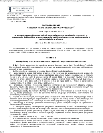 Szczegółowy tryb i warunki przeprowadzania czynności w przewodzie ... 1 z 18 https://lex.uksw.edu.pl/lex/content.rpc?reqId=1453198860654_142704... Wydruk z 2016.01.19 Dz.U.2015.1842 - Szczegółowy tryb i warunki przeprowadzania czynności w przewodzie doktorskim, w postępowaniu habilitacyjnym oraz w postępowaniu o nadanie tytułu profesora. Wersja 2015.11.25 do ... Dz.U.2015.1842 ROZPORZĄDZENIE MINISTRA NAUKI I SZKOLNICTWA WYŻSZEGO(1) z dnia 30 października 2015 r. w sprawie szczegółowego trybu i warunków przeprowadzania czynności w przewodzie doktorskim, w postępowaniu habilitacyjnym oraz w postępowaniu o nadanie tytułu profesora (Dz. U. z dnia 10 listopada 2015 r.) Na podstawie art. 31 ustawy z dnia 14 marca 2003 r. o stopniach naukowych i tytule naukowym oraz o stopniach i tytule w zakresie sztuki (Dz. U. z 2014 r. poz. 1852 oraz z 2015 r. poz. 249 i 1767) zarządza się, co następuje: Rozdział 1 Szczegółowy tryb przeprowadzania czynności w przewodzie doktorskim § 1. 1. Osoba ubiegająca się o nadanie stopnia doktora, zwana dalej "kandydatem", składa kierownikowi jednostki organizacyjnej wybranej do przeprowadzenia przewodu doktorskiego wniosek o jego wszczęcie. 2. Do wniosku o wszczęcie przewodu doktorskiego kandydat załącza: 1) poświadczoną przez jednostkę organizacyjną wybraną do przeprowadzenia przewodu doktorskiego kopię dokumentu potwierdzającego posiadanie tytułu zawodowego, o którym mowa w art. 12 ust. 1 pkt 1 ustawy z dnia 14 marca 2003 r. o stopniach naukowych i tytule naukowym oraz o stopniach i tytule w zakresie sztuki, zwanej dalej "ustawą", lub dyplomu, o którym mowa w art. 191a ust. 3 i 4 ustawy z dnia 27 lipca 2005 r. - Prawo o szkolnictwie wyższym (Dz. U. z 2012 r. poz. 572, z późn. zm.); 2) propozycję tematu i koncepcję rozprawy doktorskiej ze wskazaniem obszaru wiedzy, dziedziny nauki albo sztuki i dyscypliny naukowej albo artystycznej, w zakresie których ma być otwarty przewód doktorski, oraz dyscypliny dodatkowej; 3) propozycję osoby do pełnienia funkcji promotora, a w przypadkach, o których mowa w § 2 ust. 2, także propozycję osób do pełnienia funkcji drugiego promotora, kopromotora lub promotora pomocniczego; 4) wykaz prac naukowych, twórczych prac zawodowych albo dorobku artystycznego wraz z zapisem dzieł artystycznych odpowiednim ze względu na rodzaj dzieła i dokumentacją ich publicznej prezentacji oraz informację o działalności popularyzującej naukę lub sztukę; 5) informację o przebiegu przewodu doktorskiego, jeżeli kandydat ubiegał się uprzednio o nadanie stopnia doktora. 3. Kandydat będący beneficjentem programu "Diamentowy Grant" ustanowionego przez ministra właściwego do spraw nauki załącza do wniosku o wszczęcie przewodu doktorskiego: 1) poświadczoną przez jednostkę organizacyjną wybraną do przeprowadzenia przewodu doktorskiego kopię dokumentu potwierdzającego uzyskanie statusu beneficjenta programu "Diamentowy Grant"; 2) opinię, o której mowa w art. 11 ust. 3 ustawy. 4. Kandydat może załączyć do wniosku o wszczęcie przewodu doktorskiego: 1) poświadczoną przez jednostkę organizacyjną wybraną do przeprowadzenia przewodu doktorskiego kopię certyfikatu potwierdzającego znajomość nowożytnego języka obcego; wykaz certyfikatów potwierdzających znajomość nowożytnego języka obcego stanowi załącznik nr 1 do rozporządzenia; 2016-01-19 11:23 Szczegółowy tryb i warunki przeprowadzania czynności w przewodzie ... 2 z 18 https://lex.uksw.edu.pl/lex/content.rpc?reqId=1453198860654_142704... 2) wniosek o wyrażenie zgody na przedstawienie rozprawy doktorskiej w innym języku niż język polski. 5. W przypadku przewodu doktorskiego przeprowadzanego wspólnie, zgodnie z art. 14a ust. 1 ustawy, zwanego dalej "wspólnym przewodem doktorskim", dokumenty wymienione w ust. 1-4 oraz inne dokumenty wymienione w porozumieniu, o którym mowa w art. 14a ust. 2 ustawy, kandydat przedkłada kierownikowi jednostki organizacyjnej wskazanej w porozumieniu. § 2. 1. Po wszczęciu przewodu doktorskiego rada jednostki organizacyjnej przeprowadzającej przewód doktorski wyznacza promotora w celu sprawowania opieki naukowej nad kandydatem. 2. Rada jednostki organizacyjnej przeprowadzającej przewód doktorski może dodatkowo wyznaczyć: 1) drugiego promotora - w przypadku interdyscyplinarnej rozprawy doktorskiej; 2) kopromotora - w przypadku przewodu doktorskiego przeprowadzanego w ramach współpracy międzynarodowej; 3) promotora pomocniczego - w przypadku potrzeby przydzielenia promotorowi osoby do pomocy w sprawowaniu opieki naukowej nad kandydatem. 3. Rada jednostki organizacyjnej przeprowadzającej przewód doktorski określa maksymalną liczbę kandydatów, nad którymi promotor lub promotor pomocniczy mogą sprawować opiekę naukową w jednym czasie. § 3. 1. Rada jednostki organizacyjnej przeprowadzającej przewód doktorski: powołuje komisje przeprowadzające egzaminy doktorskie w zakresie: a) dyscypliny podstawowej odpowiadającej tematowi rozprawy doktorskiej - w składzie co najmniej czterech osób posiadających tytuł profesora w zakresie dziedziny nauki albo sztuki, do której należy ta dyscyplina naukowa albo artystyczna, lub stopień doktora habilitowanego w zakresie tej dyscypliny naukowej albo artystycznej albo osób, które nabyły uprawnienia równoważne uprawnieniom wynikającym z posiadania stopnia doktora habilitowanego na podstawie art. 21a ustawy i prowadzą działalność naukową lub dydaktyczną w zakresie tej dyscypliny naukowej albo artystycznej, w tym promotora, drugiego promotora lub kopromotora, b) dyscypliny dodatkowej - w składzie co najmniej trzech osób, z których co najmniej jedna posiada tytuł profesora w zakresie dziedziny nauki albo sztuki, do której należy ta dyscyplina naukowa albo artystyczna, albo stopień doktora habilitowanego w zakresie tej dyscypliny naukowej albo artystycznej, albo nabyła uprawnienia równoważne upraw
