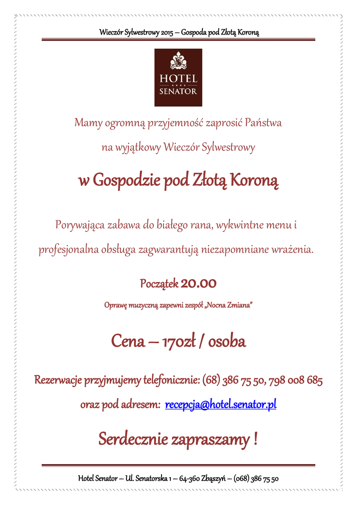 Wieczór Sylwestrowy 2015 – Gospoda pod Złotą Koroną Mamy ogromną przyjemność zaprosić Państwa na wyjątkowy Wieczór Sylwestrowy w Gospodzie pod Złotą Koroną Porywająca zabawa do białego rana, wykwintne menu i profesjonalna obsługa zagwarantują niezapomniane wrażenia. Początek 20.00 Oprawę muzyczną zapewni zespół „Nocna Zmiana” Cena – 170zł / osoba Rezerwacje przyjmujemy telefonicznie: (68) 386 75 50, 798 008 685 oraz pod adresem: [email protected] Serdecznie zapraszamy ! Hotel Senator – Ul. Senatorska 1 – 64-360 Zbąszyń – (068) 386 75 50 Wieczór Sylwestrowy 2015 – Gospoda pod Złotą Koroną Szef kuchni poleca: PRZYSTAWKA Pasztecik z pieczonej kaczki z żurawinową konfiturą ZUPA Krem z białych warzyw z oliwą truflową DANIE GŁÓWNE Polędwiczka wieprzowa podana z sosem kurkowym, ziemniaczkami puree, groszkiem cukrowym i pomidorkiem cherry DESER Ciasto, kawa, herbata ok 22.00 PÓŁMISKI ZIMNE: Śledź na dwa smaki: -w oliwie z oliwek z kaparami i pomidorem suszonym, -w śmietanie. Galacik, półmiski wędlin, mięs pieczonych ,serów… Sałatka grecka, sałatka jarzynowa, ciepłe bułeczki, masełko… Hotel Senator – Ul. Senatorska 1 – 64-360 Zbąszyń – (068) 386 75 50 Wieczór Sylwestrowy 2015 – Gospoda pod Złotą Koroną ok 23:00 DANIA CIEPŁE Bigos staropolski, szaszłyk drobiowy, klopsiki z golonki… ok 1:30 Barszcz z pasztecikiem… Dodatkowo Sok/woda z miętą i cytryną - 0.3l na osobę Kawa/herbata Szampan o północy dla każdego stolika Alkohol po specjalnych cenach do nabycia w barze. Korkowe 10zł. Zachęcamy do skorzystania z noclegu koszt pokoju dla dwóch osób ze śniadaniem noworocznym w cenie 170 zł Hotel Senator – Ul. Senatorska 1 – 64-360 Zbąszyń – (068) 386 75 50