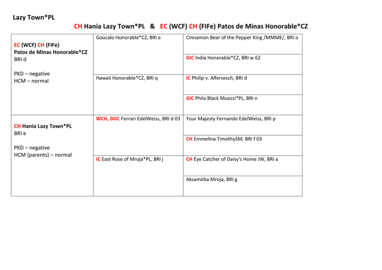 Lazy Town*PL CH Hania Lazy Town*PL & EC (WCF) CH (FIFe) Patos de Minas Honorable*CZ Goucalo Honorable*CZ, BRI e EC (WCF) CH (FIFe) Patos de Minas Honorable*CZ BRI d PKD – negative HCM – normal Cinnamon Bear of the Pepper King /MMME/, BRI o GIC India Honorable*CZ, BRI w 62 Hawaii Honorable*CZ, BRI q IC Philip v. Alfersesch, BRI d GIC Phila Black Muezzi*PL, BRI n WCH, DGC Ferrari EdelWeiss, BRI d 03 CH Hania Lazy Town*PL BRI e PKD – negative HCM (parents) – normal Your Majesty Fernando EdelWeiss, BRI p CH Emmelina TimothySM, BRI f 03 IC East Rose of Mroja*PL, BRI j CH Eye Catcher of Daisy's Home JW, BRI a Aksamitka Mroja, BRI g