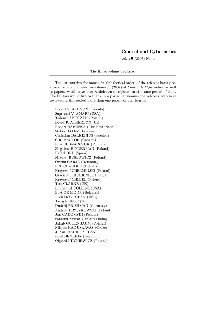 Control and Cybernetics vol. 36 (2007) No. 4 The list of volume’s referees The list contains the names, in alphabetical order, of the referees having reviewed papers published in volume 36 (2007) of Control & Cybernetics, as well as papers, which have been withdrawn or rejected in the same period of time. The Editors would like to thank in a particular manner the referees, who have reviewed in this period more than one paper for our Journal. Robert S. ALLISON (Canada) Suprasad V. AMARI (USA) Tadeusz ANTCZAK (Poland) Derek P. ATHERTON (UK) Robert BABUSKA (The Netherlands) Stefan BALEV (France) Christian BALKENIUS (Sweden) C.R. BECTOR (Canada) Ewa BEDNARCZUK (Poland) Zbigniew BINDERMAN (Poland) Rafael BRU (Spain) Mikołaj BUSŁOWICZ (Poland) Ovidiu ČARJA (Romania) K.S. CHAUDHURI (India) Krzysztof CHEŁMIŃSKI (Poland) Graciela CHICHILNISKY (USA) Krzysztof CHMIEL (Poland) Tim CLARKE (UK) Emmanuel COLLINS (USA) Bart DE MOOR (Belgium) Asen DONTCHEV (USA) Joerg FLIEGE (UK) Dmitrij FRISHMAN (Germany) Andrzej FRYSZKOWSKI (Poland) Jan GADOMSKI (Poland) Santanu Kumar GHOSH (India) Jakub GUTENBAUM (Poland) Nikolas HADJISAAVAS (Grece) J. Karl HEDRICK (USA) René HENRION (Germany) Olgierd HRYNIEWICZ (Poland) 1068 Alexander IOFFE (Israel) Adam JANIAK (Poland) Andrzej JASZKIEWICZ (Poland) Bienvenido JIMENEZ (Spain) Abderrahim JOURANI (France) Jon JUNEAU (USA) Ignacy KALISZEWSKI (Poland) Janusz KARPIŃSKI (Poland) Jerzy KLAMKA (Poland) Diethard KLATTE (Switzerland) Krzysztof KOŁOWROCKI (Poland) Ewa KONARZEWSKA-GUBAŁA (Poland) Igor V. KONNOV (Russia) Jacek KORONACKI (Poland) Adam KORYTOWSKI (Poland) Wiesław KRAJEWSKI (Poland) Lech KRUŚ (Poland) Wojciech KRYSZEWSKI (Poland) Mikuláš LUPTÁČIK (Austria) Helmut MAURER (Germany) Stanisław MIGÓRSKI (Poland) Boris MORDUKHOVICH (USA) Matthias MÜLLER-HANNEMANN (Germany) Zbigniew NAHORSKI (Poland) Zdzisław NANIEWICZ (Poland) Jarosław NAPIÓRKOWSKI (Poland) Wojciech NIEMIRO (Poland) Jiri OUTRATA (Czechia) T.J. OWENS (UK) Jan W. OWSIŃSKI (Poland) Nikolaos PAPAGEORGIOU (Greece) Siegmund PASTOOR (Germany) Hans J.M. PETERS (The Netherlands) Boris POLYAK (Russia) Bart PRENEEL (Belgium) Danuta PRZEWORSKA-ROLEWICZ (Poland) Jean-Pierre RAYMOND (France) Julian REVALSKI (France / Bulgaria) R. Russell RHINEHART (USA) Stefan ROLEWICZ (Poland) Maciej ROMANIUK (Poland) Heinz Michael SCHAETTLER (USA) Arunava SEN (India) Paulo Jorge SEQUEIRA GONÇALVES (Portugal) The list of volume’s referees The list of volume’s referees Hanif D. SHERALI (USA) Andrzej M.J. SKULIMOWSKI (Poland) Mihail V. SOLODOV (Brazil) Jarosław STEPANIUK (Poland) Marcin STUDNIARSKI (Poland) Lionel THIBAULT (France) James R. THOMPSON (USA) Eugeniusz TOCZYŁOWSKI (Poland) Fredi TROELTZSCH (Germany) Tadeusz TRZASKALIK (Poland) Mi-ching TSAI (Taiwan) Marian TURZAŃSKI (Poland) Bart VANLUYTEN (Belgium) Robert J. VEILLETTE (USA) Norbert WECK (Germany) Petra WEIDNER (Germany) W.M. WONHAM (Canada) Dariusz ZAGRODNY (Poland) PierLuigi ZEZZA (Italy) 1069