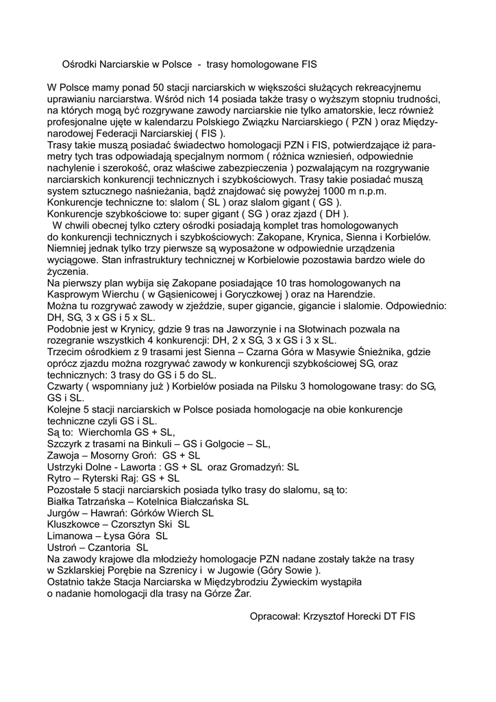 Ośrodki Narciarskie w Polsce - trasy homologowane FIS W Polsce mamy ponad 50 stacji narciarskich w większości służących rekreacyjnemu uprawianiu narciarstwa. Wśród nich 14 posiada także trasy o wyższym stopniu trudności, na których mogą być rozgrywane zawody narciarskie nie tylko amatorskie, lecz również profesjonalne ujęte w kalendarzu Polskiego Związku Narciarskiego ( PZN ) oraz Międzynarodowej Federacji Narciarskiej ( FIS ). Trasy takie muszą posiadać świadectwo homologacji PZN i FIS, potwierdzające iż parametry tych tras odpowiadają specjalnym normom ( różnica wzniesień, odpowiednie nachylenie i szerokość, oraz właściwe zabezpieczenia ) pozwalającym na rozgrywanie narciarskich konkurencji technicznych i szybkościowych. Trasy takie posiadać muszą system sztucznego naśnieżania, bądź znajdować się powyżej 1000 m n.p.m. Konkurencje techniczne to: slalom ( SL ) oraz slalom gigant ( GS ). Konkurencje szybkościowe to: super gigant ( SG ) oraz zjazd ( DH ). W chwili obecnej tylko cztery ośrodki posiadają komplet tras homologowanych do konkurencji technicznych i szybkościowych: Zakopane, Krynica, Sienna i Korbielów. Niemniej jednak tylko trzy pierwsze są wyposażone w odpowiednie urządzenia wyciągowe. Stan infrastruktury technicznej w Korbielowie pozostawia bardzo wiele do życzenia. Na pierwszy plan wybija się Zakopane posiadające 10 tras homologowanych na Kasprowym Wierchu ( w Gąsienicowej i Goryczkowej ) oraz na Harendzie. Można tu rozgrywać zawody w zjeździe, super gigancie, gigancie i slalomie. Odpowiednio: DH, SG, 3 x GS i 5 x SL. Podobnie jest w Krynicy, gdzie 9 tras na Jaworzynie i na Słotwinach pozwala na rozegranie wszystkich 4 konkurencji: DH, 2 x SG, 3 x GS i 3 x SL. Trzecim ośrodkiem z 9 trasami jest Sienna – Czarna Góra w Masywie Śnieżnika, gdzie oprócz zjazdu można rozgrywać zawody w konkurencji szybkościowej SG, oraz technicznych: 3 trasy do GS i 5 do SL. Czwarty ( wspomniany już ) Korbielów posiada na Pilsku 3 homologowane trasy: do SG, GS i SL. Kolejne 5 stacji narciarskich w Polsce posiada homologacje na obie konkurencje techniczne czyli GS i SL. Są to: Wierchomla GS + SL, Szczyrk z trasami na Binkuli – GS i Golgocie – SL, Zawoja – Mosorny Groń: GS + SL Ustrzyki Dolne - Laworta : GS + SL oraz Gromadzyń: SL Rytro – Ryterski Raj: GS + SL Pozostałe 5 stacji narciarskich posiada tylko trasy do slalomu, są to: Białka Tatrzańska – Kotelnica Białczańska SL Jurgów – Hawrań: Górków Wierch SL Kluszkowce – Czorsztyn Ski SL Limanowa – Łysa Góra SL Ustroń – Czantoria SL Na zawody krajowe dla młodzieży homologacje PZN nadane zostały także na trasy w Szklarskiej Porębie na Szrenicy i w Jugowie (Góry Sowie ). Ostatnio także Stacja Narciarska w Międzybrodziu Żywieckim wystąpiła o nadanie homologacji dla trasy na Górze Żar. Opracował: Krzysztof Horecki DT FIS