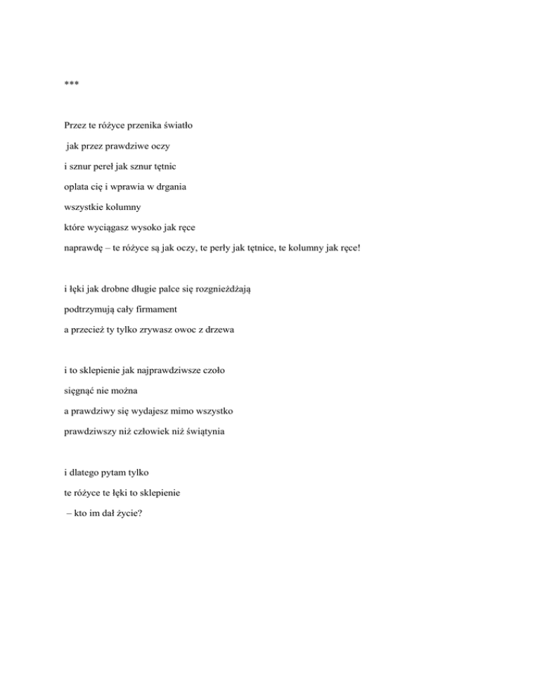 *** Przez te różyce przenika światło jak przez prawdziwe oczy i sznur pereł jak sznur tętnic oplata cię i wprawia w drgania wszystkie kolumny które wyciągasz wysoko jak ręce naprawdę – te różyce są jak oczy, te perły jak tętnice, te kolumny jak ręce! i łęki jak drobne długie palce się rozgnieżdżają podtrzymują cały firmament a przecież ty tylko zrywasz owoc z drzewa i to sklepienie jak najprawdziwsze czoło sięgnąć nie można a prawdziwy się wydajesz mimo wszystko prawdziwszy niż człowiek niż świątynia i dlatego pytam tylko te różyce te łęki to sklepienie – kto im dał życie? Bogna Hołyńska *** drzewo mojej duszy całe w pąkach bezdomny kot zraniony księżyc uwieszony gałęzi ptaki ich gniazda pszczoły osiadają na moich ustach i wiatr nawet Bóg przybija swoje dłonie do gałęzi Bogna Hołyńska *** -nie jestem zwykłym kawałkiem drewna i sznurka uszyj z mojej skóry płaszcz na zimę z moich skrzydeł ugotuj zupę wyciśnij ze mnie ostatnie mleko oddaj mnie głodnemu niech jak wszystkie łzy pęknę w ustach Boga Bogna Hołyńska drzewo Spójrz z tej rany wyrosła gałąź siadają na niej ptaki one widzą tylko tę gałąź i niebo bez strachu dotykają moich dłoni jak liści Myślą że to tylko wiatr tak wyje a to Ty Boże wysłałeś na mnie samą bestię by z moich kolejnych ran wyrosły kolejne gałęzie Bogna Hołyńska *** Byłam dziś nocą zrzuciłam kota z księżyca byłam kotem piłam mleko z twoich złączonych dłoni Później stałam się gniazdem broniłam piskląt przed kotem którym byłam wcześniej Byłam też wściekłym psem który rozszarpał tego kota I tak zostałam kamieniem czy wiesz że te kamienie które teraz depczemy kiedyś miały dusze?