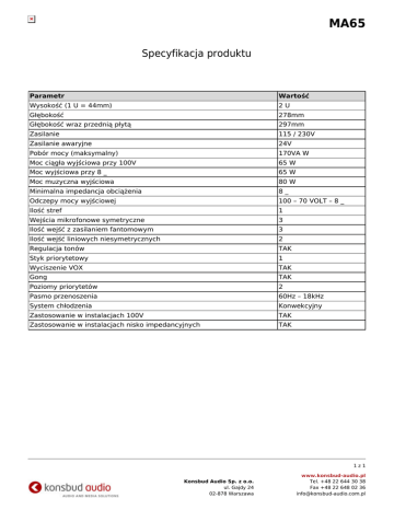MA65 Specyfikacja produktu Parametr Wartość Wysokość (1 U = 44mm) 2U Głębokość 278mm Głębokość wraz przednią płytą 297mm Zasilanie 115 / 230V Zasilanie awaryjne 24V Pobór mocy (maksymalny) 170VA W Moc ciągła wyjściowa przy 100V 65 W Moc wyjściowa przy 8 _ 65 W Moc muzyczna wyjściowa 80 W Minimalna impedancja obciążenia 8_ Odczepy mocy wyjściowej 100 – 70 VOLT – 8 _ Ilość stref 1 Wejścia mikrofonowe symetryczne 3 Ilość wejść z zasilaniem fantomowym 3 Ilość wejść liniowych niesymetrycznych 2 Regulacja tonów TAK Styk priorytetowy 1 Wyciszenie VOX TAK Gong TAK Poziomy priorytetów 2 Pasmo przenoszenia 60Hz – 18kHz System chłodzenia Konwekcyjny Zastosowanie w instalacjach 100V TAK Zastosowanie w instalacjach nisko impedancyjnych TAK 1z1 Konsbud Audio Sp. z o.o. ul. Gajdy 24 02-878 Warszawa www.konsbud-audio.pl Tel. +48 22 644 30 38 Fax +48 22 648 02 36 [email protected]