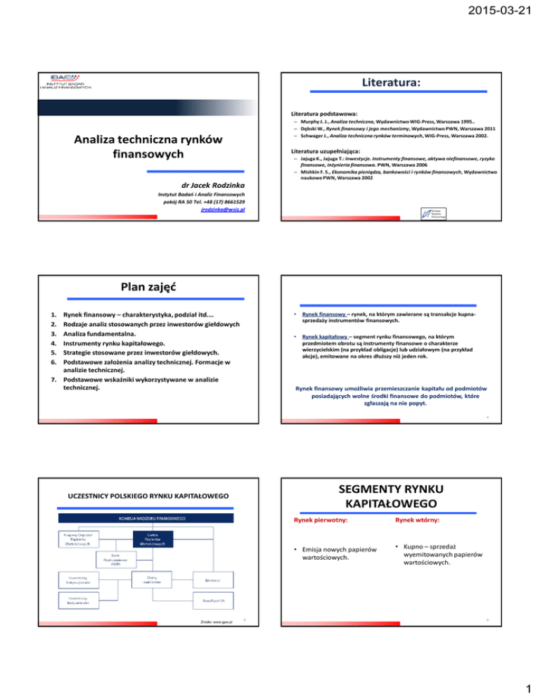 2015-03-21 Literatura: • Literatura podstawowa: – Murphy J. J., Analiza techniczna, Wydawnictwo WIG-Press, Warszawa 1995.. – Dębski W., Rynek finansowy i jego mechanizmy, Wydawnictwo PWN, Warszawa 2011 – Schwager J., Analiza techniczna rynków terminowych, WIG-Press, Warszawa 2002. Analiza techniczna rynków finansowych • Literatura uzupełniająca: – Jajuga K., Jajuga T.: Inwestycje. Instrumenty finansowe, aktywa niefinansowe, ryzyko finansowe, inżynieria finansowa. PWN, Warszawa 2006 – Mishkin F. S., Ekonomika pieniądza, bankowości i rynków finansowych, Wydawnictwo naukowe PWN, Warszawa 2002 dr Jacek Rodzinka Instytut Badań i Analiz Finansowych pokój RA 50 Tel. +48 (17) 8661529 [email protected] Plan zajęć 1. 2. 3. 4. 5. 6. Rynek finansowy – charakterystyka, podział itd.… Rodzaje analiz stosowanych przez inwestorów giełdowych Analiza fundamentalna. Instrumenty rynku kapitałowego. Strategie stosowane przez inwestorów giełdowych. Podstawowe założenia analizy technicznej. Formacje w analizie technicznej. 7. Podstawowe wskaźniki wykorzystywane w analizie technicznej. • Rynek finansowy – rynek, na którym zawierane są transakcje kupnasprzedaży instrumentów finansowych. • Rynek kapitałowy – segment rynku finansowego, na którym przedmiotem obrotu są instrumenty finansowe o charakterze wierzycielskim (na przykład obligacje) lub udziałowym (na przykład akcje), emitowane na okres dłuższy niż jeden rok. Rynek finansowy umożliwia przemieszczanie kapitału od podmiotów posiadających wolne środki finansowe do podmiotów, które zgłaszają na nie popyt. 4 SEGMENTY RYNKU KAPITAŁOWEGO UCZESTNICY POLSKIEGO RYNKU KAPITAŁOWEGO Źródło: www.gpw.pl 5 Rynek pierwotny: Rynek wtórny: • Emisja nowych papierów wartościowych. • Kupno – sprzedaż wyemitowanych papierów wartościowych. 6 1