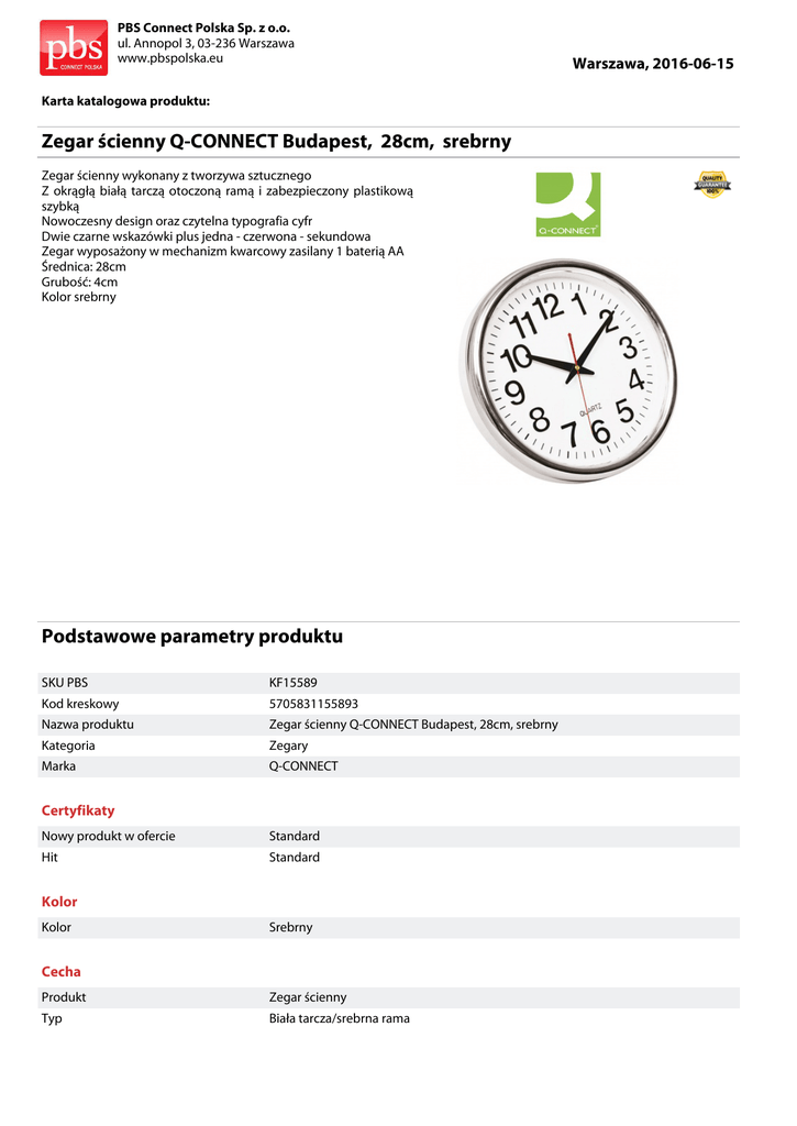 PBS Connect Polska Sp. z o.o. ul. Annopol 3, 03-236 Warszawa www.pbspolska.eu Karta katalogowa produktu: Zegar ścienny Q-CONNECT Budapest, 28cm, srebrny Zegar ścienny wykonany z tworzywa sztucznego Z okrągłą białą tarczą otoczoną ramą i zabezpieczony plastikową szybką Nowoczesny design oraz czytelna typografia cyfr Dwie czarne wskazówki plus jedna - czerwona - sekundowa Zegar wyposażony w mechanizm kwarcowy zasilany 1 baterią AA Średnica: 28cm Grubość: 4cm Kolor srebrny Podstawowe parametry produktu SKU PBS KF15589 Kod kreskowy 5705831155893 Nazwa produktu Zegar ścienny Q-CONNECT Budapest, 28cm, srebrny Kategoria Zegary Marka Q-CONNECT Certyfikaty Nowy produkt w ofercie Standard Hit Standard Kolor Kolor Srebrny Cecha Produkt Zegar ścienny Typ Biała tarcza/srebrna rama Warszawa, 2016-06-15 PBS Connect Polska Sp. z o.o. ul. Annopol 3, 03-236 Warszawa www.pbspolska.eu Karta katalogowa produktu cd. Zegar ścienny Q-CONNECT Budapest, 28cm, srebrny Podstawowe parametry produktu Rodzaj Mech. kwarc Materiał Plastik W ofercie od 2013-04 Wymiary Rozmiar Śr 28cm Wspólny słownik zamówień CPV 39254120-4 Wyposażenie domowe Jednostki logistyczne Opakowanie 1 10 szt Warszawa, 2016-06-15