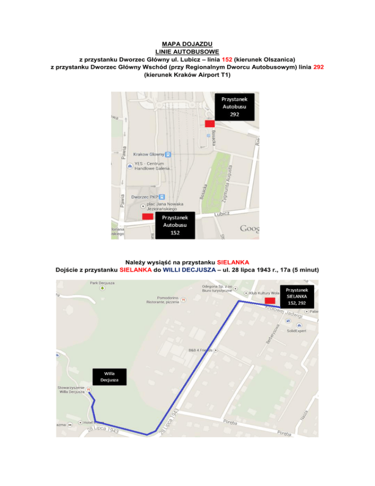 MAPA DOJAZDU LINIE AUTOBUSOWE z przystanku Dworzec Główny ul. Lubicz – linia 152 (kierunek Olszanica) z przystanku Dworzec Główny Wschód (przy Regionalnym Dworcu Autobusowym) linia 292 (kierunek Kraków Airport T1) Należy wysiąść na przystanku SIELANKA Dojście z przystanku SIELANKA do WILLI DECJUSZA – ul. 28 lipca 1943 r., 17a (5 minut)