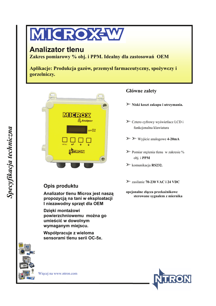 Analizator tlenu Zakres pomiarowy % obj. i PPM. Idealny dla zastosowań OEM Aplikacje: Produkcja gazów, przemysł farmaceutyczny, spożywczy i gorzelniczy. Główne zalety ➣ Niski koszt zakupu i utrzymania. Specyfikacja techniczna ➣ Cztero cyfrowy wyświetlacz LCD i funkcjonalna klawiatura ➣ ➣ Wyjście analogowe 4-20mA ➣ Pomiar stężenia tlenu w zakresie % obj. i PPM ➣ komunikacja RS232. Opis produktu Analizator tlenu Microx jest naszą propozycją na tani w eksploatacji I niezawodny sprzęt dla OEM Dzięki montażowi powierzchniowemu można go umieścić w dowolnym wymaganym miejscu. Współpracuje z wieloma sensorami tlenu serii OC-5x. Więcej na www.ntron.com ➣ zasilanie 70-230 VAC i 24 VDC opcjonalne złącza przekaźnikowe sterowane sygnałem z miernika Specyfikacja techniczna 145 mm(W) x 110 mm(Sz) x 93 mm (G) Wymiary: Waga: około180 gr. Mierzony gaz: Tlen Zakres pomiaru: 0-1%, 0-10%, 0-25% lub 0-100% Tlenu. Czas odpowiedzi T 90: 12 s Rozdzielczość: 0.1%. Zasilanie: 85 do 264 VAC lub 24 VDC +/- 10%. (160mA) Wyświetlacz: 100 x 33 punkt. Klawiatura: 4 przyciski COMMUNICATIONS: RS 232 bi-directional. Wyjście analogowe: 4-20 mA zasilane pętlą prądową. Liniowość +/- 1%. opcjonalnie. Opcjonalne wyjście cyfrowe: 2 Format wyświetlania: %, Zakres temperatur: 1-5 VDC 5 Amp. - Użycie -5 to + 40°C. - przechowywanie -20 to +50°C. Stopień ochrony: Różne stopnie IP, w zależności od wymagań Certyfikaty:: CE EN61000-6-4; EN61000-6-2; EN55022; *EN61000-3-3; *EN61000-3-2. (*Wersja AC) Zawó 4-20mA/RS232 Sensor OC-5X Proces Flowmeter zasilanie zawór Microx-W Typowa aplikacja Biuro w Irlandii Mullaghboy Industrial Park, Navan, Co Meath, Ireland. Biuro w Wielkiej Brytanii Dallam Court, Dallam Lane, Warrington, WA2 7LT. United Kingdom. Telephone +353 46 9071333 Fax: +353 46 9071331 Telephone +44 (161) 9308690 Fax +44 (161) 9308691 E-mail: [email protected] Web: www.ntron.com E-mail: [email protected] Web: www.ntron.com PSP-Microx-W-001-09 System kontrolny