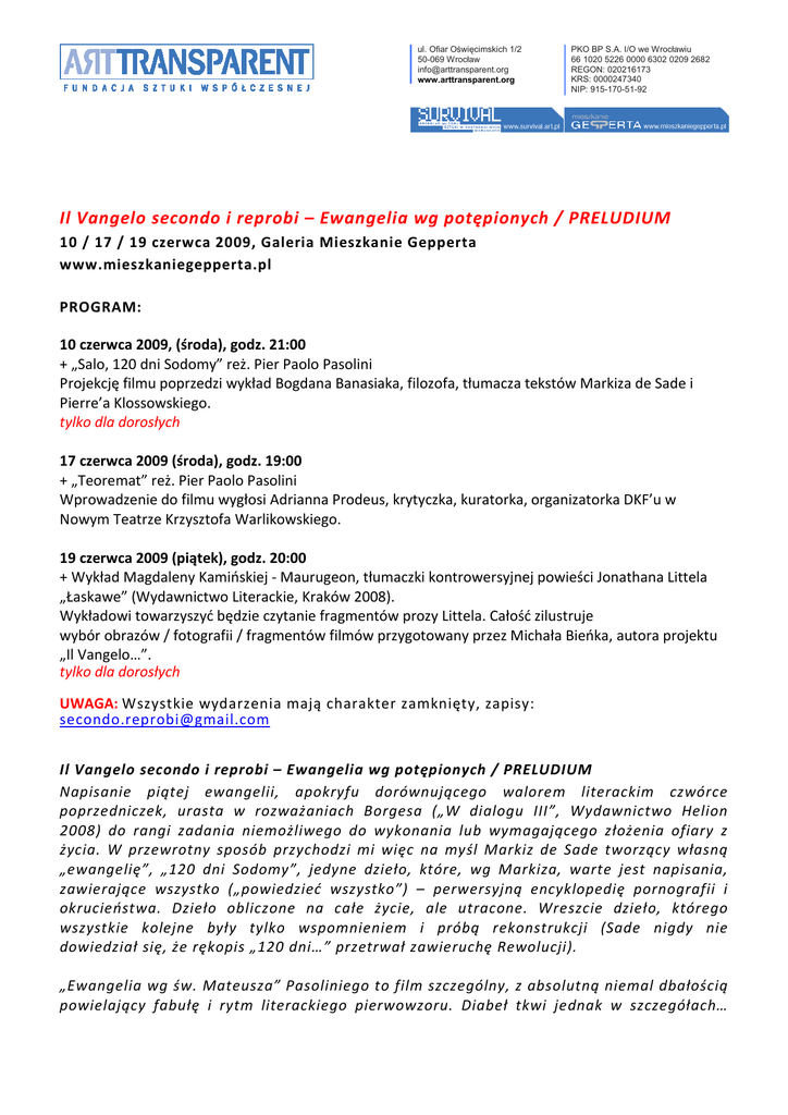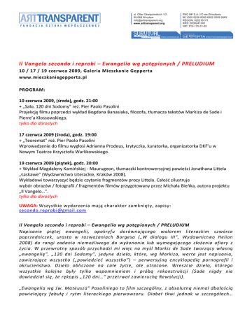 ul. Ofiar Oświęcimskich 1/2 50-069 Wrocław [email protected] www.arttransparent.org PKO BP S.A. I/O we Wrocławiu 66 1020 5226 0000 6302 0209 2682 REGON: 020216173 KRS: 0000247340 NIP: 915-170-51-92 Il Vangelo secondo i reprobi – Ewangelia wg potępionych / PRELUDIUM 10 / 17 / 19 czerwca 2009, Galeria Mieszkanie Gepperta www.mieszkaniegepperta.pl PROGRAM: 10 czerwca 2009, (środa), godz. 21:00 + „Salo, 120 dni Sodomy” reż. Pier Paolo Pasolini Projekcję filmu poprzedzi wykład Bogdana Banasiaka, filozofa, tłumacza tekstów Markiza de Sade i Pierre’a Klossowskiego. tylko dla dorosłych 17 czerwca 2009 (środa), godz. 19:00 + „Teoremat” reż. Pier Paolo Pasolini Wprowadzenie do filmu wygłosi Adrianna Prodeus, krytyczka, kuratorka, organizatorka DKF’u w Nowym Teatrze Krzysztofa Warlikowskiego. 19 czerwca 2009 (piątek), godz. 20:00 + Wykład Magdaleny Kamińskiej - Maurugeon, tłumaczki kontrowersyjnej powieści Jonathana Littela „Łaskawe” (Wydawnictwo Literackie, Kraków 2008). Wykładowi towarzyszyć będzie czytanie fragmentów prozy Littela. Całość zilustruje wybór obrazów / fotografii / fragmentów filmów przygotowany przez Michała Bieńka, autora projektu „Il Vangelo…”. tylko dla dorosłych UWAGA: Wszystkie wydarzenia mają charakter zamknięty, zapisy: [email protected] Il Vangelo secondo i reprobi – Ewangelia wg potępionych / PRELUDIUM Napisanie piątej ewangelii, apokryfu dorównującego walorem literackim czwórce poprzedniczek, urasta w rozważaniach Borgesa („W dialogu III”, Wydawnictwo Helion 2008) do rangi zadania niemożliwego do wykonania lub wymagającego złożenia ofiary z życia. W przewrotny sposób przychodzi mi więc na myśl Markiz de Sade tworzący własną „ewangelię”, „120 dni Sodomy”, jedyne dzieło, które, wg Markiza, warte jest napisania, zawierające wszystko („powiedzieć wszystko”) – perwersyjną encyklopedię pornografii i okrucieństwa. Dzieło obliczone na całe życie, ale utracone. Wreszcie dzieło, którego wszystkie kolejne były tylko wspomnieniem i próbą rekonstrukcji (Sade nigdy nie dowiedział się, że rękopis „120 dni…” przetrwał zawieruchę Rewolucji). „Ewangelia wg św. Mateusza” Pasoliniego to film szczególny, z absolutną niemal dbałością powielający fabułę i rytm literackiego pierwowzoru. Diabeł tkwi jednak w szczegółach… ul. Ofiar Oświęcimskich 1/2 50-069 Wrocław [email protected] www.arttransparent.org PKO BP S.A. I/O we Wrocławiu 66 1020 5226 0000 6302 0209 2682 REGON: 020216173 KRS: 0000247340 NIP: 915-170-51-92 Naturszczycy obsadzeni w rolach apostołów, Susanna Pasolini, matka reżysera, jako Madonna, wreszcie orientacja seksualna twórcy i kontekst jego burzliwego – w sensie obyczajowym i politycznym – życiorysu. To wszystko czyni film… obrazoburczym? Być może po prostu intymnym. Nieznośnie szczerym. To bardzo prywatna ewangelia. Jej ciąg dalszy to „Teoremat”, film, którego przepełnionej ambiwalencją magii uległ Watykan. Euforycznie, pełne zachwytu recenzje katolickich krytyków oraz, niemal po chwili, umieszczenie filmu na indeksie to najlepszy tego dowód. Jak w noweli filmowej „Twaróg”: świat produkcji filmowej, blichtru i papparazzi splata się z religijnym, ikonograficznym tłem. Tej wybuchowej miksturze pikanterii dodaje ówczesna sytuacja społeczno-polityczna. To wszystko składa się na obraz wymykający się jednoznacznej interpretacji, tajemniczy, metafizyczny. I wreszcie Littel: zagadka. Precyzyjny jak Borges, rozwlekły niczym Biblia. Twórca Potwornej Księgi, w której wątki i myśli splatają w misterną, koronkową całość. Księgi z wysiłkiem przemyślanej, wycyzelowanej: to projekt stworzony przez zwyczajnie potwornego człowieka. Jak design Holocaustu udoskonalany i pieczołowicie dokumentowany przez bohatera i narratora powieści. Samonapędzająca się maszyna. Logika szaleństwa i perwersji. Przerażająca prawda rozebrana z odrętwiającej, konwencjonalnej moralności. „Ewangelia wg potępionych” do historia sprzeniewierzenia i odrzucenia. Historia upadku. To wreszcie gra odwróconych znaczeń i spojrzenie rzucone w otchłań. Pasja, która odbiera niewinność. Michał Bieniek