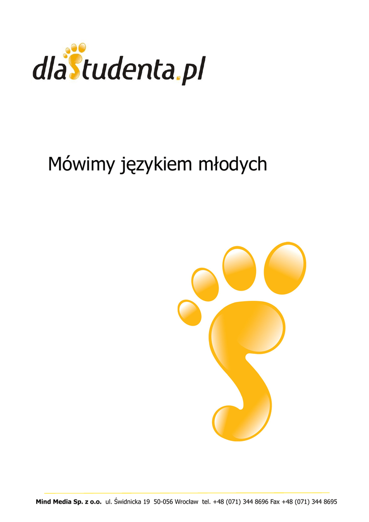 Mówimy językiem młodych Mind Media Sp. z o.o. ul. Świdnicka 19 50-056 Wrocław tel. +48 (071) 344 8696 Fax +48 (071) 344 8695 dla tudenta, dlaMaturzy ty, miejsca wyjątkowych ludzi ■ Informacje przygotowane z myślą o nowych użytkownikach ■ spis uczelni z opisami kierunków ■ testy egzaminacyjne dla maturzystów ■ porady specjalistów ■ stancje ■ praca ■ imprezy i wydarzenia kulturalne ■ Wysokie pozycjonowanie Google ■ Monitoring satysfakcji użytkowników ■ Stały wzrost liczby użytkowników ■ Unikalna tożsamość Dlaczego jesteśmy wyjątkowi? Portale tworzone przez młodych. dla młodych Mind Media Sp. z o.o. ul. Świdnicka 19 50-056 Wrocław tel. +48 (071) 344 8696 Fax +48 (071) 344 8695 dlaMaturzy ty, to: ■ Kompleksowy informator ■ uczelnie ■ szkoły policealne ■ szkoły językowe ■ kursy przygotowawcze ■ testy maturalne ■ porady ekspertów ■ Pełna interaktywność ■ Elastyczne kształtowanie promocji ■ Różnorodne formy reklamy ■ banner ■ skyscraper ■ button ■ watermark ■ konkursy ■ serwisy sponsorowane Mind Media Sp. z o.o. ul. Świdnicka 19 50-056 Wrocław tel. +48 (071) 344 8696 Fax +48 (071) 344 8695 Zaawansowane technicznie portale ■ Nowoczesne oprogramowanie ■ Intuicyjna nawigacja ■ Codzienne aktualizacje ■ Informacje z zakresu edukacji, kultury, życia społecznego ■ Rozbudowane działy tematyczne ■ Unikalna społeczność maturzystów i studentów Mind Media Sp. z o.o. ul. Świdnicka 19 50-056 Wrocław tel. +48 (071) 344 8696 Fax +48 (071) 344 8695 Dziesiątki tysięcy użytkowników dziennie ■ Ponad 500 000 unikalnych użytkowników miesięcznie ■ Ponad 6 milionów odsłon miesięcznie Te wyniki dają gwarancję dotarcia do Maturzystów w całej Polsce | Mind Media Sp. z o.o. ul. Świdnicka 19 50-056 Wrocław tel. +48 (071) 344 8696 Fax +48 (071) 344 8695 Proponujemy umieszczenie sylwetki Państwa Szkoły w serwisie dlaMaturzysty.pl Do Państwa dyspozycji oddajemy dwa rodzaje pakietów: Pakiet podstawowy: ■ Stworzenie unikalnej podstrony Szkoły zawierającej: ■ opis szkoły ■ opis kierunków ■ zasady rekrutacji ■ dane teleadresowe ■ Umieszczenie Szkoły w wyszukiwarce kierunków ■ Wpis do Serwisu: Szkoły policealne/Wyższe ■ Zniżka na pozostałe formy reklamy 250 zł/pół roku 400 zł/rok Mind Media Sp. z o.o. ul. Świdnicka 19 50-056 Wrocław tel. +48 (071) 344 8696 Fax +48 (071) 344 8695 Pakiet rozszerzony: ■ Stworzenie unikalnej podstrony Szkoły zawierającej: ■ logo, zdjęcia, opis szkoły ■ opis kierunków ■ zasady rekrutacji ■ dane teleadresowe, w tym link do strony szkoły ■ Umieszczenie Szkoły w wyszukiwarce kierunków ■ Wpis do Serwisu: Szkoły policealne/Wyższe ■ Możliwość organizacji konkursów na portalu ■ Zniżka na pozostałe formy reklamy 400 zł/pół roku 700 zł/rok Mind Media Sp. z o.o. ul. Świdnicka 19 50-056 Wrocław tel. +48 (071) 344 8696 Fax +48 (071) 344 8695