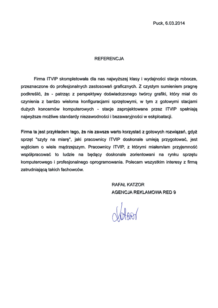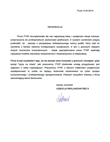 Puck, 6.03.2014 REFERENCJA Firma ITVIP skompletowała dla nas najwyższej klasy i wydajności stacje robocze, przeznaczone do profesjonalnych zastosowań graficznych. Z czystym sumieniem pragnę podkreślić, że - patrząc z perspektywy doświadczonego twórcy grafiki, który miał do czynienia z bardzo wieloma konfiguracjami sprzętowymi, w tym z gotowymi stacjami dużych koncernów komputerowych - stacje zaprojektowane przez ITVIP spełniają najwyższe możliwe standardy niezawodności i bezawaryjności w eskploatacji. Firma ta jest przykładem tego, że nie zawsze warto korzystać z gotowych rozwiązań, gdyż sprzęt "szyty na miarę", jaki pracownicy ITVIP doskonale umieją przygotować, jest wyjściem o wiele mądrzejszym. Pracownicy ITVIP, z którymi miałem/am przyjemność współpracować to ludzie na będący doskonale zorientowani na rynku sprzętu komputerowego i profesjonalnego oprogramowania. Polecam wszystkim interesy z firmą zatrudniającą takich fachowców. RAFAŁ KATZOR AGENCJA REKLAMOWA RED 9