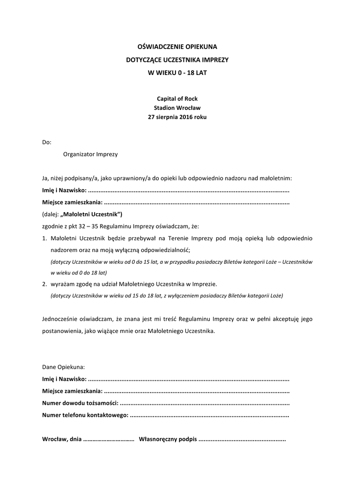OŚWIADCZENIEOPIEKUNA DOTYCZĄCEUCZESTNIKAIMPREZY WWIEKU0-18LAT CapitalofRock StadionWrocław 27sierpnia2016roku Do: OrganizatorImprezy Ja,niżejpodpisany/a,jakouprawniony/adoopiekilubodpowiednionadzorunadmałoletnim: ImięiNazwisko:................................................................................................................... Miejscezamieszkania:.......................................................................................................... (dalej:„MałoletniUczestnik”) zgodniezpkt32–35RegulaminuImprezyoświadczam,że: 1. Małoletni Uczestnik będzie przebywał na Terenie Imprezy pod moją opieką lub odpowiednio nadzoremoraznamojąwyłącznąodpowiedzialność; (dotyczyUczestnikówwwiekuod0do15lat,awprzypadkuposiadaczyBiletówkategoriiLoże–Uczestników wwiekuod0do18lat) 2. wyrażamzgodęnaudziałMałoletniegoUczestnikawImprezie. (dotyczyUczestnikówwwiekuod15do18lat,zwyłączeniemposiadaczyBiletówkategoriiLoże) Jednocześnie oświadczam, że znana jest mi treść Regulaminu Imprezy oraz w pełni akceptuję jego postanowienia,jakowiążącemnieorazMałoletniegoUczestnika. DaneOpiekuna: ImięiNazwisko:................................................................................................................... Miejscezamieszkania:.......................................................................................................... Numerdowodutożsamości:................................................................................................. Numertelefonukontaktowego:........................................................................................... Wrocław,dnia……………………………Własnoręcznypodpis..................................................