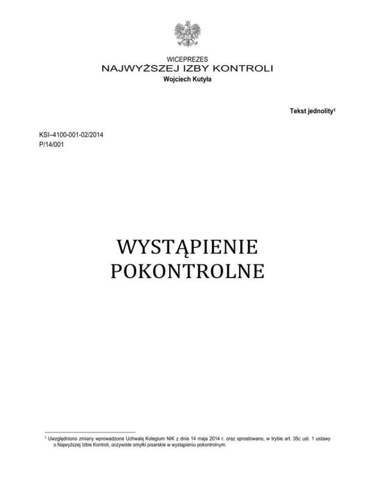 WICEPREZES NAJWYŻSZEJ IZBY KONTROLI Wojciech Kutyła Tekst jednolity1 KSI–4100-001-02/2014 P/14/001 WYSTĄPIENIE POKONTROLNE 1 Uwzględniono zmiany wprowadzone Uchwałą Kolegium NIK z dnia 14 maja 2014 r. oraz sprostowano, w trybie art. 35c ust. 1 ustawy o Najwyższej Izbie Kontroli, oczywiste omyłki pisarskie w wystąpieniu pokontrolnym. 2 I. Dane identyfikacyjne kontroli Numer i tytuł kontroli Jednostka przeprowadzająca kontrolę Kontrolerzy P/14/001 – Wykonanie budżetu państwa w 2013 r., część 41 – Środowisko Najwyższa Izba Kontroli Departament Środowiska 1. Agnieszka Kołakowska, doradca ekonomiczny, upoważnienie do kontroli nr 89619 z dnia 12 marca 2014 r. (dowód: akta kontroli str. 518-519) 2. Izabella Krawczyk, główny specjalista kontroli państwowej, upoważnienie do kontroli nr 86848 z dnia 23 grudnia 2013 r. (dowód: akta kontroli str. 1-2) 3. Monika Skrzypiec, główny specjalista kontroli państwowej, upoważnienie do kontroli nr 86847 z dnia 23 grudnia 2013 r. (dowód: akta kontroli str. 5-6) 4. Kinga Poprzycka-Harczuk, specjalista kontroli państwowej, upoważnienie do kontroli nr 86849 z dnia 23 grudnia 2013 r. (dowód: akta kontroli str. 3-4) Jednostka kontrolowana Kierownik jednostki kontrolowanej Główny Inspektorat Ochrony Środowiska, zwany dalej „GIOŚ”. ul. Wawelska 52/54, 00-922 Warszawa Andrzej Jagusiewicz, Główny Inspektor Ochrony Środowiska od dnia 27 grudnia 2007 r. (dowód: akta kontroli str. 7-8) II. Ocena kontrolowanej działalności Ocena Najwyższa Izba Kontroli ocenia pozytywnie mimo stwierdzonych nieprawidłowości2 wykonanie budżetu państwa w 2013 roku w części 41 – Środowisko w zakresie dochodów i wydatków zrealizowanych przez Główny Inspektorat Ochrony Środowiska. Powyższa ocena wynika z: − pozytywnej oceny planowania i realizacji dochodów budżetowych; − pozytywnej oceny planowania i realizacji wydatków budżetu państwa i wydatków budżetu środków europejskich; − pozytywnej opinii o rocznych sprawozdaniach budżetowych i kwartalnych sprawozdaniach w zakresie operacji finansowych; 2 Najwyższa Izba Kontroli stosuje 3-stopniową skalę ocen: pozytywna, pozytywna mimo stwierdzonych nieprawidłowości, negatywna. 3 − pozytywnej oceny zgodności kwot wydatków ujętych w sprawozdaniu z wykonania wydatków budżetu państwa oraz budżetu środków europejskich w układzie zadaniowym z ewidencja księgową; − pozytywnej, mimo stwierdzonych nieprawidłowości, oceny wiarygodności ksiąg rachunkowych w odniesieniu do rocznych sprawozdań budżetowych i kwartalnych sprawozdań w zakresie operacji finansowych oraz ich zgodność z zasadami rachunkowości, a także skuteczność funkcjonowania systemu rachunkowości oraz mechanizmów kontroli zarządczej dotyczących operacji finansowych i gospodarczych. Uzasadnienie oceny Pozytywną ocenę uzasadnia w szczególności fakt rzetelnej realizacji dochodów budżetu państwa. Nie stwierdzono także wydatków nielegalnych, a skala wydatków ocenionych jako niegospodarne nie przekroczyła progu ustalonego dla zastosowanej oceny. Stwierdzone nieprawidłowości polegały m.in. na: − prowadzeniu ksiąg rachunkowych z naruszeniem przepisów ustawy z dnia 29 września 1994 r. o rachunkowości 3 (uor); − niezrealizowaniu wniosku pokontrolnego dotyczącego wdrożenia zakupionego w 2008 r. informatycznego zintegrowanego systemu zarządzania urzędem – ERP, obejmującego m.in. sferę finansowo-księgową, tj. programu spełniającego wymogi ustawy o rachunkowości. III. Opis ustalonego stanu faktycznego 1. Dochody budżetowe 1.1. Opis stanu faktycznego Planowanie i realizacja dochodów budżetowych przez GIOŚ – dysponenta III stopnia W Głównym Inspektoriacie Ochrony Środowiska opracowano dokumenty planistyczne dotyczące dochodów, zgodnie z zasadami określonymi w rozporządzeniu Ministra Finansów z dnia 31 maja 2012 r. w sprawie szczegółowego sposobu, trybu i terminów opracowania materiałów do projektu ustawy budżetowej na rok 20134, tj. w załączniku Nr 18, rozdział 3 „Planowanie dochodów budżetowych”. Dochody budżetowe określone w planie finansowym GIOŚ na 2013 r. w kwocie 4.610,0 tys. zł, zostały zrealizowane w łącznej wysokości 5.436,5 tys. zł, co stanowiło 117,9% kwoty ujętej w planie finansowym jednostki. W porównaniu do 2012 r. uzyskane dochody były wyższe o 195,0 tys. zł, tj. o 3,7%. Nie stwierdzono nierzetelnego prognozowania dochodów. Przyczyną uzyskania wyższej od planowanej kwoty dochodów był wpływ środków z tytułu kar umownych za opóźnienia w realizacji kontraktów, których nie można było przewidzieć na etapie planowania. Wyższe były także wpływy z opłat rejestrowych i opłat rocznych, wnoszonych przez przedsiębiorców wprowadzających do obrotu sprzęt elektryczny, elektroniczny oraz baterie i akumulatory. Wpływy z tego tytułu stanowiły dominujący udział w strukturze zrealizowanych dochodów i wyniosły 5.309,0 tys. zł (97,6%). Uzyskane w 2013 r. dochody budżetowe przekazywane były na centralny rachunek bieżący budżetu państwa w terminach określonych w § 4 ust. 2 rozporządzenia Ministra Finansów z dnia 20 grudnia 2010 r. w sprawie szczegółowego sposobu wykonywania budżetu państwa5. W 2013 r. w GIOŚ nie wystąpiły należności, które uległy przedawnieniu. Nie dokonano także umorzenia należności. (dowód: akta kontroli str. 353-359, 360-361a, 362-364,393-425, 504-506) 3 4 5 Dz.U. z 2013 r., poz. 330 z późn. zm. Dz U. z 2012 r., poz. 628. Dz.U. Nr 245, poz. 1637 z późn. zm. – uchylony 31.01.2014 r. 4 Na podstawie badania sześciu dowodów księgowych i odpowiadających im zapisów księgowych na łączną kwotę 121,9 tys. zł, stwierdzono, że wszystkie objęte badaniem należności zostały przypisane terminowo, w kwotach zgodnych z dokumentami stanowiącymi podstawę tych zapisów, a należności z nich wynikające zostały uregulowane przez zobowiązane po