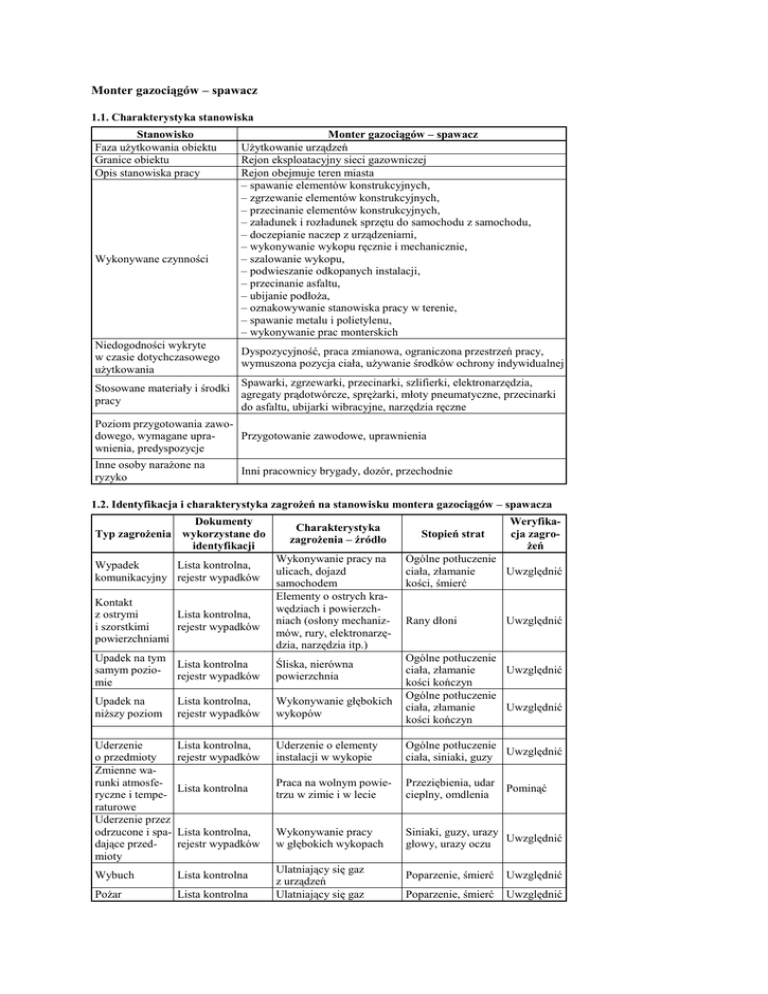 Monter gazociągów – spawacz 1.1. Charakterystyka stanowiska Stanowisko Faza użytkowania obiektu Granice obiektu Opis stanowiska pracy Wykonywane czynności Niedogodności wykryte w czasie dotychczasowego użytkowania Monter gazociągów – spawacz Użytkowanie urządzeń Rejon eksploatacyjny sieci gazowniczej Rejon obejmuje teren miasta – spawanie elementów konstrukcyjnych, – zgrzewanie elementów konstrukcyjnych, – przecinanie elementów konstrukcyjnych, – załadunek i rozładunek sprzętu do samochodu z samochodu, – doczepianie naczep z urządzeniami, – wykonywanie wykopu ręcznie i mechanicznie, – szalowanie wykopu, – podwieszanie odkopanych instalacji, – przecinanie asfaltu, – ubijanie podłoża, – oznakowywanie stanowiska pracy w terenie, – spawanie metalu i polietylenu, – wykonywanie prac monterskich Dyspozycyjność, praca zmianowa, ograniczona przestrzeń pracy, wymuszona pozycja ciała, używanie środków ochrony indywidualnej Spawarki, zgrzewarki, przecinarki, szlifierki, elektronarzędzia, Stosowane materiały i środki agregaty prądotwórcze, sprężarki, młoty pneumatyczne, przecinarki pracy do asfaltu, ubijarki wibracyjne, narzędzia ręczne Poziom przygotowania zawodowego, wymagane upraPrzygotowanie zawodowe, uprawnienia wnienia, predyspozycje Inne osoby narażone na ryzyko Inni pracownicy brygady, dozór, przechodnie 1.2. Identyfikacja i charakterystyka zagrożeń na stanowisku montera gazociągów – spawacza Dokumenty Typ zagrożenia wykorzystane do identyfikacji Wypadek Lista kontrolna, komunikacyjny rejestr wypadków Kontakt z ostrymi Lista kontrolna, i szorstkimi rejestr wypadków powierzchniami Charakterystyka zagrożenia – źródło Wykonywanie pracy na ulicach, dojazd samochodem Elementy o ostrych krawędziach i powierzchniach (osłony mechanizmów, rury, elektronarzędzia, narzędzia itp.) Stopień strat Weryfikacja zagrożeń Ogólne potłuczenie ciała, złamanie Uwzględnić kości, śmierć Rany dłoni Uwzględnić Ogólne potłuczenie ciała, złamanie Uwzględnić kości kończyn Ogólne potłuczenie ciała, złamanie Uwzględnić kości kończyn Upadek na tym Lista kontrolna samym poziorejestr wypadków mie Śliska, nierówna powierzchnia Upadek na niższy poziom Lista kontrolna, rejestr wypadków Wykonywanie głębokich wykopów Uderzenie o przedmioty Zmienne warunki atmosferyczne i temperaturowe Uderzenie przez odrzucone i spadające przedmioty Lista kontrolna, rejestr wypadków Uderzenie o elementy instalacji w wykopie Ogólne potłuczenie Uwzględnić ciała, siniaki, guzy Lista kontrolna Praca na wolnym powietrzu w zimie i w lecie Przeziębienia, udar cieplny, omdlenia Lista kontrolna, rejestr wypadków Wykonywanie pracy w głębokich wykopach Siniaki, guzy, urazy Uwzględnić głowy, urazy oczu Wybuch Lista kontrolna Pożar Lista kontrolna Ulatniający się gaz z urządzeń Ulatniający się gaz Pominąć Poparzenie, śmierć Uwzględnić Poparzenie, śmierć Uwzględnić Dokumenty Typ zagrożenia wykorzystane do identyfikacji Charakterystyka zagrożenia – źródło Stopień strat Weryfikacja zagrożeń z urządzeń Zasypanie, zalanie wodą w wykopie Kontakt z energią elektryczną Wibracja Hałas Termiczne działanie łuku elektrycznego Kontakt z gorącymi powierzchniami Promieniowanie ultrafioletowe Substancje i preparaty chemiczne toksyczne Wirus Flaviviridae (kleszczowe zapalenie mózgu) gr. 3, szczepienie Borrelia spp. gr. 2, brak szczepień Clostridium perfringens Laseczka zgorzeli gazowej gr. 2, brak szczepień Clostridium tetani Laseczka tężca gr. 2, szczepienia T Lista kontrolna, rejestr wypadków Lista kontrolna Lista kontrolna, rejestr chorób zawodowych Lista kontrolna, rejestr chorób zawodowych Wykonywanie pracy w głębokich wykopach ogólne potłuczenie ciała, złamanie kości Uwzględnić kończyny, śmierć Wykonywanie pracy w wykopach obok instalacji elektrycznych, uży- Porażenie, śmierć wane urządzenia zasilane energią elektryczną Ubijanie ziemi ubijarką Zespół chorób wibracyjną, praca młotem wibracyjnych pneumatycznym Uwzględnić Uwzględnić Sprężarka, młot pneumatyczny, ruch uliczny Utrata słuchu Uwzględnić Lista kontrolna, rejestr wypadków Spawanie elektryczne Poparzenie, urazy oczu Uwzględnić Lista kontrolna, rejestr wypadków Gorące powierzchnie spawanych konstrukcji Poparzenie Uwzględnić Lista kontrolna, rejestr wypadków Spawanie elektryczne Poparzenie, urazy oczu Uwzględnić Lista kontrolna Dymy spawalnicze, spawanie w głębokich wykopach Zatrucie Uwzględnić Lista kontrolna Droga zakażenia – ukłucie Zapalenie mózgu, kleszczy, praca w terenie gorączka (krzewy, drzewa) Uwzględnić Lista kontrolna Droga zakażenia – ukłucie Gorączki kleszczy, praca w terenie nawracające, (krzewy, drzewa) borelioza Uwzględnić Lista kontrolna Kontakt z glebą droga zakażenia – bezpośrednia, po zranieniach Zgorzel gazowa z rozpadem tkanek, Uwzględnić zapalenie tkanki łącznej, posocznica Lista kontrolna Kontakt z glebą droga zakażenia – bezpośrednia, po zranieniach Tężec, działanie toksyczne Uwzględnić 10.3. Ocena ryzyka zawodowego na stanowisku montera gazociągów – spawacza (ocena wykonana metodą RISK SCORE) Typ zagrożenia Charakterystyka zagrożenia – źródło Poziom ryzyka Możliwość uniknięcia lub SEP = R ograniczenia strat Działania zapobiegawcze 1560,5 = 45 – ryzyko małe. Oświetlenie sygnaOgólne potłuczePotrzebna kontrola, zaleca lizacyjne, ogrodzenie ciała, złamasię zaplanowanie i podjęnia, kamizelki nie kości, śmierć cie działań, których celem ostrzegawcze jest zmniejszenie ryzyka zawodowego Stopień strat Wypadek komunikacyjny Wykonywanie pracy na ulicach, dojazd samochodem Kontakt z ostrymi i szorstkimi powierzchniami Elementy o ostrych krawędziach i powierzchniach (osłony mechaRany dłoni nizmów, rury, narzędzia, elektronarzędzia) Osłony mechanizmów, środki ochrony indywidualnej 361 = 18 – ry