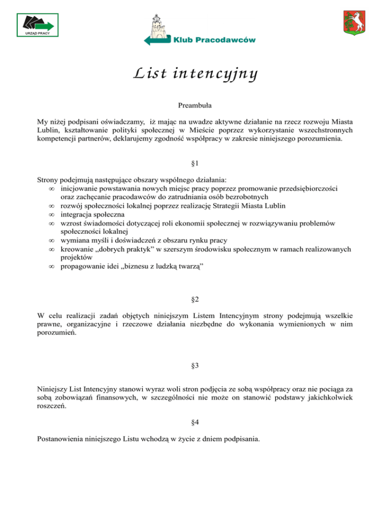 List intencyjny Preambuła My niżej podpisani oświadczamy, iż mając na uwadze aktywne działanie na rzecz rozwoju Miasta Lublin, kształtowanie polityki społecznej w Mieście poprzez wykorzystanie wszechstronnych kompetencji partnerów, deklarujemy zgodność współpracy w zakresie niniejszego porozumienia. §1 Strony podejmują następujące obszary wspólnego działania: • inicjowanie powstawania nowych miejsc pracy poprzez promowanie przedsiębiorczości oraz zachęcanie pracodawców do zatrudniania osób bezrobotnych • rozwój społeczności lokalnej poprzez realizację Strategii Miasta Lublin • integracja społeczna • wzrost świadomości dotyczącej roli ekonomii społecznej w rozwiązywaniu problemów społeczności lokalnej • wymiana myśli i doświadczeń z obszaru rynku pracy • kreowanie „dobrych praktyk” w szerszym środowisku społecznym w ramach realizowanych projektów • propagowanie idei „biznesu z ludzką twarzą” §2 W celu realizacji zadań objętych niniejszym Listem Intencyjnym strony podejmują wszelkie prawne, organizacyjne i rzeczowe działania niezbędne do wykonania wymienionych w nim porozumień. §3 Niniejszy List Intencyjny stanowi wyraz woli stron podjęcia ze sobą współpracy oraz nie pociąga za sobą zobowiązań finansowych, w szczególności nie może on stanowić podstawy jakichkolwiek roszczeń. §4 Postanowienia niniejszego Listu wchodzą w życie z dniem podpisania.
