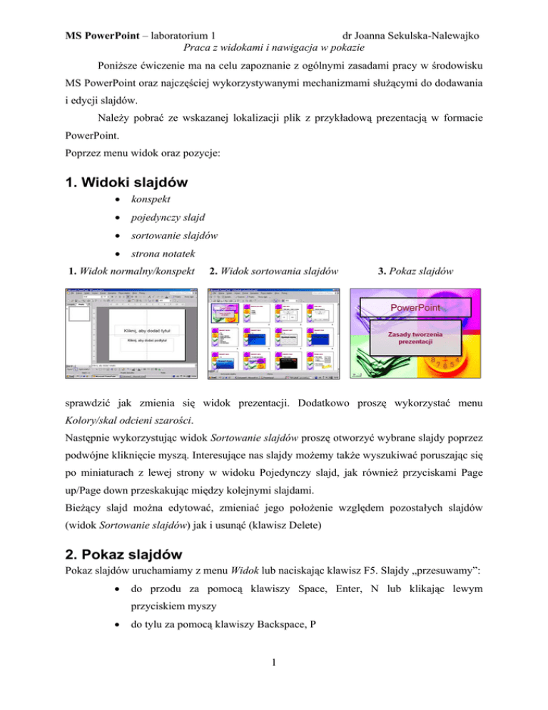 MS PowerPoint – laboratorium 1 dr Joanna Sekulska-Nalewajko Praca z widokami i nawigacja w pokazie Poniższe ćwiczenie ma na celu zapoznanie z ogólnymi zasadami pracy w środowisku MS PowerPoint oraz najczęściej wykorzystywanymi mechanizmami służącymi do dodawania i edycji slajdów. Należy pobrać ze wskazanej lokalizacji plik z przykładową prezentacją w formacie PowerPoint. Poprzez menu widok oraz pozycje: 1. Widoki slajdów • konspekt • pojedynczy slajd • sortowanie slajdów • strona notatek 1. Widok normalny/konspekt 2. Widok sortowania slajdów 3. Pokaz slajdów sprawdzić jak zmienia się widok prezentacji. Dodatkowo proszę wykorzystać menu Kolory/skal odcieni szarości. Następnie wykorzystując widok Sortowanie slajdów proszę otworzyć wybrane slajdy poprzez podwójne kliknięcie myszą. Interesujące nas slajdy możemy także wyszukiwać poruszając się po miniaturach z lewej strony w widoku Pojedynczy slajd, jak również przyciskami Page up/Page down przeskakując między kolejnymi slajdami. Bieżący slajd można edytować, zmieniać jego położenie względem pozostałych slajdów (widok Sortowanie slajdów) jak i usunąć (klawisz Delete) 2. Pokaz slajdów Pokaz slajdów uruchamiamy z menu Widok lub naciskając klawisz F5. Slajdy „przesuwamy”: • do przodu za pomocą klawiszy Space, Enter, N lub klikając lewym przyciskiem myszy • do tylu za pomocą klawiszy Backspace, P 1 MS PowerPoint – laboratorium 1 dr Joanna Sekulska-Nalewajko Praca z widokami i nawigacja w pokazie W celu przejścia do konkretnego slajdu, wykorzystujemy prawy przycisk myszy i z menu kontekstowego wybieramy Przejdź i Nawigator slajdów bądź Według tytułów (ograniczenie ilości). Kiedy chcemy zatrzymać pokaz, najwygodniej jest przełączyć się do „czarnego ekranu” z menu kontekstowego Ekran, lub naciskając klawisz B. 3. Dodawanie i edycja Dodawanie slajdów do istniejącej prezentacji dokonuje się poprzez menu Wstaw -> Nowy slajd. Jeżeli wybierzemy opcję Duplikuj slajd, nowy slajd będzie kopią slajdu aktualnie otwartego do edycji. Nowy slajd jest zgodny ze schematem zastosowanym do prezentacji, jednak wymaga wprowadzenia tytułu, treści i ew. grafiki. Jest on wstawiany za bieżącym slajdem. Proszę sprawdzić te opcje i dodać do nowego slajdu swój tytuł i tekst. 4. Przygotowanie prezentacji z zastosowaniem gotowego projektu. Otwórz nową prezentację i zastosuj dowolny szablon projektu. Na pierwszym slajdzie wprowadź dowolny tytuł i podtytuł, np. Tytuł: Microsoft Power Point Podtytuł: Zasady tworzenia prezentacji Edytuj wzorzec slajdu (Widok > Wzorzec > Wzorzec slajdu) i zmień tło i elementy graficzne szablonu, np. własne tło: 2 MS PowerPoint – laboratorium 1 dr Joanna Sekulska-Nalewajko Praca z widokami i nawigacja w pokazie Wstaw elementy stopki – datę, nr slajdu i napis tytułowy (menu Widok > Nagłówek i stopka). Wstaw kolejne slajdy (Wstaw > Nowy slajd). Wpisz tytuły i podtytuły. Korzystając z różnych układów slajdu w kolejnych slajdach wstaw: wykres, diagram, tabelę, obiekt WordArt i autokształty (kształty podstawowe, objaśnienia itp. – zmień wygląd autokształtu, wpisz tekst w autokształt, edytuj węzły krzywych). diagram tabela WordArt autokształt 3 MS PowerPoint – laboratorium 1 dr Joanna Sekulska-Nalewajko Praca z widokami i nawigacja w pokazie Zakończ pokaz czarnym slajdem (Narzędzia > Opcje > Widok > Zakończ pokaz czarnym slajdem). • • • Wstaw film (Wstaw > Filmy i dźwięki > Film z pliku > *.avi) i ustaw właściwości odtwarzania filmu w zakładce Ustawienia multimediów okna Animacja niestandardowa. Do elementów na slajdach zastosuj efekty animacji (Pokaz slajdów > Animacja niestandardowa). Zastosuj efekt przejścia slajdów (Pokaz slajdów > Przejście slajdu). Ustaw odpowiedni typ pokazu w oknie Przygotowanie pokazu (menu Pokaz): • Przetestuj gotowy pokaz slajdów (Pokaz slajdów > Wyświetl pokaz). • 5. Przygotowanie własnego wzorca 1. Otwórz nową, pustą prezentację. 2. Utwórz własny wzorzec slajdu (Widok > Wzorzec > Wzorzec slajdu). 3. Ustaw tło slajdu, wstaw grafikę w tle wzorca, do elementów grafiki i napisów zastosuj animację niestandardową (opcja - grafika i tekst mogą pozostać statyczne). 4. Ustaw formatowanie tekstu we wzorcu. 5. Ustaw przejście slajdu we wzorcu. 6. Zapisz wzorzec jako Szablon projektu (*.pot). Szablon powinien znaleźć się docelowo w katalogu C:\Program Files\Microsoft Office\Templates\Pesentation Designs. 4 MS PowerPoint – laboratorium 1 dr Joanna Sekulska-Nalewajko Praca z widokami i nawigacja w pokazie 6. Ćwiczenia Pozostały czas można poświęcić na zapoznawanie się z innymi funkcjami MS PowerPoint i ćwiczenia dot. materiału objętego w instrukcji. 5