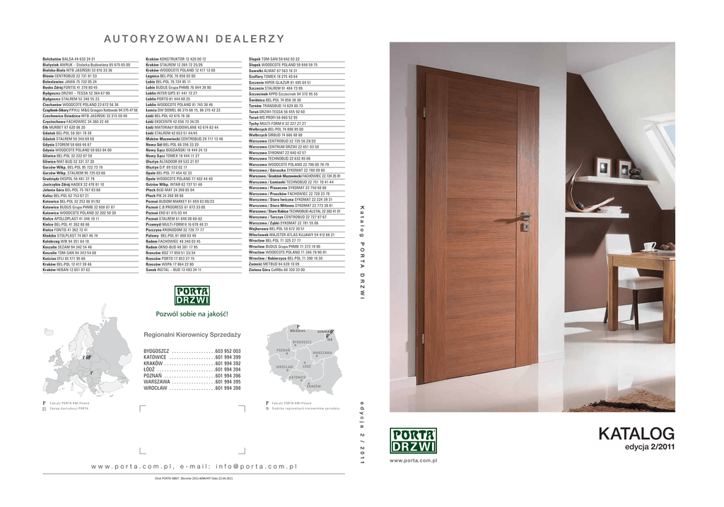 AUTORY ZOWANI DE ALER Z Y Słupsk TOM-SAN 59 842 03 22 Słupsk WOODCOTE POLAND 59 848 59 75 Suwałki ALMAT 87 563 16 31 Szaflary TOMEX 18 275 40 64 Szczecin HIPER-GLAZUR 91 485 64 51 Szczecin STALREM 91 484 73 99 Szczecinek KPPD Szczecinek 94 372 95 55 Świdnica BEL-POL 74 856 38 30 Tarnów TRANSBUD 14 629 80 73 Toruń DRZWI-TESSA 56 655 92 60 Toruń MS PROFI 56 660 52 95 Tychy MULTI-FORM II 32 227 27 27 Wałbrzych BEL-POL 74 886 95 00 Wałbrzych SIRBUD 74 666 88 88 Warszawa CENTROBUD 22 735 56 29/20 Warszawa CENTRUM DRZWI 22 651 03 50 Warszawa SYKOMAT 22 840 42 57 Warszawa TECHNOBUD 22 632 85 06 Warszawa WOODCOTE POLAND 22 796 00 76-79 Warszawa / Góraszka SYKOMAT 22 780 09 80 Warszawa / Grodzisk Mazowiecki FACHOWIEC 22 724 35 91 Warszawa / Łomianki TECHNOBUD 22 751 70 41-44 Warszawa / Piaseczno SYKOMAT 22 750 68 66 Warszawa / Pruszków FACHOWIEC 22 728 23 78 Warszawa / Stara Iwiczna SYKOMAT 22 224 39 31 Warszawa / Stara Miłosna SYKOMAT 22 773 38 81 Warszawa / Stare Babice TECHNOBUD-ALSTAL 22 382 41 01 Warszawa / Tarczyn CENTROBUD 22 727 87 67 Warszawa / Ząbki SYKOMAT 22 781 55 06 Wejherowo BEL-POL 58 672 30 51 Włocławek MAJSTER ATLAS KUJAWY 54 412 66 21 Wrocław BEL-POL 71 325 27 77 Wrocław BUDUS Grupa PHMB 71 373 19 90 Wrocław WOODCOTE POLAND 71 346 79 90-91 Wrocław / Kobierzyce BEL-POL 71 390 19 30 Zamość METBUD 84 639 10 09 Zielona Góra CeMBe 68 320 33 00 P O R TA Kraków KONSTRUKTOR 12 420 00 12 Kraków STALREM 12 264 72 25/26 Kraków WOODCOTE POLAND 12 417 13 00 Legnica BEL-POL 76 856 03 00 Lubin BEL-POL 76 724 95 11 Lubin BUDUS Grupa PHMB 76 844 39 90 Lublin INTER GIPS 81 441 72 27 Lublin PORTO 81 444 60 25 Lublin WOODCOTE POLAND 81 745 38 46 Łomża DW DOMEL 86 215 66 15, 86 215 42 22 Łódź BEL-POL 42 676 76 36 Łódź EKOCENTR 42 656 73 34/35 Łódź MATERIAŁY BUDOWLANE 42 674 82 44 Łódź STALREM 42 653 51 44/45 Maków Mazowiecki CENTROBUD 29 717 13 48 Nowa Sól BEL-POL 68 356 33 20 Nowy Sącz BOGDAŃSKI 18 444 24 13 Nowy Sącz TOMEX 18 444 11 27 Olsztyn ALTADOOR 89 533 21 07 Olsztyn D.P. 89 532 02 17 Opole BEL-POL 77 454 42 33 Opole WOODCOTE POLAND 77 402 44 40 Ostrów Wlkp. INTAR 62 737 51 48 Płock BUD-MAT 24 268 65 04 Płock PIK 24 268 99 66 Poznań BUDOM MARKET 61 859 83 00/23 Poznań C.B.PROGRESS 61 873 33 00 Poznań EKO 61 815 03 44 Poznań STALREM 61 846 08 60-62 Przemyśl MULTI-FORM II 16 678 48 31 Pszczyna KRONODOM 32 738 77 77 Puławy BEL-POL 81 888 03 49 Radom FACHOWIEC 48 340 03 45 Radom OKNO-BUD 48 381 17 95 Rzeszów BOZ 17 850 51 33/34 Rzeszów PORTO 17 853 27 15 Rzeszów WEPA 17 864 22 80 Sanok INSTAL – BUD 13 493 24 11 K a t a l o g Bełchatów BALSA 44 633 24 31 Białystok AWRUK – Stolarka Budowlana 85 675 65 00 Bielsko-Biała MTB JASIŃSKI 33 816 33 36 Błonie CENTROBUD 22 731 81 53 Bolesławiec JAWA 75 732 05 24 Busko Zdrój FONTIS 41 378 80 45 Bydgoszcz DRZWI – TESSA 52 364 67 00 Bydgoszcz STALREM 52 346 55 23 Ciechanów WOODCOTE POLAND 23 672 56 36 Czaplinek-Sikory P.P.H.U. M & G Grzegorz Kotłowski 94 375 47 56 Czechowice Dziedzice MTB JASIŃSKI 32 215 50 49 Częstochowa FACHOWIEC 34 360 22 40 Ełk MURBET 87 620 06 20 Gdańsk BEL-POL 58 301 78 39 Gdańsk STALREM 58 340 69 50 Gdynia STOREM 58 668 46 87 Gdynia WOODCOTE POLAND 58 663 84 00 Gliwice BEL-POL 32 232 87 58 Gliwice MAT-BUD 32 331 37 20 Gorzów Wlkp. BEL-POL 95 722 73 19 Gorzów Wlkp. STALREM 95 725 03 66 Grudziądz EKSPOL 56 461 37 78 Jastrzębie Zdrój HADEX 32 478 81 10 Jelenia Góra BEL-POL 75 767 83 88 Kalisz BEL-POL 62 753 67 21 Katowice BEL-POL 32 252 86 91/92 Katowice BUDUS Grupa PHMB 32 608 87 87 Katowice WOODCOTE POLAND 32 202 50 30 Kielce APOLLOPLAST 41 346 10 11 Kielce BEL-POL 41 362 68 66 Kielce FONTIS 41 362 72 41 Kłodzko STOLPLAST 74 867 46 74 Kołobrzeg WIK 94 351 64 18 Koszalin SEZAM 94 342 54 46 Koszalin TOM-SAN 94 343 54 88 Kościan EFLI 65 511 95 66 Kraków BEL-POL 12 417 39 46 Kraków HEBAN 12 651 87 62 D R Z W I Pozwól sobie na jakość! BOLSZE WO Regionalni Kierownicy Sprzedaży SUWAŁK I E ŁK BY DGOSZCZ BYDGOSZCZ . . . . . . . . . . . . . . . . . .603 952 003 KATOWICE . . . . . . . . . . . . . . . . . . .601 994 399 KRAKÓW . . . . . . . . . . . . . . . . . . . . .601 994 392 ŁÓDŹ . . . . . . . . . . . . . . . . . . . . . . . .601 994 394 POZNAŃ . . . . . . . . . . . . . . . . . . . . .601 994 396 WARSZAWA . . . . . . . . . . . . . . . . . .601 994 395 WROCŁAW . . . . . . . . . . . . . . . . . . .601 994 398 POZNAŃ WROC Ł AW WARSZ AWA ŁÓDŹ K ATOWICE K RAKÓW F a b r y k i P O R TA K M I P o l a n d Z a s i ę g d y s t r y b u c j i P O R TA Siedziby regionalnych kierowników spr zedaż y Druk PORTA 488/7. Zlecenie 2011-4096-MP Data 22.04.2011 2 / 2 0 11 w w w.por ta.com.pl, e-mail: info@por ta.com.pl e d yc j a F a b r y k i P O R TA K M I P o l a n d KATALOG edycja 2/2011 specjalnie z myślą o Państwa komforcie pracy przygotowaliśmy serwis 3 500 nowych bibliotek 3DS z mapowaniem współrzędnych tekstur nowe tekstury oklein w skali 1:1 nowość – biblioteki 3DS klamek biblioteki DWG 2D, DWG 3D, REVIT® pliki 3DS, RFA aktualne kolekcje skrzydeł aktualne kolekcje ościeżnic klasyfikacja zastosowań przykładowe realizacje filmy przedstawiające unikatowe cechy produktu filmy montażowe G dyby ktokolwiek pokusił się o napisanie historii drzwi, wykorzystując bogactwo opisów, wzornictwa, stylów, charakterystycznych dla drzwi w różnych okresach i miejscach, powstałaby fascynująca historia, w której wydarzenia społeczno-polityczne często kształtujące losy świata oraz osobiste spotkania odbywały się za drzwiami, na tle drzwi albo gdzieś pomiędzy nimi. Można powiedzieć, że drzwi to idea ruchomej płaszczyzny, której podstawowa funkcja oddzielania jednych pomieszczeń od drugich zawsze była wzbogacana o działanie ludzi. Drzwi zatem, to nie tylko fragment mieszkania, czy przestrzeni publicznej; drzwi to przede wszystkim element towarzyszący codziennej aktywności człowieka: w pracy, w odpoczynku, w przeżywaniu rado