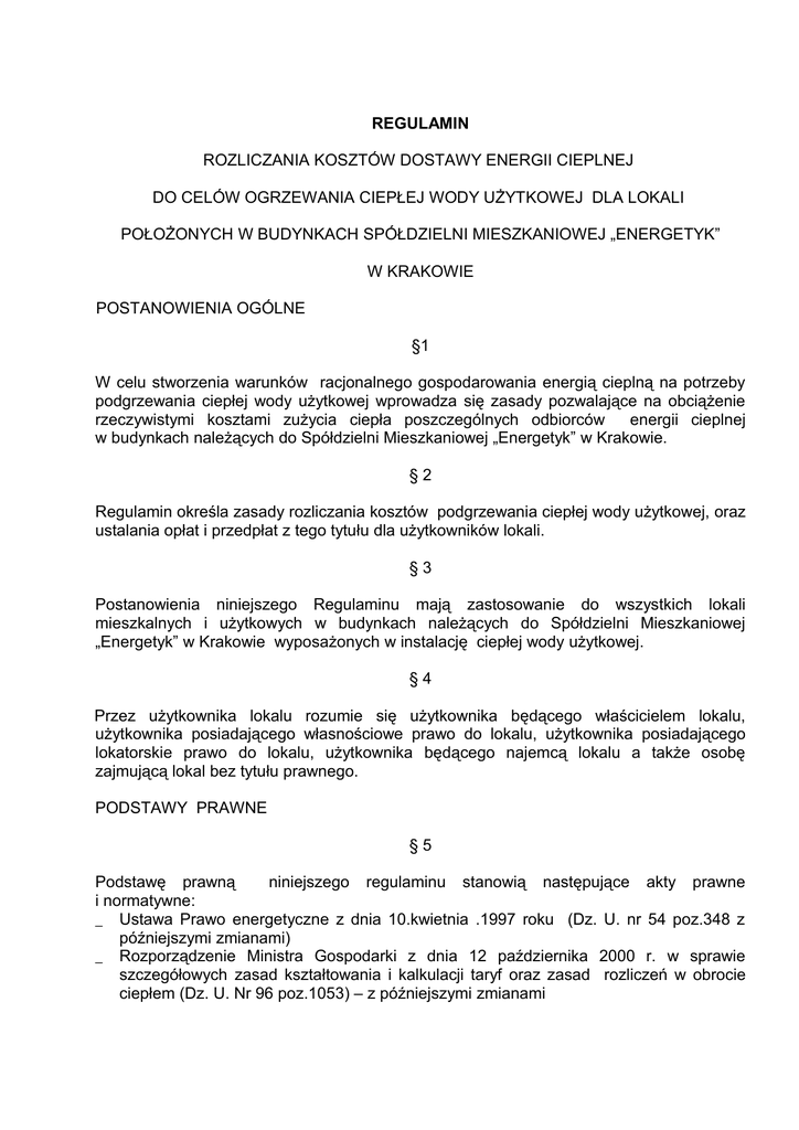 REGULAMIN ROZLICZANIA KOSZTÓW DOSTAWY ENERGII CIEPLNEJ DO CELÓW OGRZEWANIA CIEPŁEJ WODY UŻYTKOWEJ DLA LOKALI POŁOŻONYCH W BUDYNKACH SPÓŁDZIELNI MIESZKANIOWEJ „ENERGETYK” W KRAKOWIE POSTANOWIENIA OGÓLNE §1 W celu stworzenia warunków racjonalnego gospodarowania energią cieplną na potrzeby podgrzewania ciepłej wody użytkowej wprowadza się zasady pozwalające na obciążenie rzeczywistymi kosztami zużycia ciepła poszczególnych odbiorców energii cieplnej w budynkach należących do Spółdzielni Mieszkaniowej „Energetyk” w Krakowie. §2 Regulamin określa zasady rozliczania kosztów podgrzewania ciepłej wody użytkowej, oraz ustalania opłat i przedpłat z tego tytułu dla użytkowników lokali. §3 Postanowienia niniejszego Regulaminu mają zastosowanie do wszystkich lokali mieszkalnych i użytkowych w budynkach należących do Spółdzielni Mieszkaniowej „Energetyk” w Krakowie wyposażonych w instalację ciepłej wody użytkowej. §4 Przez użytkownika lokalu rozumie się użytkownika będącego właścicielem lokalu, użytkownika posiadającego własnościowe prawo do lokalu, użytkownika posiadającego lokatorskie prawo do lokalu, użytkownika będącego najemcą lokalu a także osobę zajmującą lokal bez tytułu prawnego. PODSTAWY PRAWNE §5 Podstawę prawną niniejszego regulaminu stanowią następujące akty prawne i normatywne: _ Ustawa Prawo energetyczne z dnia 10.kwietnia .1997 roku (Dz. U. nr 54 poz.348 z późniejszymi zmianami) _ Rozporządzenie Ministra Gospodarki z dnia 12 października 2000 r. w sprawie szczegółowych zasad kształtowania i kalkulacji taryf oraz zasad rozliczeń w obrocie ciepłem (Dz. U. Nr 96 poz.1053) – z późniejszymi zmianami _ _ _ _ Rozporządzenie Ministra Gospodarki z dnia 11 sierpnia 2000 r. w sprawie szczegółowych warunków przyłączenia podmiotów do sieci ciepłowniczych obrotu ciepłem świadczenia usług przesyłowych, ruchu sieciowego i eksploatacji sieci oraz standardów jakościowych obsługi odbiorców ( Dz. U.. Nr 72 poz.845 ). Taryfy cen i stawek opłat stosowane przez Miejskie Przedsiębiorstwo Energetyki Cieplnej w Krakowie, Umowa o dostarczanie energii cieplnej zawarta pomiędzy Spółdzielnią Mieszkaniową „Energetyk” a Miejskim Przedsiębiorstwem Energetyki Cieplnej z dnia 09.12.1999r. Statut Spółdzielni Mieszkaniowej „Energetyk” ZASADY USTALANIA KOSZTÓW PODGRZEWANIA CIEPŁEJ WODY UŻYTKOWEJ §6 1. Rozliczenia kosztów centralnego ogrzewania dokonuje się na podstawie wskazań licznika ciepła usytuowanego w układzie pomiarowo – rozliczeniowym budynku lub nieruchomości podłączonej do sieci ciepłowniczej. 2. Koszty zakupu energii cieplnej do celów podgrzania ciepłej wody użytkowej rozliczane są w oparciu o stosowane przez dostawcę stawki taryfowe zatwierdzone Decyzją Prezesa Urzędu Regulacji Energetyki. 3. Koszty zakupu energii cieplnej dla danego budynku na potrzeby centralnego ogrzewania lub ciepłej wody użytkowej składają się z dwóch elementów kosztów: a. kosztów stałych b. kosztów zmiennych Koszty stałe (zgodnie z Prawem Energetycznym to:) _ opłata za zamówioną moc cieplną wyliczona na podstawie zapotrzebowania energii cieplnej w oparciu o dokumentacją techniczną dla danego budynku wyrażoną w zł/MW _ opłata abonamentowa naliczana za każdy punkt pomiarowy wyrażona w zł/szt. _ opłata stała przesyłowa za zamówioną moc cieplną wyrażona w zł/MW Koszty zmienne (zgodnie z Prawem Energetycznym to:) _ koszty zużycia energii cieplnej określane wg wskazań liczników ciepła wyrażone w zł/GJ, _ koszty zmienne opłaty przesyłowej wyrażony w zł/ GJ, _ koszty zużycia nośnika grzewczego zł/m3 §7 Okresem rozliczeniowym jest jeden rok kalendarzowy. Dopuszcza się w wyjątkowych i uzasadnionych przypadkach rozliczanie kosztów ogrzewania w okresie nie dłuższym niż trzy lata kalendarzowe §8 1. Koszty zakupu ciepła dostarczanego do budynku pokrywane są przez indywidualnych odbiorców ciepła w formie miesięcznych opłat zaliczkowych. 2. Podstawą ustalania odpłatności za dostawę energii cieplnej do podgrzewania ciepłej wody użytkowej, jest suma kosztów (stałych i zmiennych) zaksięgowanych wg faktur wystawianych przez dostawcę energii cieplnej w przyjętym okresie rozliczeniowym dla danego budynku lub nieruchomości. 3. Wysokość opłat zaliczkowych powinna być ustalana w taki sposób aby zapewniała pokrycie ponoszonych kosztów ogrzewania w danym okresie rozliczeniowym. Wysokość opłat powinna uwzględniać dane dotyczące okresu grzewczego i przewidywanego jednostkowego zużycia energii cieplnej. 4. W przypadku wystąpienia istotnych zmian w kształtowaniu się kosztów wysokość miesięcznych zaliczek może ulec zmianie w trakcie okresu rozliczeniowego np: _ Wprowadzenia zmian cen energii cieplnej przez dostawcę w wyniku zastosowania nowych stawek taryfowych, _ Wzrostu lub spadku zużycia energii cieplnej w budynkach. ZALICZKI NA POCZET ROZLICZANIA KOSZTÓW §9 1. Podstawą ustalenia zaliczki za podgrzewanie ciepłej wody użytkowej są koszty ujęte w planach finansowo – ekonomicznych Spółdzielni na dany rok kalendarzowy. Koszty o których mowa wyliczone są na podstawie faktycznego zużycia ciepła z ostatniego okresu rozliczeniowego oraz prognozowanych wysokości cen energii cieplnej podanych przez dostawcę ciepła. 2. Zaliczki należy wnosić równocześnie z innymi opłatami za korzystanie z lokalu. SYSTEM INDYWIDUALNYCH ROZLICZEŃ KOSZTÓW PODGRZANIA CIEPŁEJ WODY UŻYTKOWEJ § 10 1. Użytkownik lokalu zobowiązany jest ponosić opłaty za podgrzanie wody wodociągowej wg indywidualnego rozliczenia kosztów określonych proporcjonalnie wg wskazań wodomierzy mieszkaniowych do wody ciepłej. 2. W rozliczeniach nie uwzględnia się kosztów wody wodociągowej i odprowadzania ścieków ograniczając się tylko do kosztów energii cieplnej potrzebnej do jej podgrzania.Koszt zużycia wody wodociągowej i odprowa