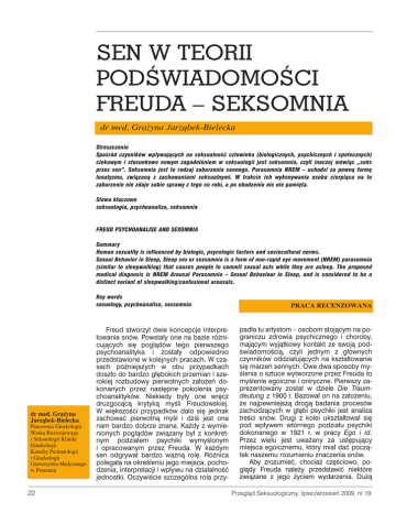SEN W TEORII PODÂWIADOMOÂCI FREUDA – SEKSOMNIA dr med. Gra˝yna Jarzàbek-Bielecka Streszczenie SpoÊród czynników wp∏ywajàcych na seksualnoÊç cz∏owieka (biologicznych, psychicznych i spo∏ecznych) ciekawym i stosunkowo nowym zagadnieniem w seksuologii jest seksomnia, czyli inaczej mówiàc „seks przez sen”. Seksomnia jest to rodzaj zaburzenia sennego. Parasomnia NREM – uchodzi za pewnà form´ lunatyzmu, zwiàzanà z zachowaniami seksualnymi. W trakcie ich wykonywania osoba cierpiàca na to zaburzenie nie zdaje sobie sprawy z tego co robi, a po obudzeniu nic nie pami´ta. S∏owa kluczowe seksuologia, psychoanaliza, seksomnia FREUD PSYCHOANALISE AND SEXOMNIA Summary Human sexuality is influenced by biologic, psycologic factors and sociocultural norms. Sexual Behavior in Sleep, Sleep sex or sexsomnia is a form of non-rapid eye movement (NREM) parasomnia (similar to sleepwalking) that causes people to commit sexual acts while they are asleep. The proposed medical diagnosis is NREM Arousal Parasomnia – Sexual Behaviour in Sleep, and is considered to be a distinct variant of sleepwalking/confusional arousals. Key words sexuology, psychoanalise, sexsomnia dr med. Gra˝yna Jarzàbek-Bielecka Pracownia Ginekologii Wieku Rozwojowego i Seksuologii Kliniki Ginekologii Katedry Perinatologii i Ginekologii Uniwersytetu Medycznego w Poznaniu 22 Freud stworzy∏ dwie koncepcje interpretowania snów. Powsta∏y one na bazie ró˝nicujàcych si´ poglàdów tego pierwszego psychoanalityka i zosta∏y odpowiednio przedstawione w kolejnych pracach. W czasach póêniejszych w obu przypadkach dosz∏o do bardzo g∏´bokich przemian i szerokiej rozbudowy pierwotnych za∏o˝eƒ dokonanych przez nast´pne pokolenia psychoanalityków. Niekiedy by∏y one wr´cz druzgocàcà krytykà myÊli Freudowskiej. W wi´kszoÊci przypadków da∏o si´ jednak zachowaç pierwotnà myÊl i dziÊ jest ona nam bardzo dobrze znana. Ka˝dy z wymienionych poglàdów zwiàzany by∏ z konkretnym podzia∏em psychiki wymyÊlonym i opracowanym przez Freuda. W ka˝dym sen odgrywa∏ bardzo wa˝nà rol´. Ró˝nica polega∏a na okreÊleniu jego miejsca, pochodzenia, interpretacji i wp∏ywu na dzia∏alnoÊç jednostki. OczywiÊcie szczególna rola przy- PRACA RECENZOWANA pad∏a tu artystom – osobom stojàcym na pograniczu zdrowia psychicznego i choroby, majàcym wyjàtkowy kontakt ze swojà podÊwiadomoÊcià, czyli jednym z g∏ównych czynników oddzia∏ujàcych na kszta∏towanie si´ marzeƒ sennych. Owe dwa sposoby myÊlenia o sztuce wytworzone przez Freuda to myÊlenie egoiczne i oniryczne. Pierwszy zaprezentowany zosta∏ w dziele Die Traumdeutung z 1900 r. Bazowa∏ on na za∏o˝eniu, ˝e najpewniejszà drogà badania procesów zachodzàcych w g∏´bi psychiki jest analiza treÊci snów. Drugi z kolei ukszta∏towa∏ si´ pod wp∏ywem wtórnego podzia∏u psychiki dokonanego w 1921 r. w pracy Ego i id. Przez wielu jest uwa˝any za ust´pujàcy miejsca egoicznemu, który mia∏ daç poczàtek naszemu rozumieniu znaczenia snów. Aby zrozumieç, chocia˝ cz´Êciowo, poglàdy Freuda nale˝y przedstawiç niektóre zwiàzane z jego ˝yciem wydarzenia. Du˝à Przeglàd Seksuologiczny, lipiec/wrzesieƒ 2009, nr 19 rol´ w jego odnoszàcych sukcesy poglàdach odegra∏y bowiem jego w∏asne zachowania odpowiednio obserwowane i interpretowane, dajàce mu podstawy do wniosków znajdujàcych potwierdzane w szerszej grupie przypadków. Dlatego przy zajmowaniu si´ analizà poglàdów Freuda, na miejsce snu w ˝yciu cz∏owieka, nie mo˝na pominàç biografii psychoanalityka. Wa˝ne elementy jego w∏asnych dziejów odegra∏y bowiem niepoÊlednià rol´ w procesie kszta∏towania si´ jego poglàdów. Mo˝na Êmia∏o stwierdziç, ˝e doÊç du˝y kontakt Freuda z kulturà wy˝szà wp∏ynà∏ na jego m∏odzieƒcze zainteresowania, co znalaz∏o odbicie w jego doros∏ej pracy naukowej. Wa˝nym wydaje si´ fakt, i˝ od lat 60. XIX wieku a˝ do 1938 r. Freud zamieszkiwa∏ w Wiedniu – stolicy Austrii. By∏o to te˝ centrum ˝ycia kulturalnego nie tylko tej cz´Êci Europy. W tym mieÊcie rozkwita∏y nauka i sztuka. Dla Freuda, którego od poczàtku fascynowa∏y j´zyki obce i literatura, trudno by∏o znaleêç lepsze miejsce dla rozwoju. Ostatecznie wybra∏ jednak studia medyczne na Uniwersytecie Wiedeƒskim. Wielokrotnie jednak w jego pracy pojawia∏y si´ nawiàzania do m∏odzieƒczych zainteresowaƒ. „Albert Einstein podziwia∏ Freuda nade wszystko za wspania∏e pisarstwo, mówiàc, ˝e nikt ze wspó∏czesnych, piszàcych po niemiecku, nie mo˝e mu dorównaç w mistrzostwie j´zykowym, z jakim ujmuje swój przedmiot” [1]. Nie by∏ to poglàd odosobniony. Oznakà tego faktu mo˝e byç nagroda literacka im. Goethego przyznana Freudowi w 1930 r. przez miasto Frankfurt na Menem. DziÊ ugruntowany jest te˝ poglàd, ˝e „dzi´ki Freudowi w piÊmiennictwie naszego wieku pojawi∏ si´ nowy, swoisty gatunek literacki (…), jakim pod jego piórem, a potem u kontynuatorów, sta∏a si´ historia przypadku (…), czyli opis choroby i przebiegu leczenia – psycholeczenia, uczenia si´ wi´zi mi´dzyludzkiej i wi´zià mi´dzyludzkà – konkretnej osoby. Ten gatunek pisarski, skrajnie faktograficzny i skrajnie u˝ytkowy, zmieni∏ si´ u Freuda – nie tracàc nic z tamtych swoich funkcji i walorów – w prawdziwe dzie∏o sztuki”. Jak wi´c widaç sam pierwszy psychoanalityk by∏ artystà w swoim fachu. Uczestniczy∏ aktywnie w ˝yciu kulturalnym swoich czasów. Dodatkowo interesowa∏ si´ sztukà z jeszcze jednego istotnego powodu, majàcego wielki wp∏yw na jego badania, g∏ównie dzi´ki mo˝liwoÊci autoobserwacji. Zajmowa∏ si´ on bowiem reakcjami, jakie wywo∏ywa∏a ona w ludziach, ze wzgl´du na procesy psychiczne, w wyniku których sztuka si´ pojawia∏a i pojawia. Mniej zaÊ uwagi poÊwi´ca∏ on na szeroko poj´tà kultur´ ze wzgl´du na nià samà. Przeglàd Seksu