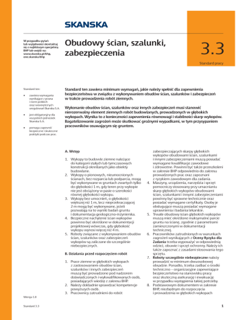 W przypadku pytań lub wątpliwości skontaktuj się z najbliższym specjalistą BHP lub wejdź na: www.skanska.pl/bhp, one.skanska/bhp Obudowy ścian, szalunki, zabezpieczenia 3.3 Standard pracy Standard ten: • zawiera wymagania wynikające z prawa i norm polskich oraz wewnętrznych uregulowań Skanska S.A. • jest obligatoryjny dla wszystkich jednostek Skanska S.A. • pomaga zapewnić bezpieczne i skuteczne praktyki podczas prac. Standard ten zawiera minimum wymagań, jakie należy spełnić dla zapewnienia bezpieczeństwa w związku z wykonywaniem obudów ścian, szalunków i zabezpieczeń w trakcie prowadzenia robót ziemnych. Wykonanie obudów ścian, szalunków oraz innych zabezpieczeń musi stanowić nierozerwalny element ziemnych robót budowlanych, prowadzonych w głębokich wykopach. Wynika to z konieczności zapewnienia równowagi i stabilności skarp wykopów. Bagatelizowanie zagrożeń może skutkować groźnymi wypadkami, w tym przysypaniem pracowników osuwającym się gruntem. A. Wstęp 1. Wykopy to budowle ziemne należące do kategorii stałych lub tymczasowych konstrukcji określanych jako obiekty budowlane. 2. Wykopy o pionowych, nieumocnionych ścianach, bez rozparcia lub podparcia, mogą być wykonywane w gruntach zwartych tylko do głębokości 1 m, gdy teren przy wykopie nie jest obciążony w pasie o szerokości równej głębokości wykopu. 3. Wykopy bez umocnień, o głębokości większej niż 1 m, lecz nieprzekraczającej 2 m mogą być wykonywane, jeżeli pozwalają na to wyniki badań gruntu i dokumentacja geologiczno-inżynierska. 4. Bezpieczne nachylenie ścian wykopów powinno być określone w dokumentacji projektowej wówczas, gdy głębokość wykopu wynosi więcej niż 4 m. 5. Roboty związane z wykonywaniem obudów ścian, szalunków oraz zabezpieczeń wykopów są zaliczane do szczególnie niebezpiecznych. 4. 5. 6. B. Działania przed rozpoczęciem robót 7. 1. Prace ziemne w głębokich wykopach z zastosowaniem obudów ścian, szalunków i innych zabezpieczeń muszą być prowadzone pod nadzorem doświadczonych i wykwalifikowanych osób, posiadających wiedzę z zakresu BHP. 2. Należy dokładnie sprawdzać kompetencje powyższych osób. 3. Pracownicy zatrudnieni do robót 8. zabezpieczających skarpy głębokich wykopów obudowami ścian, szalunkami i innymi zabezpieczeniami muszą posiadać wymagane kwalifikacje zawodowe i zdrowotne. Powinni być także przeszkoleni w zakresie BHP odpowiednio do zakresu prowadzonych prac oraz zapoznani z ryzykiem zawodowym dla zadania. Maszyny, urządzenia, narzędzia i sprzęt pomocniczy stosowany przy umacnianiu skarp głębokich wykopów obudowami ścian, szalunkami i innymi zabezpieczeniami powinny być sprawne technicznie oraz posiadać wymagane certyfikaty. Osoby je obsługujące muszą posiadać wymagane uprawnienia i badania lekarskie. Trwałe obudowy ścian głębokich wykopów muszą mieć określone maksymalne parcie gruntu na ścianę, zgodnie z parametrami zamieszczonymi w dokumentacji technicznej. Pracowników zatrudnionych w warunkach zagrożeń wynikających z Oceny Ryzyka dla Zadania trzeba wyposażyć w odpowiednią odzież, obuwie i sprzęt ochronny. Należy ich także zapoznać z zasadami stosowania tego sprzętu. Roboty szczególnie niebezpieczne należy prowadzić w minimum dwuosobowej obsadzie. Ponadto, trzeba zadbać o środki techniczno – organizacyjne zapewniające bezpieczeństwo na stanowisku pracy oraz skuteczną asekurację i ewakuację w przypadku wystąpienia takiej potrzeby. Podstawowym dokumentem w zakresie BHP, niezbędnym do rozpoczęcia i prowadzenia w głębokich wykopach Wersja 1.0 Standard 3.3 1 prac związanych z zabezpieczeniem ich skarp obudowami ścian, szalunkami i innymi zabezpieczeniami jest Instrukcja Bezpiecznego Wykonywania Robót (IBWR) dla konkretnego zadania. 9. IBWR należy opracować korzystając z Planu Bezpieczeństwa, Ochrony Zdrowia i Środowiska (Plan BOZiŚ), Oceny Ryzyka dla Zadania oraz projektu wykonawczego dla konkretnego rodzaju robót. 10. Miejsca niebezpieczne należy ogrodzić i oznakować poprzez umieszczenie tablic z napisami ostrzegawczymi. 11. Na czas zmroku i nocy trzeba wykop skutecznie zabezpieczyć przed możliwością wpadnięcia do niego osób postronnych oraz zaopatrzyć w czerwone światło ostrzegawcze. 12. Jeżeli teren, na którym prowadzone są wykopy z zastosowaniem obudów ścian, szalunków i innych zabezpieczeń nie może być ogrodzony, należy zapewnić stały nad nim nadzór. • okrąglaki o średnicy w cieńszym końcu co najmniej 120mm. 5. Rozstaw podparć lub rozparć oraz zakotwień ścian wykopów o głębokości do 4 m, powinien wynosić w układzie pionowym 1 m, zaś poziomym 1,5 m (Rys. 3). C. Działania podczas prowadzenia robót Wykopy wąskoprzestrzenne 1. Ściany głębokich wykopów wąskoprzestrzennych można zabezpieczyć stosując trwałe, systemowe obudowy – płytowe (metalowe) (Rys. 1). Rys. 3 Ścianki szczelne 6. Ażurowe deskowanie ścian głębokich wykopów można stosować tylko w gruntach zwartych. 7. Ściany głębokich wykopów wąskoprzestrzennych można także zabezpieczać stosując pionowe szalunki rozpierane cylindrami hydraulicznymi. Zabezpieczają one skarpy głębokich wykopów zwłaszcza w miejscach kolizji z innymi sieciami uzbrojenia podziemnego terenu. Wykopy szerokoprzestrzenne Rys. 1 Systemowa obudowa wykopu Rys. 2 Montaż obudowy płytowej w wykopie 2 2. Systemowe obudowy płytowe muszą posiadać dokumentację techniczną (DTR) wraz z instrukcją montażu i demontażu. 3. Do instalacji systemowej obudowy płytowej w wykopie możemy wykorzystać dźwigi samojezdne, żurawie wieżowe lub koparki przystosowane do podnoszenia ładunków (Rys. 2). 4. Ściany głębokich wykopów wąskoprzestrzennych można zabezpieczyć stosując obudowę z drewnianych bali o następujących wymiarach : • przyścienne bale drewniane o grubości co najmniej 50 mm • drewniane bale podporowe 