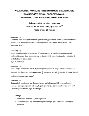 WOJEWÓDZKI KONKURS PRZEDMIOTOWY z MATEMATYKI DLA UCZNIÓW SZKÓŁ PODSTAWOWYCH WOJEWÓDZTWA KUJAWSKO-POMORSKIEGO Arkusz zadań na etap rejonowy Termin: 16.12.2010 roku, godzina 1500 Czas pracy: 90 minut Zadanie 1 (0 - 6) Z liczb od 1 do 256 wyrzucono wszystkie liczby podzielne przez 2, ale niepodzielne przez 5 oraz wszystkie liczby podzielne przez 5, ale niepodzielne przez 2. Ile pozostało liczb?. Zadanie 2 (0 - 6) Janek dostał pudełko czekoladek. W pierwszym dniu zjadł połowę zawartości pudełka i jeszcze dwie czekoladki, a w drugim 25% pozostałej części i ostatnie 12 czekoladek. Ile czekoladek było w pudełku? Zadanie 3 (0 - 6) Jedna ekipa budowlana może wykonać pewną pracę w ciągu 30 dni, a druga – w ciągu 40 dni. Do pracy oddelegowano 3 2 pierwszej ekipy i drugiej. W ciągu ilu dni 4 3 będzie wykonana cała praca? Zadanie 4 (0 - 6) Dłuższy bok prostokąta jest 3 razy większy od krótszego. Gdybyśmy długość każdego boku powiększyli o 2 cm, to pole prostokąta powiększyłoby się o 44 cm 2. Oblicz długości boków tego prostokąta. Uwaga 1. Wszystkie zadania są obowiązkowe. 2. Zakwalifikujesz się do etapu wojewódzkiego, jeśli uzyskasz 18 i więcej punktów.