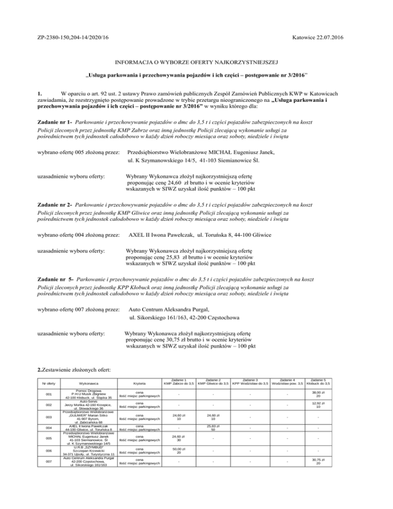 ZP-2380-150,204-14/2020/16 Katowice 22.07.2016 INFORMACJA O WYBORZE OFERTY NAJKORZYSTNIEJSZEJ „Usługa parkowania i przechowywania pojazdów i ich części – postępowanie nr 3/2016” 1. W oparciu o art. 92 ust. 2 ustawy Prawo zamówień publicznych Zespół Zamówień Publicznych KWP w Katowicach zawiadamia, że rozstrzygnięto postępowanie prowadzone w trybie przetargu nieograniczonego na „Usługa parkowania i przechowywania pojazdów i ich części – postępowanie nr 3/2016” w wyniku którego dla: Zadanie nr 1- Parkowanie i przechowywanie pojazdów o dmc do 3,5 t i części pojazdów zabezpieczonych na koszt Policji zleconych przez jednostkę KMP Zabrze oraz inną jednostkę Policji zlecającą wykonanie usługi za pośrednictwem tych jednostek całodobowo w każdy dzień roboczy miesiąca oraz soboty, niedziele i święta wybrano ofertę 005 złożoną przez: Przedsiębiorstwo Wielobranżowe MICHAŁ Eugeniusz Janek, ul. K Szymanowskiego 14/5, 41-103 Siemianowice Śl. uzasadnienie wyboru oferty: Wybrany Wykonawca złożył najkorzystniejszą ofertę proponując cenę 24,60 zł brutto i w ocenie kryteriów wskazanych w SIWZ uzyskał ilość punktów – 100 pkt Zadanie nr 2- Parkowanie i przechowywanie pojazdów o dmc do 3,5 t i części pojazdów zabezpieczonych na koszt Policji zleconych przez jednostkę KMP Gliwice oraz inną jednostkę Policji zlecającą wykonanie usługi za pośrednictwem tych jednostek całodobowo w każdy dzień roboczy miesiąca oraz soboty, niedziele i święta wybrano ofertę 004 złożoną przez: uzasadnienie wyboru oferty: AXEL II Iwona Pawełczak, ul. Toruńska 8, 44-100 Gliwice Wybrany Wykonawca złożył najkorzystniejszą ofertę proponując cenę 25,83 zł brutto i w ocenie kryteriów wskazanych w SIWZ uzyskał ilość punktów – 100 pkt Zadanie nr 5- Parkowanie i przechowywanie pojazdów o dmc do 3,5 t i części pojazdów zabezpieczonych na koszt Policji zleconych przez jednostkę KPP Kłobuck oraz inną jednostkę Policji zlecającą wykonanie usługi za pośrednictwem tych jednostek całodobowo w każdy dzień roboczy miesiąca oraz soboty, niedziele i święta wybrano ofertę 007 złożoną przez: uzasadnienie wyboru oferty: Auto Centrum Aleksandra Purgal, ul. Sikorskiego 161/163, 42-200 Częstochowa Wybrany Wykonawca złożył najkorzystniejszą ofertę proponując cenę 30,75 zł brutto i w ocenie kryteriów wskazanych w SIWZ uzyskał ilość punktów – 100 pkt 2.Zestawienie złożonych ofert: Nr oferty 001 002 003 004 005 006 007 Wykonawca Pomoc Drogowa P.H.U Musik Zbigniew 42-100 Kłobuck, ul. Śląska 35 Auto-Servis Jerzy Mońka 42-160 Krzepice, ul. Słowackiego 36 Przedsiębiorstwo Wielobranżowe „GULIWER” Marian Sitko 41-907 Bytom, ul. Zabrzańska 68 AXEL II Iwona Pawełczak 44-100 Gliwice, ul. Toruńska 8 Przedsiębiorstwo Wielobranżowe MICHAŁ Eugeniusz Janek 41-103 Siemianowice. Śl ul. K Szymanowskiego 14/5 U.R.B „SZYMBUD” Szczepan Krzewicki 34-371 Ujsoły, ul. Turystyczna 11 Auto Centrum Aleksandra Purgal 42-200 Częstochowa, ul. Sikorskiego 161/163 Zadanie 1 KMP Zabrze do 3,5 Zadanie 2 KMP Gliwice do 3,5 Zadanie 3 KPP Wodzisław do 3,5 Zadanie 4 Wodzisław pow. 3,5 Zadanie 5 Kłobuck do 3,5 cena Ilość miejsc parkingowych - - - - 38,00 zł 20 cena Ilość miejsc parkingowych - - - - 12,92 zł 10 cena Ilość miejsc parkingowych 24,60 zł 10 24,60 zł 10 - - - cena Ilość miejsc parkingowych - 25,83 zł 50 - - - cena Ilość miejsc parkingowych 24,60 zł 30 - - - - cena Ilość miejsc parkingowych 50,00 zł 20 - - - - - 30,75 zł 20 Kryteria cena Ilość miejsc parkingowych - - - 3.Streszczenie ofert: Nr oferty 001 002 003 004 005 006 007 Wykonawca Kryteria Pomoc Drogowa P.H.U Musik Zbigniew 42-100 Kłobuck, ul. Śląska 35 Auto-Servis Jerzy Mońka 42-160 Krzepice, ul. Słowackiego 36 Przedsiębiorstwo Wielobranżowe „GULIWER” Marian Sitko 41-907 Bytom, ul. Zabrzańska 68 cena Ilość miejsc parkingowych SUMA cena Ilość miejsc parkingowych SUMA cena Ilość miejsc parkingowych AXEL II Iwona Pawełczak 44-100 Gliwice, ul. Toruńska 8 Przedsiębiorstwo Wielobranżowe MICHAŁ Eugeniusz Janek 41-103 Siemianowice. Śl ul. K Szymanowskiego 14/5 U.R.B „SZYMBUD” Szczepan Krzewicki 34-371 Ujsoły, ul. Turystyczna 11 Auto Centrum Aleksandra Purgal 42-200 Częstochowa, ul. Sikorskiego 161/163 Wykonano w 1 egz.A.N zamieszczono na BIP Zadanie 1 KMP Zabrze do 3,5 Zadanie 2 KMP Gliwice do 3,5 Zadanie 3 KPP Wodzisław do 3,5 Zadanie 4 Wodzisław pow. 3,5 - - - - - - - - - - - - - - - - - - - - - - - - - - - - SUMA cena Ilość miejsc parkingowych SUMA - cena Ilość miejsc parkingowych 90 pkt 10 pkt SUMA 100 pkt cena Ilość miejsc parkingowych SUMA cena Ilość miejsc parkingowych SUMA 44,28 pkt 6,67 pkt 50,95 pkt - 90 pkt 10 pkt 100pkt Zadanie 5 Kłobuck do 3,5 72,83 pkt 10 pkt 82,83 pkt 90 pkt 10 pkt 100 pkt