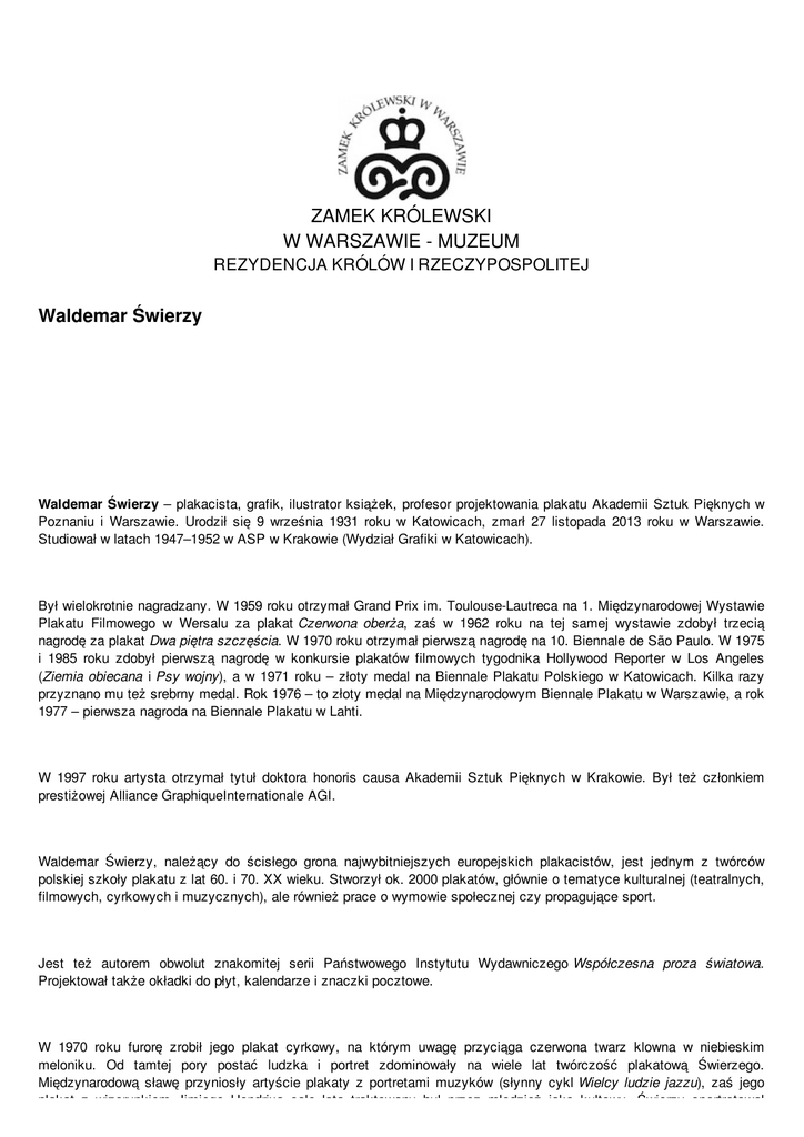 ZAMEK KRÓLEWSKI W WARSZAWIE - MUZEUM REZYDENCJA KRÓLÓW I RZECZYPOSPOLITEJ Waldemar Świerzy Waldemar Świerzy – plakacista, grafik, ilustrator książek, profesor projektowania plakatu Akademii Sztuk Pięknych w Poznaniu i Warszawie. Urodził się 9 września 1931 roku w Katowicach, zmarł 27 listopada 2013 roku w Warszawie. Studiował w latach 1947–1952 w ASP w Krakowie (Wydział Grafiki w Katowicach). Był wielokrotnie nagradzany. W 1959 roku otrzymał Grand Prix im. Toulouse-Lautreca na 1. Międzynarodowej Wystawie Plakatu Filmowego w Wersalu za plakat Czerwona oberża, zaś w 1962 roku na tej samej wystawie zdobył trzecią nagrodę za plakat Dwa piętra szczęścia. W 1970 roku otrzymał pierwszą nagrodę na 10. Biennale de São Paulo. W 1975 i 1985 roku zdobył pierwszą nagrodę w konkursie plakatów filmowych tygodnika Hollywood Reporter w Los Angeles (Ziemia obiecana i Psy wojny), a w 1971 roku – złoty medal na Biennale Plakatu Polskiego w Katowicach. Kilka razy przyznano mu też srebrny medal. Rok 1976 – to złoty medal na Międzynarodowym Biennale Plakatu w Warszawie, a rok 1977 – pierwsza nagroda na Biennale Plakatu w Lahti. W 1997 roku artysta otrzymał tytuł doktora honoris causa Akademii Sztuk Pięknych w Krakowie. Był też członkiem prestiżowej Alliance GraphiqueInternationale AGI. Waldemar Świerzy, należący do ścisłego grona najwybitniejszych europejskich plakacistów, jest jednym z twórców polskiej szkoły plakatu z lat 60. i 70. XX wieku. Stworzył ok. 2000 plakatów, głównie o tematyce kulturalnej (teatralnych, filmowych, cyrkowych i muzycznych), ale również prace o wymowie społecznej czy propagujące sport. Jest też autorem obwolut znakomitej serii Państwowego Instytutu Wydawniczego Współczesna proza światowa. Projektował także okładki do płyt, kalendarze i znaczki pocztowe. W 1970 roku furorę zrobił jego plakat cyrkowy, na którym uwagę przyciąga czerwona twarz klowna w niebieskim meloniku. Od tamtej pory postać ludzka i portret zdominowały na wiele lat twórczość plakatową Świerzego. Międzynarodową sławę przyniosły artyście plakaty z portretami muzyków (słynny cykl Wielcy ludzie jazzu), zaś jego plakat z wizerunkiem Jimiego Hendrixa całe lata traktowany był przez młodzież jako kultowy. Świerzy sportretował plakat z wizerunkiem Jimiego Hendrixa całe lata traktowany był przez młodzież jako kultowy. Świerzy sportretował łącznie ponad 250 różnych postaci. Forma portretu stała się dla Świerzego niewyczerpanym źródłem inspiracji. Artysta nie skupiał się na głębi psychologicznej modela, wydobywał z niego zaledwie kilka charakterystycznych rysów i za pomocą metafory opisywał jego zawód czy twórczość. Tworząc wizerunki polskich władców, artysta zapowiadał, że nie będą one idealizowane, jak w Poczcie Matejki, lecz stanowić będą rodzaj studiów psychologicznych, ukazujących ich jako ludzi z krwi i kości, namiętnych i nierzadko okrutnych. Matejkowski Poczet tak się przyjął, że dziś nie wyobrażamy sobie innego. A ja postanowiłem go sobie wyobrazić. Chciałem mieć na obrazach prawdziwych ludzi – mówił. Zamek Królewski w Warszawie - Muzeum. Rezydencja Królów i Rzeczypospolitej www.zamek-krolewski.pl