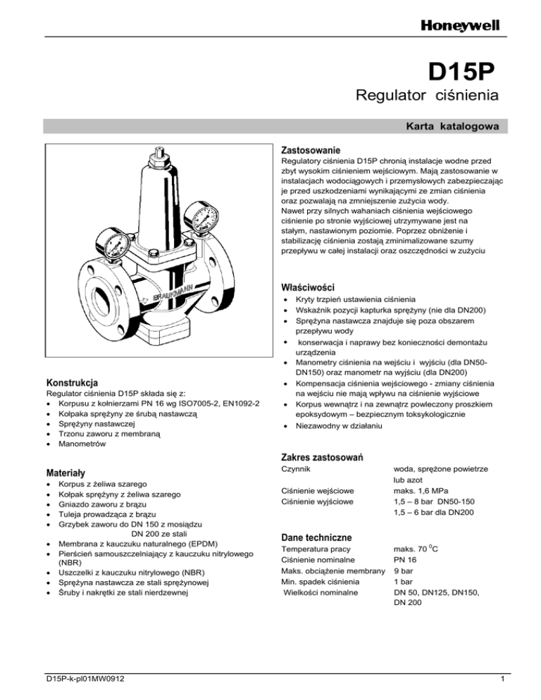 D15P Regulator ciśnienia Karta katalogowa Zastosowanie Regulatory ciśnienia D15P chronią instalacje wodne przed zbyt wysokim ciśnieniem wejściowym. Mają zastosowanie w instalacjach wodociągowych i przemysłowych zabezpieczając je przed uszkodzeniami wynikającymi ze zmian ciśnienia oraz pozwalają na zmniejszenie zużycia wody. Nawet przy silnych wahaniach ciśnienia wejściowego ciśnienie po stronie wyjściowej utrzymywane jest na stałym, nastawionym poziomie. Poprzez obniżenie i stabilizację ciśnienia zostają zminimalizowane szumy przepływu w całej instalacji oraz oszczędności w zużyciu Właściwości Kryty trzpień ustawienia ciśnienia Wskaźnik pozycji kapturka sprężyny (nie dla DN200) Sprężyna nastawcza znajduje się poza obszarem przepływu wody konserwacja i naprawy bez konieczności demontażu urządzenia Manometry ciśnienia na wejściu i wyjściu (dla DN50DN150) oraz manometr na wyjściu (dla DN200) Kompensacja ciśnienia wejściowego - zmiany ciśnienia na wejściu nie mają wpływu na ciśnienie wyjściowe Korpus wewnątrz i na zewnątrz powleczony proszkiem epoksydowym – bezpiecznym toksykologicznie Konstrukcja Regulator ciśnienia D15P składa się z: Korpusu z kołnierzami PN 16 wg ISO7005-2, EN1092-2 Kołpaka sprężyny ze śrubą nastawczą Sprężyny nastawczej Trzonu zaworu z membraną Manometrów Niezawodny w działaniu Zakres zastosowań Materiały Korpus z żeliwa szarego Kołpak sprężyny z żeliwa szarego Gniazdo zaworu z brązu Tuleja prowadząca z brązu Grzybek zaworu do DN 150 z mosiądzu DN 200 ze stali Membrana z kauczuku naturalnego (EPDM) Pierścień samouszczelniający z kauczuku nitrylowego (NBR) Uszczelki z kauczuku nitrylowego (NBR) Sprężyna nastawcza ze stali sprężynowej Śruby i nakrętki ze stali nierdzewnej D15P-k-pl01MW0912 Czynnik Ciśnienie wejściowe Ciśnienie wyjściowe woda, sprężone powietrze lub azot maks. 1,6 MPa 1,5 – 8 bar DN50-150 1,5 – 6 bar dla DN200 Dane techniczne Temperatura pracy Ciśnienie nominalne Maks. obciążenie membrany Min. spadek ciśnienia Wielkości nominalne maks. 70 0C PN 16 9 bar 1 bar DN 50, DN125, DN150, DN 200 1 Zasada działania Regulator ciśnienia działa na zasadzie równowagi sił działających na membranę: z jednej strony wynikającej z napięcia sprężyny, a z drugiej strony sił parcia od ciśnienia po redukcji. W przypadku występowania zmiennego ciśnienia wejściowego ruchomy wkład zaworu ustawia się w nowe położenie równowagi dla danej nastawy ciśnienia i ilości odbieranej wody (kompensacja ciśnienia wejściowego). W przypadku ustania poboru wody - zawór całkowicie się domyka. Oznaczenia: D15P-….A = z kołnierzami PN 16 wg ISO7005-2, EN1092-2, korpus z żeliwa szarego Wielkość przyłącza DN Wersje specjalne na życzenie Wielkość przyłącza DN 50 125 150 200 Ciężar (w przybliżeniu) (kg) 16,2 103 150 408 L 230 400 480 600 H 282 487 573 1200 h 106 210 248 305 F 165 250 285 340 28 180 250 380 Wymiary (mm) Wartość kvs Akcesoria RV283P FY69P RV283P FY69P F76S-F F 76S-F 2 Zawór zwrotny antyskażeniowy Korpus z żeliwa szarego, powlekany materiałem syntetycznym Filtr do wody z podwójną siatką, korpus z żeliwa szarego A = wielkość siatki ok. 0,5 mm Filtr płukania wstecznego Korpus i obudowa z mosiądzu, rozmiary od DN65 do 100 z siatką 100 lub 200 m Przykład instalacji Wielkości przyłączy W* * DN (mm) 50 100 125 165 150 180 200 220 Minimalna odległość od ściany do osi przewodu Zasady instalacji Typowe zastosowania Regulatory ciśnienia są przeznaczone do wszystkich typów instalacji wodnych. Mogą być montowane również w instalacjach przemysłowych zgodnie ze swoim przeznaczeniem i z uwzględnieniem parametrów technicznych. Montować na poziomym odcinku instalacji, kołpakiem sprężyny skierowanym ku górze Zamontować zawory odcinające Zapewnić dostęp do urządzenia, tak aby: umożliwić łatwy odczyt na manometrach ułatwić serwis i kontrolę W instalacji przed regulatorem należy montować filtr skośny lub drobnosiatkowy zachowanie optymalnego zabezpieczenia regulatora przed zanieczyszczeniem Zalecany jest prosty odcinek rury za regulatorem o długości conajmniej 5 razy większej od średnicy nominalnej (zgodnie z DIN 1988, Część 5). Regulator ciśnienia powinien być instalowany: Gdy ciśnienie statyczne przekracza maksymalne, dopuszczalne ciśnienie w instalacji W przypadku podziału instalacji na strefy ciśnienia np. na każdym piętrze budynku wielopiętrowego Gdy należy unikać zmian ciśnienia w instalacji Gdy w instalacji znajdują się urządzenia, które muszą być chronione przed nadmiernym ciśnieniem zasilania Aby zredukować zużycie wody Nomogram przepływu 3 Części zamienne dla regulatora ciśnienia D15P (produkowany od 2003r.) Opis Wielkość Numer nominalna części DN 50 DN 65 DN 80 DN 100 DN 125 DN 150 DN 200 5707300 5707400 5707500 5707600 5707700 5707800 5707900 2 Komplet uszczelek DN 50 DN 65 DN 80 DN 100 DN 125 DN 150 DN 200 0901353 0901354 0901355 0901356 0901357 0901358 0901359 3 Tuleja prowadnicy z DN 50 DN 65 DN 80 DN 100 DN 125 DN 150 DN 200 0900255 0900256 0900257 0900258 0900259 0900260 0900261 DN 50 DN 65 DN 80 DN 100 DN 125 DN 150 DN 200 0900247 0900248 0900249 0900250 0900251 0900252 0900253 1 Membrana 1 pierścieniem uszczeln. 4 Tuleja gniazda z pierścieniem uszczelniającym 1 5 Manometr zakres 0-16 bar M38M-A16 6 Manometr zakres 0-10 bar M38M-A10 7 Manometr zakres 0-10 bar M07M-A10 Honeywell Sp. z o. o. ul. Domaniewska 39b, 02-672 WARSZAWA (48)(22) 606 09 00; Fax (48)(22) 606 09 83 http://www.honeywell.com.pl/automatyka_domow 4 D15P-k-pl01MW0912