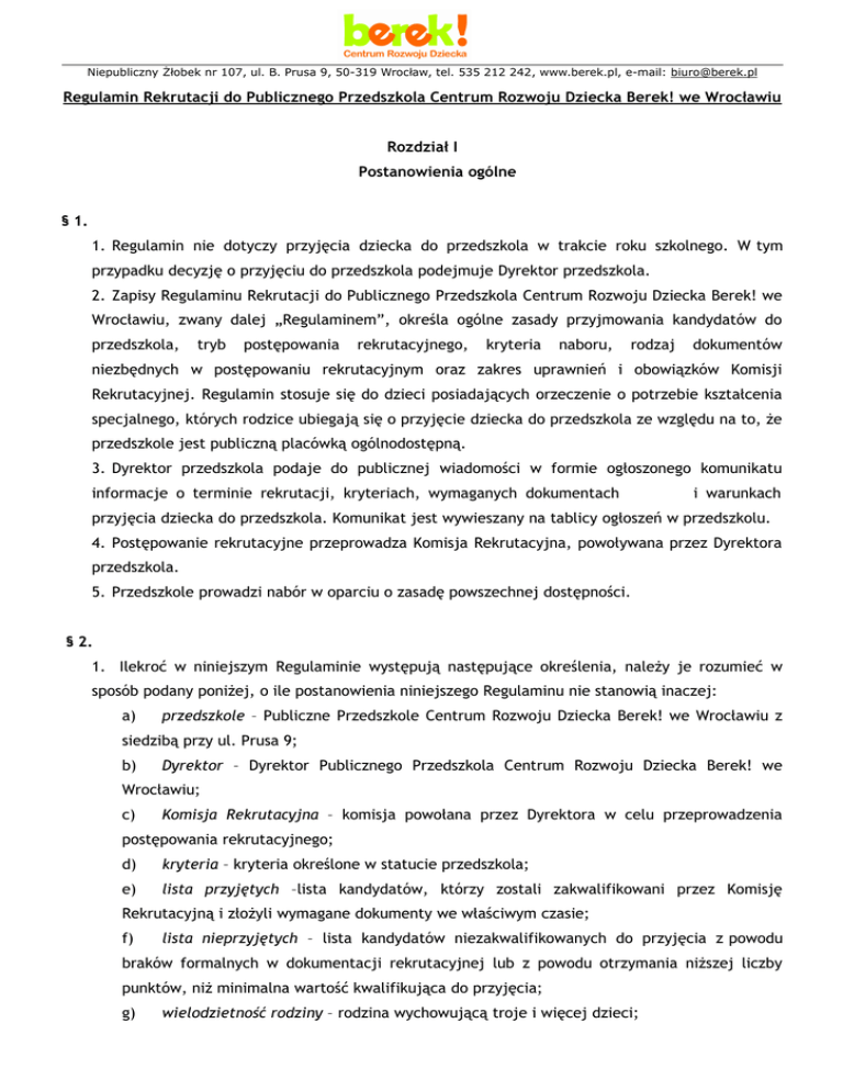 Niepubliczny Żłobek nr 107, ul. B. Prusa 9, 50-319 Wrocław, tel. 535 212 242, www.berek.pl, e-mail: [email protected] Regulamin Rekrutacji do Publicznego Przedszkola Centrum Rozwoju Dziecka Berek! we Wrocławiu Rozdział I Postanowienia ogólne § 1. 1. Regulamin nie dotyczy przyjęcia dziecka do przedszkola w trakcie roku szkolnego. W tym przypadku decyzję o przyjęciu do przedszkola podejmuje Dyrektor przedszkola. 2. Zapisy Regulaminu Rekrutacji do Publicznego Przedszkola Centrum Rozwoju Dziecka Berek! we Wrocławiu, zwany dalej „Regulaminem”, określa ogólne zasady przyjmowania kandydatów do przedszkola, tryb postępowania rekrutacyjnego, kryteria naboru, rodzaj dokumentów niezbędnych w postępowaniu rekrutacyjnym oraz zakres uprawnień i obowiązków Komisji Rekrutacyjnej. Regulamin stosuje się do dzieci posiadających orzeczenie o potrzebie kształcenia specjalnego, których rodzice ubiegają się o przyjęcie dziecka do przedszkola ze względu na to, że przedszkole jest publiczną placówką ogólnodostępną. 3. Dyrektor przedszkola podaje do publicznej wiadomości w formie ogłoszonego komunikatu informacje o terminie rekrutacji, kryteriach, wymaganych dokumentach i warunkach przyjęcia dziecka do przedszkola. Komunikat jest wywieszany na tablicy ogłoszeń w przedszkolu. 4. Postępowanie rekrutacyjne przeprowadza Komisja Rekrutacyjna, powoływana przez Dyrektora przedszkola. 5. Przedszkole prowadzi nabór w oparciu o zasadę powszechnej dostępności. § 2. 1. Ilekroć w niniejszym Regulaminie występują następujące określenia, należy je rozumieć w sposób podany poniżej, o ile postanowienia niniejszego Regulaminu nie stanowią inaczej: a) przedszkole – Publiczne Przedszkole Centrum Rozwoju Dziecka Berek! we Wrocławiu z siedzibą przy ul. Prusa 9; b) Dyrektor – Dyrektor Publicznego Przedszkola Centrum Rozwoju Dziecka Berek! we Wrocławiu; c) Komisja Rekrutacyjna – komisja powołana przez Dyrektora w celu przeprowadzenia postępowania rekrutacyjnego; d) kryteria – kryteria określone w statucie przedszkola; e) lista przyjętych –lista kandydatów, którzy zostali zakwalifikowani przez Komisję Rekrutacyjną i złożyli wymagane dokumenty we właściwym czasie; f) lista nieprzyjętych – lista kandydatów niezakwalifikowanych do przyjęcia z powodu braków formalnych w dokumentacji rekrutacyjnej lub z powodu otrzymania niższej liczby punktów, niż minimalna wartość kwalifikująca do przyjęcia; g) wielodzietność rodziny – rodzina wychowującą troje i więcej dzieci; Niepubliczny Żłobek nr 107, ul. B. Prusa 9, 50-319 Wrocław, tel. 535 212 242, www.berek.pl, e-mail: [email protected] h) samotne wychowanie dziecka – należy przez to rozumieć, że dziecko jest wychowywane przez pannę, kawalera, wdowę, wdowca, osobę pozostającą w separacji orzeczonej prawomocnym wyrokiem sadu, osobę rozwiedzioną, chyba, że osoba taka wychowuje wspólnie co najmniej jedno dziecko z jego rodzicem; i) wniosek o przyjęcie –dokument opracowany na potrzeby rekrutacji do Publicznego Przedszkola Centrum Rozwoju Dziecka Berek! we Wrocławiu. Rozdział II Zasady rekrutacji § 3. 1. Do przedszkola przyjmowane w roku szkolnym 2016/2017 przyjmowane są: a) dzieci w wieku od 3 do 5 lat (roczniki 2013-2010), b) w wyjątkowych wypadkach może być przyjęte dziecko 2,5 – letnie. 2. Podstawą udziału w postępowaniu rekrutacyjnym jest złożenie zgłoszenia lub wniosku, który można pobrać bezpośrednio w placówce oraz na stronie internetowej www.berek.pl 3. Wnioski złożone po terminie nie będą rozpatrywane. 4. Wnioski niekompletne, wypełnione nieprawidłowo nie będą rozpatrywane. 5. Po ogłoszeniu wyniku rodzic dziecka zobowiązany jest do podpisania umowy, w sprawie świadczenia usług przez przedszkole na dany rok szkolny, w terminie wyznaczonym przez Dyrektora. § 4. 1. Postępowanie rekrutacyjne składa się z następujących etapów: a) postępowanie rekrutacyjne przeprowadzane jest przez Komisję Rekrutacyjną, b) podanie do publicznej wiadomości, poprzez umieszczenie w widocznym miejscu w siedzibie przedszkola listy kandydatów przyjętych i nieprzyjętych do przedszkola, c) potwierdzenie przez rodziców/opiekunów dzieci z listy kandydatów przyjętych wyboru placówki, d) postępowanie odwoławcze, e) postępowanie uzupełniające, w przypadku, gdy po przeprowadzeniu podstawowej rekrutacji przedszkole dysponuje nadal wolnymi miejscami. § 5. 1. Komisja Rekrutacyjna przeprowadza postępowanie rekrutacyjne na podstawie następujących kryteriów pierwszeństwa przyjęcia wynikających z Ustawy o Systemie Oświaty (Dz.U. z 2015 r., poz. 2156 ze zm.): Niepubliczny Żłobek nr 107, ul. B. Prusa 9, 50-319 Wrocław, tel. 535 212 242, www.berek.pl, e-mail: [email protected] a) wielodzietność rodziny kandydata (50 pkt.) b) niepełnosprawność kandydata (50 pkt.) c) niepełnosprawność jednego z rodziców kandydata (50 pkt.) d) niepełnosprawność obojga rodziców kandydata (50 pkt.) e) niepełnosprawność rodzeństwa kandydata (50 pkt.) f) samotne wychowywanie dziecka w rodzinie (50 pkt.) g) objęcie kandydata pieczą zastępczą (50 pkt.) 2. W przypadku uzyskania przez większą ilość kandydatów tej samej ilości punktów bierze się pod uwagę kryteria dodatkowe ustalone przez przedszkole, zawarte w punkcie 3 ustępu 5 niniejszego regulaminu. 3. Kryteria dodatkowe brane pod uwagę w rekrutacji: a) dziecko uczęszczające do żłobka Centrum Rozwoju Dziecka Berek! w roku szkolnym 2015/2016 - 50 pkt. b) rodzeństwo dziecka uczęszczającego do żłobka/przedszkola CRD Berek! w roku szkolnym 2015/2016 - 30 pkt. c) dziecko uczęszczające na zajęcia dodatkowe w Centrum Rozwoju Dziecka Berek! w roku szkolnym 2015/2016 - 10 pkt. d) praca lub studia dzienne jednego z rodziców kandydata – 10 pkt. e) praca lub studia dzienne obojga rodziców kandydata – 20 pkt. 4. Publikacja wyników naboru odbędzie się nie później niż do 1 kwietnia 
