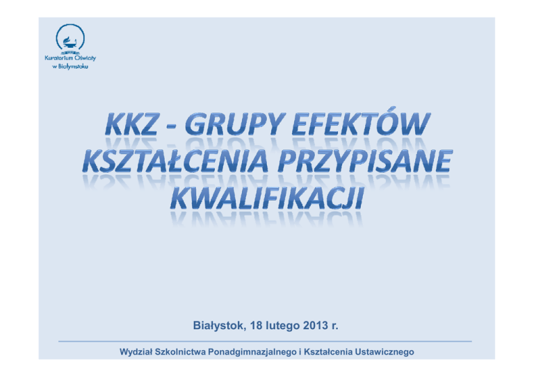Białystok, 18 lutego 2013 r. Wydział Szkolnictwa Ponadgimnazjalnego i Kształcenia Ustawicznego Obszary kształcenia 1) A – administracyjno‐usługowy; 2) B – budowlany; 3) E – elektryczno‐elektroniczny; 4) M – mechaniczny i górniczo‐hutniczy; 5) R – rolniczo‐leśny z ochroną środowiska; 6) T – turystyczno‐gastronomiczny; 7) Z – medyczno‐społeczny; 8) S – artystyczny. Wydział Szkolnictwa Ponadgimnazjalnego i Kształcenia Ustawicznego KKZ – Efekty (wybrane pojęcia związane z kształceniem zawodowym) Kwalifikacja w zawodzie Należy przez to rozumieć wyodrębniony w danym zawodzie zestaw oczekiwanych efektów kształcenia, których osiągnięcie potwierdza świadectwo wydane przez okręgową komisję egzaminacyjną, po zdaniu egzaminu potwierdzającego kwalifikacje w zawodzie w zakresie jednej kwalifikacji. Wydział Szkolnictwa Ponadgimnazjalnego i Kształcenia Ustawicznego Efekty ‐ (wybrane pojęcia związane z kształceniem zawodowym) c.d. Efekty kształcenia To, co osoba uczestnicząca w procesie kształcenia prowadzonym przez instytucję edukacyjną lub szkoleniową wie, rozumie i potrafi wykonać po jego zakończeniu, ujęte w kategoriach wiedzy, umiejętności oraz kompetencji personalnych i społecznych. Wydział Szkolnictwa Ponadgimnazjalnego i Kształcenia Ustawicznego Efekty kształcenia wspólne dla wszystkich zawodów - BHP – bezpieczeństwo i higiena pracy; - PDG – podejmowanie i prowadzenie działalności gospodarczej; - JOZ – język obcy ukierunkowany zawodowo; - KPS – kompetencje personalne i społeczne; - OMZ – organizacja pracy małych zespołów Wydział Szkolnictwa Ponadgimnazjalnego i Kształcenia Ustawicznego Kompetencje personalne i społeczne Zdolność do autonomicznego i odpowiedzialnego wykonywania powierzonych zadań; gotowość do uczenia się przez całe życie; sprawność komunikowania się; umiejętność współdziałania z innymi w roli zarówno członka jak i lidera zespołu. Wydział Szkolnictwa Ponadgimnazjalnego i Kształcenia Ustawicznego Efekty kształcenia wspólne dla zawodów w ramach obszaru kształcenia Przykład: PKZ (A.c), gdzie litera A, wskazuje na obszar administracyjno‐usługowy, litera c wskazuje efekty kształcenia wspólne dla grupy zawodów w ramach obszaru kształcenia. Wydział Szkolnictwa Ponadgimnazjalnego i Kształcenia Ustawicznego Efekty kształcenia właściwe dla kwalifikacji Przykład oznaczenia: A.4., gdzie litera A wskazuje obszar administracyjno ‐ usługowy, a liczba 4 jest (kolejną) liczbą porządkową, w tym przypadku dla kwalifikacji „Wytwarzanie wyrobów włókienniczych”. Wydział Szkolnictwa Ponadgimnazjalnego i Kształcenia Ustawicznego Kursy umiejętności zawodowych Część zestawu oczekiwanych efektów kształcenia właściwych dla danej kwalifikacji. Wydział Szkolnictwa Ponadgimnazjalnego i Kształcenia Ustawicznego 3 rodzaje kursów umiejętności zawodowych 1. W zakresie jednej z części efektów kształcenia wyodrębnionych w ramach danej kwalifikacji. 2. W zakresie efektów kształcenia wspólnych dla wszystkich zawodów oraz wspólnych dla zawodów w ramach obszaru kształcenia stanowiących podbudowę do kształcenia w zawodzie lub grupie zawodów. 3. W zakresie efektów kształcenia wspólnych dla wszystkich zawodów w zakresie organizacji pracy małych zespołów. Wydział Szkolnictwa Ponadgimnazjalnego i Kształcenia Ustawicznego Przykład: Kursy umiejętności zawodowych (1) – Kwalifikacja T.15. Organizacja żywienia i usług gastronomicznych, wyodrębniona w zawodzie technik żywienia i usług gastronomicznych, minimalna liczba godzin kształcenia zawodowego – 300 godz. Kursy umiejętności zawodowych: 1. Planowanie i ocena żywienia – 100 godz. 2. Organizowanie produkcji gastronomicznej – 100 godz. 3. Planowanie i wykonywanie usług gastronomicznych – 100 godz. Wydział Szkolnictwa Ponadgimnazjalnego i Kształcenia Ustawicznego KKZ - od sprzedawcy do technika handlowca ‐ przykład: Zawód: - sprzedawca, jedna kwalifikacja A.18. - technik handlowiec, dwie kwalif. A.18., A.22. - technik księgarstwa, dwie kwalif. A.18., A.21. A.18. - prowadzenie sprzedaży - PKZ(A.j) A.21. - Prowadzenie działalności informacyjnobibliograficznej A.22. - Prowadzenie działalności handlowej A.21. i A.22. – OMZ PKZ(A.j) PKZ(A.m) Wydział Szkolnictwa Ponadgimnazjalnego i Kształcenia Ustawicznego Posiadany zawód i wykształcenie sprzedawca wykształcenie zasadnicze zawodowe Efekty kształcenia określone dla zawodu sprzedawca, w którym wyodrębniona została jedna kwalifikacja A.18. Efekty kształcenia określone dla kwalifikacji A.22. wyodrębnionej w zawodzie technik handlowiec Efekty kształcenia, z których uczestnik kursu może być zwolniony BHP BHP BHP PDG PDG PDG JOZ JOZ KPS KPS JOZ KPS OMZ PKZ(A.j) A.18. PKZ(A.j) Efekty kształcenia, które realizuje uczestnik kursu OMZ PKZ(A.j) PKZ(A.m) PKZ(A.m) A.22. A.22. Posiadany zawód i wykształcenie sprzedawca wykształcenie zasadnicze zawodowe Efekty kształcenia określone dla zawodu sprzedawca, w którym wyodrębniona została jedna kwalifikacja A.18. Efekty kształcenia określone dla kwalifikacji A.19. wyodrębnionej w zawodzie fryzjer BHP BHP BHP PDG PDG PDG JOZ JOZ JOZ KPS KPS KPS PKZ(A.j) PKZ(A.k) PKZ(A.k) A.18. A.19. Efekty kształcenia, z których uczestnik kursu może być zwolniony Efekty kształcenia, które realizuje uczestnik kursu A.19. Ukończyła szkołę i uzyskała wykształcenie liceum profilowane profil: ekonomiczno‐ administra‐cyjny wykształcenie średnie oraz przygotowanie ogólnozawodowe związane z ukończonym Efekty kształcenia zrealizowane w dotychczaso‐wym procesie kształcenia Efekty kształcenia określone dla kwalifikacji A.18. wyodrębnionej w zawodzie sprzedawca BHP BHP BHP PDG PDG PDG Efekty kształcenia, z których uczestnik kursu może być zwolniony JOZ Efekty kształcenia, które realizuje uczestnik kursu JOZ KPS KPS KPS PKZ(A.j) PKZ(A.j) PKZ(A.