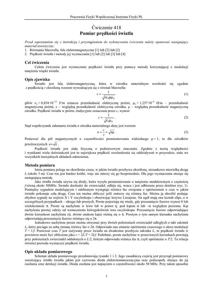 Pracownia Fizyki Współczesnej Instytutu Fizyki PŁ Ćwiczenie 418 Pomiar prędkości światła Przed zapoznaniem się z instrukcją i przystąpieniem do wykonywania ćwiczenia należy opanować następujący materiał teoretyczny: 1. Równania Maxwella, fale elektromagnetyczne [1] lub [2] lub [3] 2. Prędkość światła i metody jej wyznaczania [1] lub [2] lub [3] lub [4] Cel ćwiczenia Celem ćwiczenia jest wyznaczenie prędkości światła przy pomocy metody korzystającej z modulacji natężenia wiązki światła. Opis zjawiska Światło jest falą elektromagnetyczną, która w ośrodku z prędkością v określoną wzorem wywodzącym się z równań Maxwella: 1 v= εε 0µµ 0 materialnym rozchodzi się zgodnie (1) gdzie εo = 8,854·10−12 F/m oznacza przenikalność elektryczną próżni, µo = 1,257·10−6 H/m – przenikalność magnetyczną próżni, ε – względną przenikalność elektryczną ośrodka, µ – względną przenikalność magnetyczną ośrodka. Prędkość światła w próżni, tradycyjnie oznaczana przez c, wynosi 1 c= . (2) ε 0µ 0 Stąd współczynnik załamania światła n ośrodka materialnego dany jest wzorem c n = = εµ . (3) v Ponieważ dla pól magnetycznych o częstotliwości promieniowania widzialnego µ = 1, to dla ośrodków przeźroczystych n = ε . Prędkość światła jest stałą fizyczną o podstawowym znaczeniu. Zgodnie z teorią względności i wynikami wielu doświadczeń jest to największa prędkość rozchodzenia się oddziaływań w przyrodzie, stała we wszystkich inercjalnych układach odniesienia. Metoda pomiaru Istota pomiaru polega na określeniu czasu, w jakim światło przebywa określoną, stosunkowo niewielką drogę L (około 3 m). Czas ten jest bardzo krótki, więc nie mierzy się go bezpośrednio. Dla jego wyznaczenia stosuje się następującą metodę. Jako źródła światła używa się diody, która wysyła promieniowanie o natężeniu modulowanym z częstością f równą około 50MHz. Światło dochodzi do zwierciadeł, odbija się, wraca i jest odbierane przez detektor (rys. 1). Pomiędzy sygnałem modulującym i odebranym występuje różnica faz związana z opóźnieniem o czas w jakim światło pokonuje całą drogę. Czas ten można obliczyć jeśli zmierzy się różnicę faz. Można ją określić podając obydwa sygnały na wejścia X i Y oscyloskopu i obserwując krzywe Lissajous. Na ogół mają one kształt elips, a w szczególnych przypadkach – okręgu lub prostych. Proste pojawiają się wtedy, gdy przesunięcie fazowe wynosi 0 lub wielokrotność π. Proste są nachylone w lewo lub w prawo tj. pod kątem α lub –α względem poziomu. Kąt nachylenia prostej zależy od wzmocnienia któregokolwiek toru oscyloskopu. Przesunięcia fazowe odpowiadające dwóm kierunkom nachylenia (tj. dwóm znakom kąta) różnią się o π. Prostym o tym samym kierunku nachylenia odpowiadają przesunięcia fazowe różniące się o 2π. Jednakowo nachylone proste można otrzymać przy dwóch położeniach zwierciadeł odległych o taki odcinek L, który pociąga za sobą zmianę różnicy faz o 2π. Odpowiada ona zmianie opóźnienia czasowego o okres modulacji T = 1/f. Ponieważ czas T jest zużywany przez światło na dwukrotne przebycie odcinka L, to prędkość światła w powietrzu może być obliczona jako c = 2L/T = 2Lf. Podobnie, proste nachylone w przeciwnych kierunkach powstają przy położeniach zwierciadeł oddalonych o L/2, którym odpowiada różnica faz π, czyli opóźnienie o T/2. Ta relacja również pozwala wyznaczyć prędkość światła. Opis układu pomiarowego Schemat układu pomiarowego przedstawiają rysunki 1 i 2. Jego zasadniczą częścią jest przyrząd pomiarowy zawierający źródło światła jakim jest czerwona dioda elektroluminescencyjna oraz podzespoły służące do jej zasilania oraz detekcji światła. Dioda zasilana jest napięciem o częstotliwości około 50 MHz. Przy takim sposobie 1 Pracownia Fizyki Współczesnej Instytutu Fizyki PŁ 0 A B C Nad. Zwierciadła Odb. xA xB xC Ekran oscyloskopu 0 D E Nad. Zwierciadła LO Odb. xD xE Rys. 1. Schemat zestawu pomiarowego; u góry przedstawiono pomiar prędkości światła w powietrzu a u dołu – w ośrodku zawartym w kuwecie o długości LO przyrząd pomiarowy miernik częstotliwości dzielnik częstotliwości f1/1000 f1/1000 f f1 mieszacz f1-f2=50kHz f1-f2 X oscyloskop f1 f2 X generator f1=50.10MHz generator f2=50.05MHz Y f2 Y f1 f1-f2 ϕ przesuwnik fazy mieszacz f1-f2=50kHz wzmacniacz Rys. 2. Szczegóły układu zasilania i detekcji 2 Pracownia Fizyki Współczesnej Instytutu Fizyki PŁ zasilania dioda wysyła impulsy światła z tą właśnie częstotliwością. Impulsy te po przebyciu pewnej drogi w ośrodku trafiają, dzięki układowi soczewek i zwierciadeł do detektora, którym jest fotodioda. Sygnał elektryczny otrzymywany z fotodiody ma taki sam kształt jak sygnał elektryczny, który pobudzał diodę nadawczą do świecenia jest jednak względem niego opóźniony. Czas opóźnienia zależy od długości drogi, którą musi przebyć światło zanim dotrze do detektora. Pomiar prędkości światła opisaną tu metodą, przy stosowanych odległościach rzędu kilku metrów, wymaga użycia światła zmodulowanego o częstotliwości około 50 MHz. Bezpośredni pomiar czasu opóźnienia sygnału powracającego wymagałby zastosowania układów elektronicznych o wysokiej jakości. Dużo prościej jest zastosować do sygnału modulującego i odbieranego technikę mieszania częstotliwości zwaną heterodynowaniem (rys. 2). Pozwala ona na prowadzenie pomiarów dla sygnałów o częstotliwości różnicowej tj. dużo mniejszej niż używana do modulacji, z jednoczesnym zachowaniem relacji fazowych pomiędzy sygnałami. Dzięki temu do obserwacji krzywych Lissajous można zastosować standardowy oscyloskop. W skład zestawu pomiarowego wchodzi też miernik częstotliwości, który pokazuje wartość 1000 razy mniejszą 