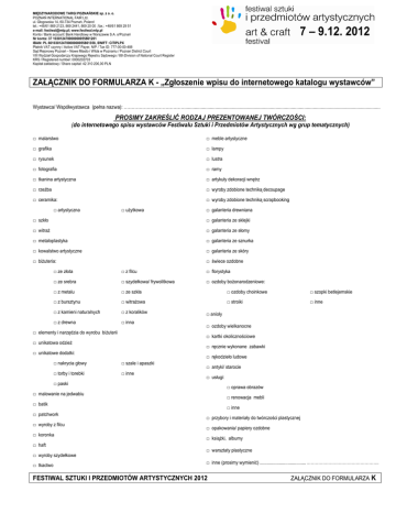 MIĘDZYNARODOWE TARGI POZNAŃSKIE sp. z o. o. POZNAŃ INTERNATIONAL FAIR Ltd. ul. Głogowska 14, 60-734 Poznań, Poland tel.: +48/61 869 2123, 869 2441, 869 20 00 ; fax.: +48/61 869 29 51 e-mail: [email protected]; www.festiwal.mtp.pl Konto / Bank account: Bank Handlowy w Warszawie S.A. o/Poznań Nr konta: 37 103012470000000055861201 IBAN: PL 66103012470000000055861358, SWIFT: CITIPLPX Płatnik VAT czynny / Active VAT Payer, NIP / Tax ID: 777-00-00-488 Sąd Rejonowy Poznań – Nowe Miasto i Wilda w Poznaniu / Poznan District Court VIII Wydział Gospodarczy Krajowego Rejestru Sądowego / 8th Division of National Court Register KRS / Registered number: 0000202703 Kapitał zakładowy / Share capital: 42 310 200,00 PLN 7 – 9.12. 2012 ZAŁĄCZNIK DO FORMULARZA K - „Zgłoszenie wpisu do internetowego katalogu wystawców” Wystawca/ Współwystawca (pełna nazwa): …………………………………........................................................................................................................................................ PROSIMY ZAKREŚLIĆ RODZAJ PREZENTOWANEJ TWÓRCZOŚCI: (do internetowego spisu wystawców Festiwalu Sztuki i Przedmiotów Artystycznych wg grup tematycznych) □ malarstwo □ meble artystyczne □ grafika □ lampy □ rysunek □ lustra □ fotografia □ ramy □ tkanina artystyczna □ artykuły dekoracji wnętrz □ rzeźba □ wyroby zdobione techniką decoupage □ ceramika: □ wyroby zdobione techniką scrapbooking □ artystyczna □ uŜytkowa □ galanteria drewniana □ szkło □ galanteria ze sklejki □ witraŜ □ galanteria ze słomy □ metaloplastyka □ galanteria ze sznurka □ kowalstwo artystyczne □ galanteria ze skóry □ biŜuteria: □ świece ozdobne □ ze złota □ z filcu □ florystyka □ ze srebra □ szydełkowa/ frywolitkowa □ ozdoby boŜonarodzeniowe: □ z metalu □ ze szkła □ ozdoby choinkowe □ szopki betlejemskie □ z bursztynu □ witraŜowa □ stroiki □ inne □ z kamieni naturalnych □ z koralików □ z drewna □ inna □ elementy i narzędzia do wyrobu biŜuterii □ anioły □ ozdoby wielkanocne □ kartki okolicznościowe □ unikatowa odzieŜ □ ręcznie wykonane zabawki □ unikatowe dodatki: □ rękodzieło ludowe □ nakrycia głowy □ szale i apaszki □ torby i torebki □ inne □ antyki/ starocie □ usługi: □ paski □ oprawa obrazów □ malowanie na jedwabiu □ renowacja mebli □ batik □ patchwork □ wyroby z filcu □ koronka □ inne □ przybory i materiały do twórczości plastycznej □ opakowania/ papiery ozdobne □ ksiąŜki, albumy □ haft □ warsztaty plastyczne □ wyroby szydełkowe □ tkactwo □ inne (prosimy wymienić) ...................................... ………………………………………….. FESTIWAL SZTUKI I PRZEDMIOTÓW ARTYSTYCZNYCH 2012 ZAŁĄCZNIK DO FORMULARZA K
