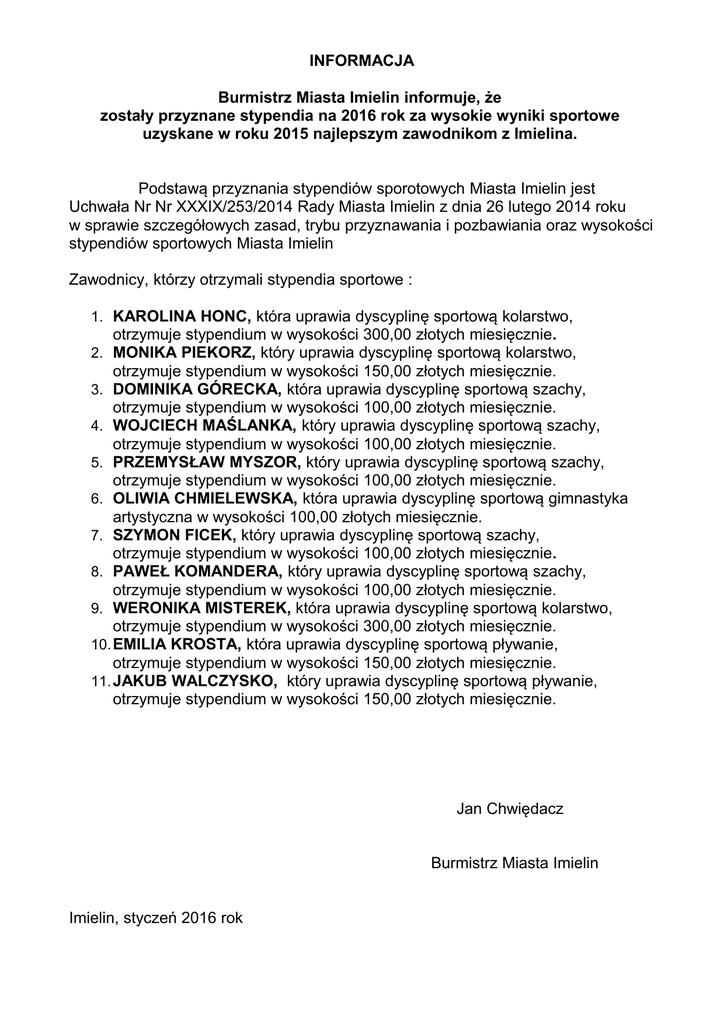 INFORMACJA Burmistrz Miasta Imielin informuje, że zostały przyznane stypendia na 2016 rok za wysokie wyniki sportowe uzyskane w roku 2015 najlepszym zawodnikom z Imielina. Podstawą przyznania stypendiów sporotowych Miasta Imielin jest Uchwała Nr Nr XXXIX/253/2014 Rady Miasta Imielin z dnia 26 lutego 2014 roku w sprawie szczegółowych zasad, trybu przyznawania i pozbawiania oraz wysokości stypendiów sportowych Miasta Imielin Zawodnicy, którzy otrzymali stypendia sportowe : 1. KAROLINA HONC, która uprawia dyscyplinę sportową kolarstwo, otrzymuje stypendium w wysokości 300,00 złotych miesięcznie. 2. MONIKA PIEKORZ, który uprawia dyscyplinę sportową kolarstwo, otrzymuje stypendium w wysokości 150,00 złotych miesięcznie. 3. DOMINIKA GÓRECKA, która uprawia dyscyplinę sportową szachy, otrzymuje stypendium w wysokości 100,00 złotych miesięcznie. 4. WOJCIECH MAŚLANKA, który uprawia dyscyplinę sportową szachy, otrzymuje stypendium w wysokości 100,00 złotych miesięcznie. 5. PRZEMYSŁAW MYSZOR, który uprawia dyscyplinę sportową szachy, otrzymuje stypendium w wysokości 100,00 złotych miesięcznie. 6. OLIWIA CHMIELEWSKA, która uprawia dyscyplinę sportową gimnastyka artystyczna w wysokości 100,00 złotych miesięcznie. 7. SZYMON FICEK, który uprawia dyscyplinę sportową szachy, otrzymuje stypendium w wysokości 100,00 złotych miesięcznie. 8. PAWEŁ KOMANDERA, który uprawia dyscyplinę sportową szachy, otrzymuje stypendium w wysokości 100,00 złotych miesięcznie. 9. WERONIKA MISTEREK, która uprawia dyscyplinę sportową kolarstwo, otrzymuje stypendium w wysokości 300,00 złotych miesięcznie. 10. EMILIA KROSTA, która uprawia dyscyplinę sportową pływanie, otrzymuje stypendium w wysokości 150,00 złotych miesięcznie. 11. JAKUB WALCZYSKO, który uprawia dyscyplinę sportową pływanie, otrzymuje stypendium w wysokości 150,00 złotych miesięcznie. Jan Chwiędacz Burmistrz Miasta Imielin Imielin, styczeń 2016 rok