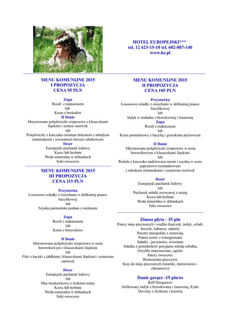 HOTEL EUROPEJSKI*** tel. 12 423-15-10 tel. 602-807-140 www.he.pl MENU KOMUNIJNE 2015 I PROPOZYCJA CENA 95 PLN MENU KOMUNIJNE 2015 II PROPOZYCJA CENA 105 PLN Zupa Rosół z makaronem lub Krem z brokułów II Danie Marynowane polędwiczki wieprzowe z kluseczkami śląskimi i zestaw surówek lub Polędwiczki z kurczaka owinięte bekonem z młodymi ziemniakami i wiosennym mixem sałatkowym Deser Europejski pucharek lodowy Kawa lub herbata Woda mineralna w dzbankach Soki owocowe Przystawka Łososiowe roladki z orzechami w delikatnej piance bazylikowej lub Indyk w maladze z brzoskwinią i żurawiną Zupa Rosół z makaronem lub Krem pomidorowy z bazylią i groszkiem ptysiowym MENU KOMUNIJNE 2015 III PROPOZYCJA CENA 115 PLN Przystawka Łososiowe roladki z orzechami w delikatnej piance bazylikowej lub Szynka parmeńska podana z melonem Zupa Rosół z makaronem lub Krem z borowików II Danie Marynowane polędwiczki wieprzowe w sosie borowikowym z kluseczkami śląskimi lub Rolada z kurczaka nadziewana serem i szynką w sosie paprykowo-tymiankowym z młodymi ziemniakami i zestawem surówek Deser Europejski pucharek lodowy lub Pucharek sałatki owocowej z miętą Kawa lub herbata Woda mineralna w dzbankach Soki owocowe Zimna płyta - 35 pln Patery mięs pieczonych i wędlin (karczek, indyk, schab, boczek, kabanos, salami) Pasztet staropolski z żurawiną Patera serów z winogronami II Danie Sałatki - jarzynowa, wiosenna Marynowane polędwiczki wieprzowe w sosie Sałatka z pomidorków posypana młodą cebulką borowikowym z kluseczkami śląskimi Grzybki marynowane, ogórki lub Patery owocowe Filet z kaczki z jabłkiem i kluseczkami śląskimi i zestawem Różnorodne pieczywo surówek Sosy do mięs pieczonych (tatarski, żurawinowo chrzanowy) Deser Europejski pucharek lodowy lub Mus truskawkowy z listkiem mięty Kawa lub herbata Woda mineralna w dzbankach Soki owocowe Danie gorące -19 pln/os Beff Strogonow Grillowany indyk z brzoskwinią i żurawiną, frytki Devolay z frytkami i mizerią
