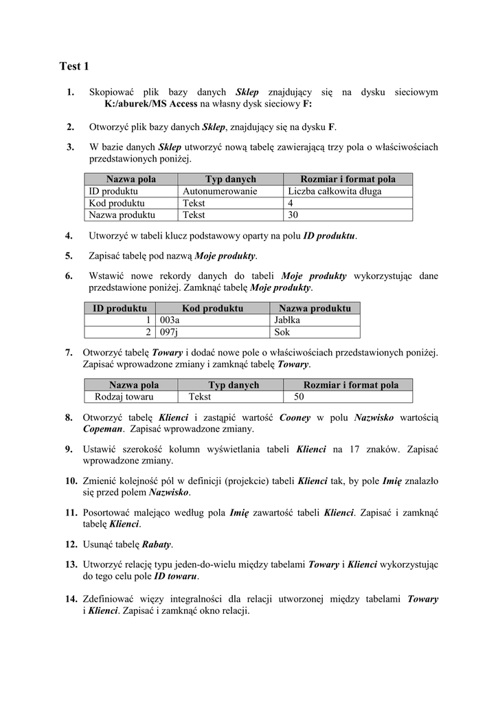 Test 1 1. Skopiować plik bazy danych Sklep znajdujący się na dysku sieciowym K:/aburek/MS Access na własny dysk sieciowy F: 2. Otworzyć plik bazy danych Sklep, znajdujący się na dysku F. 3. W bazie danych Sklep utworzyć nową tabelę zawierającą trzy pola o właściwościach przedstawionych poniżej. Nazwa pola ID produktu Kod produktu Nazwa produktu Typ danych Autonumerowanie Tekst Tekst Rozmiar i format pola Liczba całkowita długa 4 30 4. Utworzyć w tabeli klucz podstawowy oparty na polu ID produktu. 5. Zapisać tabelę pod nazwą Moje produkty. 6. Wstawić nowe rekordy danych do tabeli Moje produkty wykorzystując dane przedstawione poniżej. Zamknąć tabelę Moje produkty. ID produktu Kod produktu 1 003a 2 097j 7. Nazwa produktu Jabłka Sok Otworzyć tabelę Towary i dodać nowe pole o właściwościach przedstawionych poniżej. Zapisać wprowadzone zmiany i zamknąć tabelę Towary. Nazwa pola Rodzaj towaru Typ danych Tekst Rozmiar i format pola 50 8. Otworzyć tabelę Klienci i zastąpić wartość Cooney w polu Nazwisko wartością Copeman. Zapisać wprowadzone zmiany. 9. Ustawić szerokość kolumn wyświetlania tabeli Klienci na 17 znaków. Zapisać wprowadzone zmiany. 10. Zmienić kolejność pól w definicji (projekcie) tabeli Klienci tak, by pole Imię znalazło się przed polem Nazwisko. 11. Posortować malejąco według pola Imię zawartość tabeli Klienci. Zapisać i zamknąć tabelę Klienci. 12. Usunąć tabelę Rabaty. 13. Utworzyć relację typu jeden-do-wielu między tabelami Towary i Klienci wykorzystując do tego celu pole ID towaru. 14. Zdefiniować więzy integralności dla relacji utworzonej między tabelami Towary i Klienci. Zapisać i zamknąć okno relacji. 15. Utworzyć nową kwerendę zawierającą wszystkie pola z tabeli Klienci. Kwerenda powinna wyświetlać tylko tych klientów, dla których wartość w polu ID towaru jest równa 1. Zapisać kwerendę pod nazwą Kwerenda 1. Zamknąć kwerendę Kwerenda 1. 16. Utworzyć nową kwerendę zawierającą wszystkie pola z tabeli Klienci. Kwerenda powinna wyświetlać tylko tych klientów, którzy dokonali zakupu o wartości mniejszej niż 4$. Zapisać kwerendę pod nazwą Kwerenda 2. Zamknąć kwerendę Kwerenda 2. 17. Otworzyć kwerendę Kwerenda 1 i usunąć z niej pole Imię. Zapisać i zamknąć kwerendę Kwerenda 1. 18. Usunąć kwerendę Cennik. 19. Utworzyć formularz prezentujący wszystkie pola z tabeli Klienci (przyjąć domyślne ustawienia definicji formularza). Zapisać formularz pod nazwą Kupujący. Zamknąć formularz Kupujący. 20. Otworzyć formularz Kupujący i wydrukować na dostępnej drukarce lub do pliku kupuj.prn (na dysku roboczym) pierwszy rekord danych. Zapisać i zamknąć formularz Kupujący. 21. Otworzyć formularz Towary i zmodyfikować w nagłówku wygląd etykiety TOWARY nadając jej kolor niebieski oraz rozmiar czcionki 18. Zapisać i zamknąć formularz Towary. 22. W nagłówku formularza Towary wstaw przycisk, pozwalający kasować wybrany rekord. 23. W stopce formularza Towary wstaw obraz z pliku znak.png 24. W stopce formularza Towary wstaw pole pokazujące aktualną datę oraz czas 25. Zmodyfikuj odpowiednie ustawienia, aby formularz Towary pokazywał się od razu po uruchomieniu bazy danych. 26. Utworzyć raport zawierający wszystkie pola z tabeli Towary (przyjąć domyślne ustawienia definicji raportu). Zapisać raport pod nazwą Obiekty. 27. W raporcie Obiekty zmienić położenie daty tak, by była ona wyświetlana w nagłówku strony raportu. Zapisać raport Obiekty. 28. W raporcie Obiekty ustawić poziomą orientację strony. Zapisać i zamknąć raport Obiekty. 29. Utworzyć raport prezentujący dane z tabeli Klienci pogrupowane według pola Nazwisko. Raport powinien zawierać informację o maksymalnej wartości zakupu dla każdego klienta. Zapisać raport pod nazwą Klienci Tot. Zamknąć raport Klienci Tot. 30. Otworzyć raport Żywność i zmodyfikować stopkę strony raportu wstawiając w miejsce tekstu Produkty tekst Zapas. 31. Usunąć raport Wydatki.