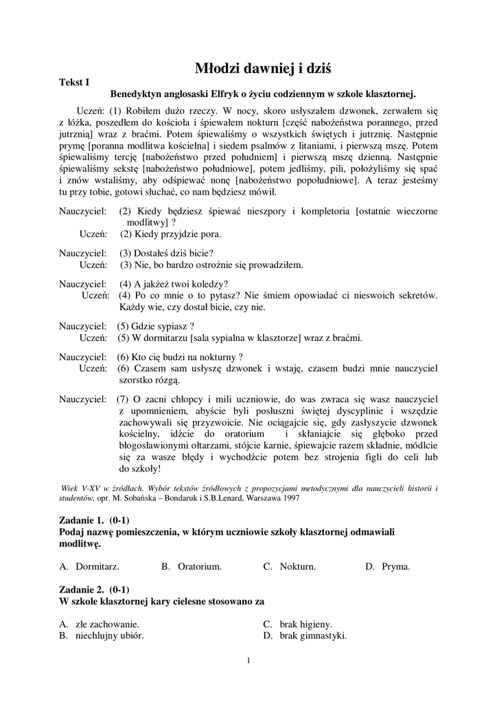 Tekst I Młodzi dawniej i dzi Benedyktyn anglosaski Elfryk o yciu codziennym w szkole klasztornej. Ucze : (1) Robiłem du o rzeczy. W nocy, skoro usłyszałem dzwonek, zerwałem si z łó ka, poszedłem do ko cioła i piewałem nokturn [cz nabo e stwa porannego, przed jutrzni ] wraz z bra mi. Potem piewali my o wszystkich wi tych i jutrzni . Nast pnie prym [poranna modlitwa ko cielna] i siedem psalmów z litaniami, i pierwsz msz . Potem piewali my tercj [nabo e stwo przed południem] i pierwsz msz dzienn . Nast pnie piewali my sekst [nabo e stwo południowe], potem jedli my, pili, poło yli my si spa i znów wstali my, aby od piewa non [nabo e stwo popołudniowe]. A teraz jeste my tu przy tobie, gotowi słucha , co nam b dziesz mówił. Nauczyciel: Ucze : (2) Kiedy b dziesz piewa modlitwy] ? (2) Kiedy przyjdzie pora. Nauczyciel: Ucze : nieszpory i kompletoria [ostatnie wieczorne (3) Dostałe dzi bicie? (3) Nie, bo bardzo ostro nie si prowadziłem. Nauczyciel: (4) A jak e twoi koledzy? Ucze : (4) Po co mnie o to pytasz? Nie miem opowiada ci nieswoich sekretów. Ka dy wie, czy dostał bicie, czy nie. Nauczyciel: (5) Gdzie sypiasz ? Ucze : (5) W dormitarzu [sala sypialna w klasztorze] wraz z bra mi. Nauczyciel: (6) Kto ci budzi na nokturny ? Ucze : (6) Czasem sam usłysz dzwonek i wstaj , czasem budzi mnie nauczyciel szorstko rózg . Nauczyciel: (7) O zacni chłopcy i mili uczniowie, do was zwraca si wasz nauczyciel z upomnieniem, aby cie byli posłuszni wi tej dyscyplinie i wsz dzie zachowywali si przyzwoicie. Nie oci gajcie si , gdy zasłyszycie dzwonek ko cielny, id cie do oratorium i skłaniajcie si gł boko przed błogosławionymi ołtarzami, stójcie karnie, piewajcie razem składnie, módlcie si za wasze bł dy i wychod cie potem bez strojenia figli do celi lub do szkoły! Wiek V-XV w ródłach. Wybór tekstów ródłowych z propozycjami metodycznymi dla nauczycieli historii i studentów, opr. M. Soba ska – Bondaruk i S.B.Lenard, Warszawa 1997 Zadanie 1. (0-1) Podaj nazw pomieszczenia, w którym uczniowie szkoły klasztornej odmawiali modlitw . A. Dormitarz. B. Oratorium. C. Nokturn. Zadanie 2. (0-1) W szkole klasztornej kary cielesne stosowano za A. złe zachowanie. B. niechlujny ubiór. C. brak higieny. D. brak gimnastyki. 1 D. Pryma. Zadanie 3. (0-1) Nagromadzenie czasowników w czasie przeszłym i tera niejszym w I wypowiedzi ucznia wiadczy o tym, e ucze A. opisuje. B. opowiada. C. ocenia. D. charakteryzuje. Zadanie 4. (0-1) Grupa społeczna, do której nale ał redniowieczny nauczyciel, to A. mieszcza stwo. B. stan chłopski. C. duchowie stwo. D. rycerstwo. Zadanie 5. (0-1) Co było najwa niejsze w yciu młodego człowieka w redniowieczu? A. piew. B. Nauka. C. Religia. D. Rozmowa. Zadanie 6. (0-1) W tek cie I dominuje funkcja A. poetycka. B. informatywna. C. ekspresywna. Tekst II (...) S dzia, z boku rzuciwszy wzrok na Tadeusza I poprawiwszy nieco wylotów kontusza, Nalał w grzyna i rzekł: „Dzi , nowym zwyczajem, My na nauk młodzie do stolicy dajem, I nie przeczym, e nasi synowie i wnuki Maj od starszych wi cej ksi kowej nauki; Ale co dzie postrzegam, jak młód cierpi na tem, e nie ma szkół ucz cych y z lud mi i wiatem. Dawniej na dwory pa skie jechał szlachcic młody, Ja sam lat dziesi byłem dworskim Wojewody(...) On mnie rad do usług publicznych sposobił, Z opieki nie wypu cił, a człowiekiem zrobił. (...) Przynajmniej tom skorzystał, e mi w moim domu Nikt nigdy nie zarzuci, bym uchybił komu W uczciwo ci, w grzeczno ci; a ja powiem miało, Grzeczno nie jest nauk łatw ani mał . (...) To mówi c S dzia go ci obejrzał porz dkiem; Bo cho zawsze i płynnie mówił, i z rozs dkiem, Wiedział, e niecierpliwa młodzie tera niejsza, e j nudzi rzecz długa, cho najwymowniejsza. (A.Mickiewicz „Pan Tadeusz”) 2 D. impresywna. Zadanie 7. (0-1) U yty przez S dziego wyraz „młód ” jest współcze nie A. neologizmem. B. zapo yczeniem. C. dialektyzmem. D. archaizmem. Zadanie 8. (0-1) Co to jest „kontusz”? A. Taniec staropolski. B. Napój bogów. C. Potrawa francuska. D. Strój szlachecki. Zadanie 9. (0-1) Co znaczy zwrot: „ksi kowa nauka” ? A. Nauka na pami . B. Wiedza teoretyczna. C. Nauka dykcji. D. Praktyczne umiej tno ci. Zadanie 10. (0-1) Którym z podanych frazeologizmów mo na podsumowa wypowied S dziego ? A. B. C. D. Zapomniał wół, jak ciel ciem był. Czym skorupka za młodu nasi knie, tym na staro Staro nie rado , młodo nie wieczno . Młodo ma swoje prawa. tr ci. Zadanie 11. (0-1) Wska wydarzenie historyczne zwi zane z akcj „Pana Tadeusza”. A. B. C. D. Powstanie listopadowe. Wyprawa Jana III Sobieskiego na Wiede . Wyprawa Napoleona na Rosj . Powstanie ko ciuszkowskie. Tekst III „Id młody i genialny, trzymam r ce w kieszeniach, Stawiam kroki milowe, zamaszyste jak wiat. (...) Tak mi dobrze, tak mojo, a rechoce si serce. Same nogi mnie nios gdzie – i po co mi gdzie?” (Bruno Jasie ski „But w butonierce”) Zadanie 12. (0-1) Podmiot liryczny wiersza B. Jasie skiego odczuwa A. rado i trosk . B. zm czenie i niech . C. zachwyt i triumf. D. melancholi i al. 3 Zadanie 13. (0-1) Przeno ni w utworze B. Jasie skiego jest: A. „tak mi dobrze”. B. „rechoce si serce”. C. „i po co mi gdzie”. D. „r ce w kieszeniach”. Tekst IV Rudy i Alek mieli wyj tkowo szcz liwe warunki młodo ci: dobry dom, dobra szkoła, dobra organizacja młodzie owa; a wszystkie te czynniki współdziałały ze sob i wzajemnie si wspierały. Jak e – niestety – niewielu jeszcze chłopców w Polsce ma takie warunki młodo ci. Oczywi cie szkoła, dom, rodowisko kole e skie ogromnie ułatwiły dobry start yciowy tym chłopcom. Ale nie popełnijmy bł du złej oceny: o poziomie sportowca nie decyduje nawet najlepsze boisko ani najbardziej wygodny ubiór, ani skrupulatne przestrzeganie trybu ycia sportowego – o poziomie sportowca decyduje co innego: jego istotne uzdolnienia sportowe i jego praca nad sob . To porównanie jest odpowiedzi na pytanie o rol dobrych w