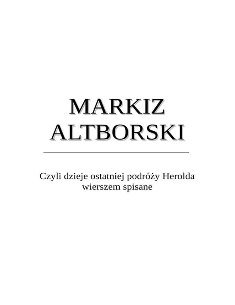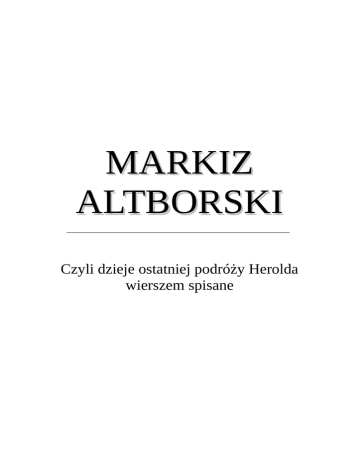 MARKIZ ALTBORSKI Czyli dzieje ostatniej podróży Herolda wierszem spisane SPIS TREŚCI SŁOWO OD AUTORA.............................................................3 POSTACI I MIEJSCA...............................................................4 PROLOG....................................................................................5 AKT I.........................................................................................6 Scena 1..................................................................................6 Scena 2..................................................................................9 Scena 3................................................................................11 AKT II......................................................................................13 Scena 4................................................................................13 Scena 5................................................................................16 Scena 6................................................................................18 AKT III....................................................................................22 Scena 7................................................................................22 Scena 8................................................................................24 Scena 9................................................................................27 EPILOG...................................................................................29 2 SŁOWO OD AUTORA Płaczą nad trupem, Ten rodzi się na nowo W następnym kraju — Karolina dssa von Lichtenstein Jesienną porą, przebywając w Dahrim – lennie mojego dziadka – spisane. Koniec roku 2015 przynosi nam widok upadającego – jak zdawać by się mogło, od zawsze, mikroświata. Z trzech państw niegdysiejszej Wielkiej Trójki ostało się tylko Księstwo Sarmacji; Królestwo Dreamlandu z Królestwem Scholandii unią połączywszy się, obecnie próbuje znieść cały dreamlandzki dobytek prawny. Jednocześnie na kontynencie północnym obserwować możemy pączkujące z prędkością światła – i jeszcze szybciej znikające – yoyonacje. Pycha, poczucie wyższości – jedne z gromady niemożliwych do wymienienia przyczyn upadku – tym razem na serio – naszej krainy ucieczki znalazły odzwierciedlenie w niniejszym utworze. I choć świat od początku ciągle się wali, czas zadać pytanie: Quo vadis, mikroświecie? Kristian Arped 3 POSTACI I MIEJSCA Herold, Wicekról, Syn, Lambert, Prefekt, Posłaniec, Marynarz, Kapitan, Sługa, Przewodniczący, Strażnik, Asesor 1, Asesor 2, Wigowind, Hildebrandt Grodzisk, Árnovike, Góry Solskie, Almera, Gidena, Republika Scholandzka, Loardia 4 PROLOG Czym się stałeś? Z herbów oblazła pozłota i w jedwab wżarły Się mole, szumne idee i piękno zmarły, Pozostały dumne słowa oraz wspomnienia Dni minionej chwały, też niewielkie marzenia Gubione gdzieś wśród celebracji pustej formy. Liczy się już zachowanie minimum normy! Dokąd zmierzasz? Z pustej formy wyradza się kolejna pustka, Przemijalność mija, by ustąpić kolejnej, Sen o rzeczywistości, który bierzesz w marnej Swej głowie za realność… nicość i pustka. Niegodziwość stwarza niegodziwość, by zepchnąć Cię w odmęty i śmiech na usta Hadesa tchnąć. Jest nadzieja? Oto przyszła już jesień i pora umierać, Wiatr rwie kosztowne tkaniny liści i miota Nimi bez pardonu. Wspomnienia wiosny – wota Ofiarne, które będą nas teraz ożywiać. Bogowie na wysokościach nieb wysłuchują I drzewa z czasem swoją nagość okrywają. – Vladimir Iwanowicz von Lichtenstein 5 AKT I Scena 1. HEROLD, POSŁANIEC – KOMNATA W PAŁACU – KSIĄŻĘCE MIASTO GRODZISK – STÓŁ PRZY OKNIE – PORA WIECZORNA HEROLD Pracować tuż po okresie miałem wiosennym, Obietnic złożyłem bliskim circa tysiące, Teraz zapadłem już snem zimowo-jesiennym, A na decyzje czekają wnioski naglące. Jak krwi żądnej niepohamowanej frustracji Mam nie kryć, gdy kolejny to aplikanta herb – Do diaska! – nie spełnia zasady alternacji… Jak tu być dla dworu książęcego jak pasierb?! (popada w zamysł) Nie dość, że służba dobiega końca w Grodzisku książęcym, to w Baridasie zjawił Gideński się Lambert. Pomimo tlącego się w ognisku Sercowym popiołu, on – nieurodzaju klęski 6 Owoc – altborskiego markiza tytuł uzurpuje. Mimo że użyteczny jak bez międzymordzia Aplikacja jest, opinią manipuluje Baridajską – i nie tylko!… już miłosierdzia Mojego teutońskiego koniec nastał zapasu. Czas wyjść z pisanego rajńskim stylem impasu! (opiera się na stole; wygląda przez okno) Grodzisku! Persony tego miasta wymarły Wszystkie, kiedy rządziły nieudolne karły. Teraz, gdy nastąpiła korony reforma Wciąż nie jest wyrabiana powinności norma. (słychać pukanie do drzwi) Stukot pukania wodzi za mą myślą mglistą, Dlaczego nie zostałem… nie wiem – organistą? Wchodzić! POSŁANIEC Jaśnie Wielmożny Panie! Jestem na żądanie Jaśnie Oświeconej Marszałek Dworu – na Boga! Listu jestem poręczycielem. (wręcza list Heroldowi) HEROLD List… Pamiętam, jak namiętnie piórem za młodu Z Oliwią – moją wybranką – pisałem listy 7 Zostało mi zatapiać żal w piwie ze słodu Południowobaridajskiego bananisty. (popada w zadumę) Posłańcu! Masz tu ćwierć liberta za robotę, Czy jak wolisz – dwadzieścia pięć pinów w ręku. Ja… Muszę obejrzeć moją starą gablotę, Czy nie cierpi tam jakaś mysz w tragicznym męku. (Posłaniec przyjmuje zapłatę i wychodzi z komnaty; Herold – pośpiesznie z listem kieruje się do sypialni) 8 Scena 2. HEROLD – SYPIALNIA PRZY KOMNACIE – KSIĄŻĘCE MIASTO GRODZISK – PORA NOCNA – ŁÓŻKO, STOLIK NOCNY HEROLD (wchodzi do sypialni) Jaśnie Oświecona Marszałek Dworu… Sprawa! Każdemu tylko życzenia sarmatnicowe Składałaby nowemu! A jest jak zaprawa Muru – żrące kwasem