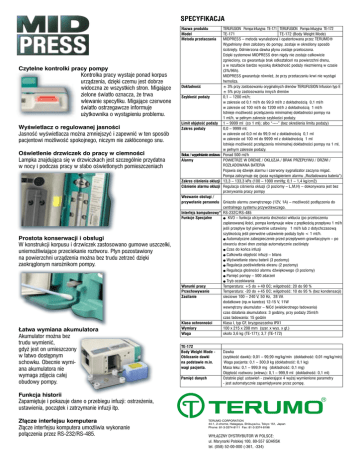 SPECYFIKACJA Nazwa produktu Model Metoda przetaczania Czytelne kontrolki pracy pompy Kontrolka pracy wystaje ponad korpus urzàdzenia, dzi´ki czemu jest dobrze widoczna ze wszystkich stron. Migajàce zielone Êwiat∏o oznacza, ˝e trwa wlewanie specyfiku. Migajàce czerwone Êwiat∏o ostrzegawcze informuje u˝ytkownika o wystàpieniu problemu. WyÊwietlacz o regulowanej jasnoÊci JasnoÊç wyÊwietlacza mo˝na zmniejszyç i zapewniç w ten sposób pacjentowi mo˝liwoÊç spokojnego, niczym nie zak∏óconego snu. OÊwietlenie drzwiczek do pracy w ciemnoÊci Lampka znajdujàca si´ w drzwiczkach jest szczególnie przydatna w nocy i podczas pracy w s∏abo oÊwietlonych pomieszczeniach Prostota konserwacji i obs∏ugi W konstrukcji korpusu i drzwiczek zastosowano gumowe uszczelki, uniemo˝liwiajàce przeciekanie roztworu. P∏yn pozostawiony na powierzchni urzàdzenia mo˝na bez trudu zetrzeç dzi´ki zaokràglonym naro˝nikom pompy. ¸atwa wymiana akumulatora Akumulator mo˝na bez trudu wymieniç, gdy˝ jest on umieszczony w ∏atwo dost´pnym schowku. Obecnie wymiana akumulatora nie wymaga zdj´cia ca∏ej obudowy pompy. TERUFUSION Pompa Infuzyjna TE-171 TERUFUSION Pompa Infuzyjna TE-172 TE-171 TE-172 (Body Weight Mode) MIDPRESS – metoda wynaleziona i opatentowana przez TERUMO® Wype∏niony dren za∏o˝ony do pompy, zostaje w okreÊlony sposób ÊciÊni´ty. Odmierzona dawka p∏ynu zostaje przetoczona. Dzi´ki systemowi MIDPRESS dren nigdy nie zostaje ca∏kowicie zgnieciony, co gwarantuje brak odkszta∏ceƒ na powierzchni drenu, a w rezultacie bardzo wysokà dok∏adnoÊç poda˝y niezmiennà w czasie (3%/96h). MIDPRESS gwarantuje równie˝, ˝e przy przetaczaniu krwi nie wystàpi hemoliza. Dok∏adnoÊç ± 3% przy zastosowaniu oryginalnych drenów TERUFUSION Infusion typ E ± 5% przy zastosowaniu innych drenów SzybkoÊç poda˝y 0,1 – 1200 ml/h; w zakresie od 0,1 ml/h do 99,9 ml/h z dok∏adnoÊcià 0,1 ml/h w zakresie od 100 ml/h do 1200 ml/h z dok∏adnoÊcià 1 ml/h Istnieje mo˝liwoÊç prze∏àczenia minimalnej dok∏adnoÊci pompy na 1 ml/h, w pe∏nym zakresie szybkoÊci poda˝y. Limit obj´toÊç poda˝y 1 – 9999 ml (co 1 ml); albo “----” (bez okreÊlenia limitu poda˝y) Zakres poda˝y 0,0 – 9999 ml; w zakresie od 0,0 ml do 99,9 ml z dok∏adnoÊcià 0,1 ml w zakresie od 100 ml do 9999 ml z dok∏adnoÊcià 1 ml Istnieje mo˝liwoÊç prze∏àczenia minimalnej dok∏adnoÊci pompy na 1 ml, w pe∏nym zakresie poda˝y. Bolus / wype∏nianie zestawu Ponad 500 ml/h Alarmy POWIETRZE W DRENIE / OKLUZJA / BRAK PRZEP¸YWU / DRZWI / ROZ¸ADOWANA BATERIA Pojawia si´ dêwi´k alarmu i czerwony sygnalizator zaczyna migaç. Pompa zatrzymuje si´ (poza wystàpieniem alarmu „Roz∏adowana bateria”) Zakres ciÊnienia okluzji 13,3 – 133,3 kPa (100 – 1000 mmHg; 0,1 – 1,4 kg/cm2) CiÊnienie alarmu okluzji Regulacja ciÊnienia okluzji (3 poziomy – L,M,H) – dokonywana jest bez przerywania pracy pompy Wezwanie obs∏ugi / przywo∏anie personelu Gniazdo alarmu zewn´trznego (12V, 1A) – mo˝liwoÊç pod∏àczenia do centralnego systemu przywo∏awczego. Interfejs komputerowy* RS-232C/RS-485 Funkcje Specjalne ● KVO – funkcja utrzymania dro˝noÊci wk∏ucia (po przetoczeniu zaplanowanej iloÊci, pompa kontynuuje wlew z pr´dkoÊcià przep∏ywu 1 ml/h jeÊli przep∏yw by∏ pierwotnie ustawiony 1 ml/h lub z dotychczasowà szybkoÊcià jeÊli pierwotne ustawienie poda˝y by∏o < 1 ml/h. ● Automatyczne zabezpieczenie przed przep∏ywem grawitacyjnym – po otwarciu drzwi dren zostaje automatycznie zaciÊni´ty ● Czas do koƒca infuzji ● Ca∏kowita obj´toÊç infuzji – bilans ● WyÊwietlanie stanu baterii (3 poziomy) ● Regulacja podÊwietlenia ekranu (2 poziomy) ● Regulacja g∏oÊnoÊci alarmu dêwi´kowego (3 poziomy) ● Pami´ç pompy – 500 zdarzeƒ ● Tryb oczekiwania Warunki pracy Temperatura: +5 do +40 OC; wilgotnoÊç: 20 do 90 % Przechowywanie Temperatura: -20 do +45 OC; wilgotnoÊç: 10 do 95 % (bez kondensacji) Zasilanie sieciowe 100 – 240 V, 50 Hz, 28 VA dodatkowe (np.w karetce) 12-15 V, 11W wewn´trzny akumulator – NiCd (wielokrotnego ∏adowania) czas dzia∏ania akumulatora: 3 godziny, przy poda˝y 25ml/h czas ∏adowania: 15 godzin Klasa ochronnoÊci Klasa I, typ CF, bryzgoszczelna IPX1 Wymiary 100 x 215 x 208 mm (szer. x wys. x g∏.) Waga oko∏o 3,6 kg (TE-171); 3,7 (TE-172) TE-172 Body Weight Mode Obliczanie dawki na podstawie m.in. wagi pacjenta. Pami´ç danych Dawka (szybkoÊç dawki): 0,01 – 99,99 mg/kg/min (dok∏adnoÊç: 0,01 mg/kg/min) Waga pacjenta: 0,1 – 300,0 kg (dok∏adnoÊç: 0,1 kg) Masa leku: 0,1 – 999,9 mg (dok∏adnoÊç: 0,1 mg) Obj´toÊç roztworu (wlewu): 0,1 – 999,9 ml (dok∏adnoÊç: 0,1 ml) Ostatnie pi´ç ustawieƒ - zawierajàce 4 wy˝ej wymienione parametry - jest automatycznie zapami´tywane przez pomp´. Funkcja historii Zapami´tuje i pokazuje dane o przebiegu infuzji: ostrze˝enia, ustawienia, poczàtek i zatrzymanie infuzji itp. Z∏àcze interfejsu komputera Z∏àcze interfejsu komputera umo˝liwia wykonanie po∏àczenia przez RS-232/RS-485. TERUMO CORPORATION 44-1, 2-chome, Hatagaya, Shibuya-ku, Tokyo 151, Japan Phone: 81-3-3374-8111 Fax: 81-3-3374-8196 WY¸ÑCZNY DYSTRYBUTOR W POLSCE: ul. Marynarki Polskiej 100, 80-557 GDA¡SK tel. (058) 52-00-000 (-361, -334) TERUFUSION ® Infusion Pump TE-171/TE-172 The outstanding reliability of Terumo’s MIDPRESS puts you at ease Firma Terumo opracowa∏a innowacyjny system MIDPRESS, w którym wykorzystywana jest nowa metoda tzw. palca perystaltycznego. W konwencjonalnej metodzie palca perystaltycznego roztwór jest przetaczany poprzez zaciskanie rurki z roztworem, a˝ do ca∏kowitego jej sp∏aszczenia. W nowej metodzie MIDPRESS, wysokà dok∏adnoÊç poda˝y uzyskujemy poprzez po∏owiczne zaciskanie rurki ze specyfikiem. Dzi´ki precyzyjnej kontroli skoku palca przez system MIDPRESS, podawanie roztworu odbywa si´ stabilnie, a