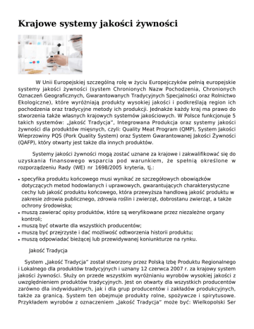Krajowe systemy jakości żywności W Unii Europejskiej szczególną rolę w życiu Europejczyków pełnią europejskie systemy jakości żywności (system Chronionych Nazw Pochodzenia, Chronionych Oznaczeń Geograficznych, Gwarantowanych Tradycyjnych Specjalności oraz Rolnictwo Ekologiczne), które wyróżniają produkty wysokiej jakości i podkreślają region ich pochodzenia oraz tradycyjne metody ich produkcji. Jednakże każdy kraj ma prawo do stworzenia także własnych krajowych systemów jakościowych. W Polsce funkcjonuje 5 takich systemów: „Jakość Tradycja”, Integrowana Produkcja oraz systemy jakości żywności dla produktów mięsnych, czyli: Quality Meat Program (QMP), System Jakości Wieprzowiny PQS (Pork Quality System) oraz System Gwarantowanej Jakości Żywności (QAFP), który otwarty jest także dla innych produktów. Systemy jakości żywności mogą zostać uznane za krajowe i zakwalifikować się do uzyskania finansowego wsparcia pod warunkiem, że spełnią określone w rozporządzeniu Rady (WE) nr 1698/2005 kryteria, tj.: ● ● ● ● ● specyfika produktu końcowego musi wynikać ze szczegółowych obowiązków dotyczących metod hodowlanych i uprawowych, gwarantujących charakterystyczne cechy lub jakość produktu końcowego, która przewyższa handlową jakość produktu w zakresie zdrowia publicznego, zdrowia roślin i zwierząt, dobrostanu zwierząt, a także ochrony środowiska; muszą zawierać opisy produktów, które są weryfikowane przez niezależne organy kontroli; muszą być otwarte dla wszystkich producentów; muszą być przejrzyste i dać możliwość odtworzenia historii produktu; muszą odpowiadać bieżącej lub przewidywanej koniunkturze na rynku. Jakość Tradycja System „Jakość Tradycja” został stworzony przez Polską Izbę Produktu Regionalnego i Lokalnego dla produktów tradycyjnych i uznany 12 czerwca 2007 r. za krajowy system jakości żywności. Służy on przede wszystkim wyróżnianiu wyrobów wysokiej jakości z uwzględnieniem produktów tradycyjnych. Jest on otwarty dla wszystkich producentów zarówno dla indywidualnych, jak i dla grup producentów i zakładów produkcyjnych, także za granicą. System ten obejmuje produkty rolne, spożywcze i spirytusowe. Przykładem wyrobów z oznaczeniem „Jakość Tradycja” może być: Wielkopolski Ser Smażony, Masło wielkopolskie czy Przecier ogórkowy po łowicku. Jakość Tradycja jest systemem, w którym do produkcji używa się naturalnych surowców, których pochodzenie jest identyfikowane oraz które nie zawiera GMO. Naturalny surowiec to taki, który pochodzi z gospodarstwa ekologicznego lub charakteryzuje się Dobrą Praktyką Rolniczą i Dobrą Praktyką Hodowlaną z wyłączeniem GMO. W systemie tym biorą udział wyłącznie produkty cechujące się tradycyjnym składem lub tradycyjnym sposobem wytwarzania, a ich jakość wynika z ich tradycyjnego charakteru lub go wyraża. Poza tym wyróżniają się one wyjątkową jakością lub reputacją, która odróżnia je od pozostałych produktów należących do tej samej kategorii. Natomiast w przypadku wyrobów produkcji podstawowej dodatkowym wymogiem jest tradycyjna rasa lub odmiana. Za produkt tradycyjny uważa się taki, który cechuje się co najmniej 50-letnią historią wytwarzania. Znak Jakościowy „Jakość Tradycja” jest chroniony wspólnym znakiem towarowym gwarancyjnym zarejestrowanym w Urzędzie Patentowym. O prawie do jego używania decyduje Kapituła. Poza tym oznaczenie to jest udzielane odpłatne na okres 2-3 lat. Jednorazowa opłata za używanie znaku wynosi 500zł, a zryczałtowana opłata roczna zależy od wielkości produkcji (50zł od produktu). Zanim jednak producent lub producenci zaczną posługiwać się znakiem muszą posiadać certyfikat zgodności, potwierdzający wytwarzanie wyrobu zgodnie ze specyfikacją. Poza tym producenci sanu wybierają jednostkę kontrolną oraz ponoszą koszty związane z wizytacją. Integrowana Produkcja (IP) Integrowana Produkcja jest nowoczesnym, rozwijającym się systemem uprawy, uwzględniającym oczekiwania odbiorców, zarówno w stosunku do atrakcyjnego wyglądu produktu rolnego, jak i jego wysokiej jakości. W dniu 14 czerwca 2007 r. Integrowana Produkcja została uznana przez Ministerstwo Rolnictwa i Rozwoju Wsi za krajowy system jakości żywności. Program ten umożliwia uzyskanie płodów rolnych o najwyższych wartościach biologicznych, odżywczych i bezpiecznych dla ludzi. Dla Integrowanej Produkcji istotne są również cele ekologiczne, takie jak np. ochrona krajobrazu rolniczego czy zachowanie bioróżnorodności. Podstawą tego systemu są przede wszystkim prawidłowo dobrane elementy takie jak, poprawny płodozmian i agrotechnika, a także racjonalne nawożenie oparte na rzeczywistym zapotrzebowaniu roślin. Co prawda system ten nie odrzuca całkowicie chemicznej ochrony roślin i stosowania nawozów, ale stosuje ich tak mało, jak to tylko możliwe, mając na względzie zdrowie ludzi, zwierząt oraz środowisko naturalne. Poza tym ograniczając liczbę tych zabiegów równocześnie zmniejszają się koszty produkcji, co dla producentów jest również bardzo istotne. W ramach tego systemu jednostką kontrolującą cały proces produkcyjny aż do zbioru jest Państwowa Inspekcja Ochrony Roślin i Nasiennictwa. Kontrola obejmuje m.in. dokument wydawany producentom w celu prowadzenia szczegółowej dokumentacji całego procesu produkcyjnego - „Notatnik Integrowanej Produkcji”, a także gospodarstwo w trakcie wegetacji roślin oraz jakość płodów rolnych. Produkty roślinne poddawane są przede wszystkim ścisłej kontroli pod względem ewentualnych pozostałości nawozów, środków ochrony roślin czy innych niebezpiecznych dla zdrowia ludzi substancji. Ponadto producenci związani z systemem Integrowanej Produkcji mogą posługiwać się odpowiednim certyfikatem i oznaczać swoje produkty zastrzeżonym znakiem Integrowanej Pr