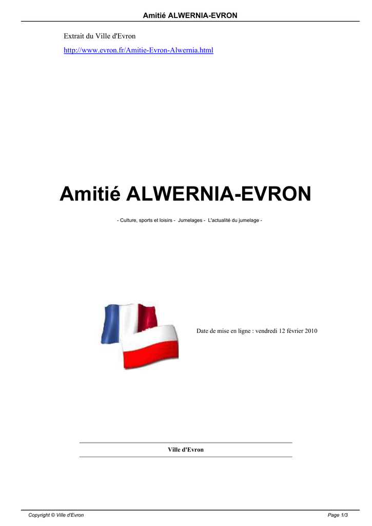Amitié ALWERNIA-EVRON Extrait du Ville d'Evron http://www.evron.fr/Amitie-Evron-Alwernia.html Amitié ALWERNIA-EVRON - Culture, sports et loisirs - Jumelages - L'actualité du jumelage - Date de mise en ligne : vendredi 12 février 2010 Ville d'Evron Copyright © Ville d'Evron Page 1/3 Amitié ALWERNIA-EVRON Bulletin d'information de l'association ALWERNIA-EVRON écrit par Bartosz A Alwernia, Bartosz et Jagoda jasko ont mis en place des cours de français. Ci dessous, le bulletin d'information de l'association Alwernia-Evron écrit par Bartosz. L'association d'amitié Polonaise - Française Stowarzyszenie Przyjazni Polsko- Francuskiej w Alwerni _ L'HISTOIRE/HISTORIA L'association d'amitié Polonaise- Française à Alwernia existe depuis Juin 2008. Nous organisons des cours de français et « des soirées avec le film français ». Stowarzyszenie Przyjazni Polsko- Francuskiej w Alwerni istnieje od czerwca 2008 roku. Organizujemy kursy jzyka francuskiego oraz wieczorki z filmem francuskim. L'année dernière nous avons créé grâce à l'école à Alwernia « La soirée avec la poésie française ». Elle a été organisée deux fois. _Pendant une de ces soirées nous avons eu l'occasion de la présenter devant nos amis de notre ville jumelle Evron. Nos invités ont bien aimé notre manifestation et ils étaient ravis que les jeunes de notre Collège intérpretaient tellement beau la poésie francaise ! W ubiegBym roku z pomoc wychowawców i uczniów ZespoBu SzkóB nr 1 w Alwerni stworzyli[my Wieczorek poezji francuskiej". ByB on zorganizowany dwukrotnie. Podczas jednego z nich mieli[my okazj go[ci naszych przyjacióB z miasta blizniaczego Evron. Wszystkim podobaBo si nasze przedstawienie. Szczególny podziw wzbudziBa interpretacja poezji francuskiej dokonanej przez mBodzie| alwernijsk. LES OFFRES/ OFERTY Cette année nous voudrions vous proposer quelques nouveautés . W tym roku mamy równie| dla PaDstwa nowe oferty : "« Pratiquez votre français ! »- le cours de conversation. Les cours auraient lieu une fois par semaine. Ils seraient dirigés par Bartosz Biel, le lycéen de l'école bilingue à Cracovie et aussi avec un locuteur d'origine française. Les sujets abordés pendant ces cours concerneraient par exemple : les problèmes récents de la société française, la culture et la coopération entre la Pologne et la France. Copyright © Ville d'Evron Page 2/3 Amitié ALWERNIA-EVRON « wiczcie wasz francuski ! »- kursy konwersacji. Kursy odbywaBy si raz w tygodniu. ByBby prowadzone przez Bartosza Biela, licealist ze szkoBy dwujzycznej w Krakowie oraz przez lektora pochodzenia francuskiego. Tematy poruszane na tych zajciach dotyczyByby na przykBad : problemów aktualnych w spoBeczeDstwie francuskim, kultury oraz wspóBpracy Polski i Francji. " Club de lecture/ Klub lektury Le groupe se réunirait une fois par semaine . Les livres des auteurs francophones seraient lus soit en français soit en polonais. Le but de ces réunions c'est de développer de la connaissance de la culture francophone. Le programme plus précis serait présenté pendant la première rencontre. Grupa spotykaBaby si raz w tygodniu. Ksi|ki autorów frankofoDskich byByby czytane po francusku lub po polsku. Celem jest rozwój wiedzy o kulturze frankofoDskiej. Precyzyjny program zostaBby przedstawiony podczas pierwszego spotkania. " Le cours de français/ Kurs jzyka francuskiego Le groupe se réunit une fois par semaine- cette année c' est le mercredi à 17 heures 30 à Dom Kultury à Alwernia. Il est dirigé par la profresseur de français Madame Jadwiga Ja[ko. Pour l'instant il n'existe qu'un seul groupe au niveau avancé. Grupa spotyka si raz w tygodniu- w tym roku jest to [roda o 17:30 w Domu Kultury w Alwerni. Zajcia prowadzi Pani Jadwiga Ja[ko- nauczyciel jzyka francuskiego. Aktualnie istnieje tylko jedna grupa na poziomie zaawansowanym. " La soirée avec le film français/ Wiczorek filmowy Cet événement a lieu une fois par mois, le mercredi au lieu du cours de français. Le film est regardé avec les sous-titres polonais. To wydarzenie ma miejsce raz w miesicu w [rody, zamiast lekcji francuskiego. Film jest ogldany z napisami polskimi. Le contact/ kontakt Pour plus d'informations nous vous invitons à la librairie MAAGORZATA à Alwernia. Wicej informacji mog PaDstwo zasign w ksigarni MAAGOSIA w Alwerni lub piszc pod adres : [email protected] Copyright © Ville d'Evron Page 3/3