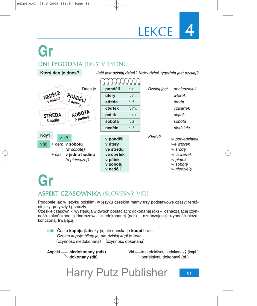 pols4.qxd 28.6.2009 15:49 Page 81 4 LEKCE Gr DNI TYGODNIA (DNY V TÝDNU) Který den je dnes? Jaki jest dzisiaj dzień? Który dzień tygodnia jest dzisiaj? Dnes je E DĚL N E hodina 1 STŘEDA 5 hodin Kdy? PON 3 ho DĚL diny Í TA SOBO 2 hod iny v +B. v(e) + den: v sobotu (w sobotę) + čas: v jednu hodinu (o pierwszej) pondělí r. n. Dzisiaj jest poniedziałek úterý r. n. wtorek středa r. ż. środa čtvrtek r. m. czwartek pátek r. m. piątek sobota r. ż. sobota neděle r. ż. niedziela Kiedy? v pondělí v úterý ve středu ve čtvrtek v pátek v sobotu v neděli w poniedziałek we wtorek w środę w czwartek w piątek w sobotę w niedzielę Gr ASPEKT CZASOWNIKA (SLOVESNÝ VID) Podobnie jak w języku polskim, w języku czeskim mamy trzy podstawowe czasy: teraźniejszy, przyszły i przeszły. Czeskie czasowniki występują w dwóch postaciach: dokonanej (dk) – oznaczającej czynność zakończoną, jednorazową i niedokonanej (ndk) – oznaczającej czynność niezakończoną, trwającą. ➠ Často kupuju jízdenky já, ale dneska je koupí bratr. Często kupuję bilety ja, ale dzisiaj kupi je brat. (czynność niedokonana) (czynność dokonana) Aspekt niedokonany (ndk) dokonany (dk) Vid imperfektivní, nedokonavý (impf.) perfektivní, dokonavý (pf.) Harry Putz Publisher 81 pols4.qxd 28.6.2009 15:50 Page 82 4 Większość czeskich czasowników, podobnie jak w języku polskim, ma dwie formy: niedokonaną i dokonaną. psát (ndk) – napsat (dk) (pisać – napisać), platit (ndk) – zaplatit (dk) (płacić – zapłacić), dívat se (ndk) – podívat se (dk) (patrzeć – popatrzeć), kupovat (ndk) – koupit (dk) (kupować – kupić) Aspekt niedokonany czasownika wyraża czynność niezakończoną, trwającą lub powtarzającą się – czasownik może być w czasie teraźniejszym, przeszłym lub przyszłym. platit (ndk) Aspekt dokonany czasownika wyraża czynność zakończoną, kompletną – czasownik może być w czasie przeszłym lub przyszłym – nigdy w teraźniejszym. Platím pivo. Płacę za piwo. (= czas teraźniejszy) dívat se (ndk): patrzeć się kupovat (ndk): kupować vidět (ndk): widzieć vracet se (ndk): wracać zaplatit (dk) dívám se patrzę się kupuju kupuję vidím widzę vracím se wracam Zaplatím pivo. Zapłacę za piwo. (= czas przyszły) podívat se (dk): popatrzeć się koupit (dk): kupić uvidět (dk): zobaczyć vrátit se (dk): wrócić podívám se popatrzę się koupím kupię uvidím zobaczę vrátím se wrócę CZASOWNIKI „IŚĆ“, „JECHAĆ“ – CZAS PRZYSZŁY CZAS TERAŹNIEJSZY CZAS PRZYSZŁY JÍT IŚĆ jdu idę PŮJDU pójdę přijdu przyjdę odejdu odejdę PŘIJÍT ODEJÍT JET JECHAĆ jedu jadę POJEDU pojadę přijedu przyjadę odjedu odjadę PŘIJET ODJET Prefiksy kierunku: PŘI- OD(E)- ● Půjdeme do kina. Pójdziemy do kina. 82 ● ruch przybliżający się do jakiegoś punktu ruch oddalający się od jakiegoś punktu Pojedeme autem. Pojedziemy autem. Harry Putz Publisher pols4.qxd 28.6.2009 15:50 Page 83 LEKCE 4 Pojedeš v sobotu do Prahy? Ne, nepojedu, nemám čas. Kdy pojedeš do Prahy? Až v pátek odpoledne. Pojedeš sám? Ne, pojede taky Tomáš. Pojedete tam vlakem? Ne, autobusem. Vrátíte se ještě dneska? Ne, až zítra v jednu. Kdy přijede Jana? Zítra ráno v 8 hodin. Kdy se vrátíš? Vrátím se asi až v neděli večer. Kdy přijdeš? V sobotu, nebo v neděli? V sobotu. V neděli už něco mám. Kde je program? Podívám se, co je v televizi. Je tamhle na stole. Půjdeš dneska večer do kina? Nepůjdu, bohužel nemám čas. Kdo to zaplatí? Já to zaplatím. V kolik hodin jede vlak? V osm večer. Kdo ještě půjde do kina? Myslím, že ještě půjde Petr. Přijde ještě někdo? Asi Pavel. Půjdete taky? Ano, půjdu rád. Koupíš jízdenky? Koupím. Za chvíli půjdu na nádraží. Ty už jdeš? Ještě ne. Odejdu až za chvíli. nastupuju do auta nastupovat do + D. („na-“: ruch na górę) (wsiadać do auta) vystupuju z auta vystupovat z, ze + D. („vy-“: ruch na zewnątrz) (wysiadać z auta) Harry Putz Publisher 83 pols4.qxd 28.6.2009 15:50 Page 84 4 Gr KAM JDEŠ? (Dokąd idziesz?) 1) NA + B. r. m. na výlet, na koncert, na piknik r. ż. na procházku, na fakultu, na univerzitu, na poštu r. n. na nádraží, na náměstí Tak samo: 2) DO + D. Jdu na kávu (na kafe). Jdu na pivo. Jdu na tenis, na fotbal. Idę na kawę. Idę na piwo. Idę na tenis, na piłkę nożną. Šel jsem do obchodu. Jela jsem do Prahy. Poszedłem do sklepu. Pojechałam do Pragi. DOPEŁNIACZ LICZBY POJEDYNCZEJ RZECZOWNIKÓW (GENITIV SINGULÁRU SUBSTANTIV) r. mnż. – zakończone na spółgł. twardą lub obojętną h ch k g r d t n b f l m p s v z r. mnż. do obchodu, do vlaku, do hotelu, do autobusu, do parku r. ż. r. n. r. ż. -a r. mnż. + r. ż. – zakończone na spółgł. miękką r. n. -o žščřcjHIň niektóre r. mnż. + r. ż. zakończone na -l r. ż. + r. n. – zakończone na -e -U do pokoje do Prahy, do Ostravy, do Evropy, do školy, do třídy, do kavárny, do koupelny, do banky -Y do nemocnice, do restaurace, do Francie, do Anglie, do Asie, do Poznaně, do skříně, do postele do města, do kina, do divadla, do Brna, do Polska, do Německa, do metra, do okna, do centra -A do moře ODKUD JDEŠ? Z, ZE + D. Skąd idziesz? z obchodu, z výletu, z hotelu, z pokoje ze školy, z fakulty, z pošty, z práce, z restaurace z kina, z divadla, z města, z nádraží ODKUD JSI? ! 84 z z z z -E z D. l. poj. r. mż. – zob. s. 182 New Yorku, z Hamburku, z Madridu Prahy, z Varšavy, z Bratislavy Polska, ze Slovenska, z Rakouska, z Ruska Krakova, z Gdaňska, z Berlína, z Londýna, z Tábora (zob. s. 182) Harry Putz Publisher pols4.qxd 28.6.2009 15:50 Page 85 LEKCE 4 Odkud jste? Jsem z Austrálie, ze Sydney. A odkud jste vy? Z Rakouska, z Innsbrucku. Odkud se vracíš tak pozdě? Ještě není tak pozdě. Jdu z kina. Co děláš zítra? Pojedu na výlet. Kam? Na Moravu. Proč jdeš na nádraží? Jdu koupit místenku 