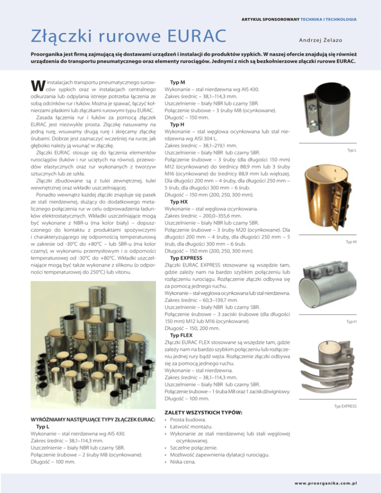 ARTYKUŁ SPONSOROWANY TECHNIKA I TECHNOLOGIA Złączki rurowe EURAC Andr zej Żelazo Proorganika jest firmą zajmującą się dostawami urządzeń i instalacji do produktów sypkich. W naszej ofercie znajdują się również urządzenia do transportu pneumatycznego oraz elementy rurociągów. Jednymi z nich są bezkołnierzowe złączki rurowe EURAC. W instalacjach transportu pneumatycznego surowców sypkich oraz w instalacjach centralnego odkurzania lub odpylania istnieje potrzeba łączenia ze sobą odcinków rur i łuków. Można je spawać, łączyć kołnierzami płaskimi lub złączkami rurowymi typu EURAC. Zasada łączenia rur i łuków za pomocą złączek EURAC jest niezwykle prosta. Złączkę nasuwamy na jedną rurę, wsuwamy drugą rurę i skręcamy złączkę śrubami. Dobrze jest zaznaczyć wcześniej na rurze, jak głęboko należy ją wsunąć w złączkę. Złączki EURAC stosuje się do łączenia elementów rurociągów (łuków i rur uciętych na równo), przewodów elastycznych oraz rur wykonanych z tworzyw sztucznych lub ze szkła. Złączki zbudowane są z tulei zewnętrznej, tulei wewnętrznej oraz wkładki uszczelniającej. Ponadto wewnątrz każdej złączki znajduje się pasek ze stali nierdzewnej, służący do dodatkowego metalicznego połączenia rur w celu odprowadzenia ładunków elektrostatycznych. Wkładki uszczelniające mogą być wykonane z NBR-u (ma kolor biały) – dopuszczonego do kontaktu z produktami spożywczymi i charakteryzującego się odpornością temperaturową w zakresie od -30°C do +80°C – lub SBR-u (ma kolor czarny), w wykonaniu przemysłowym i o odporności temperaturowej od -30°C do +80°C. Wkładki uszczelniające mogą być także wykonane z silikonu (o odporności temperaturowej do 250°C) lub vitonu. Typ M Wykonanie – stal nierdzewna wg AIS 430. Zakres średnic – 38,1–114,3 mm. Uszczelnienie – biały NBR lub czarny SBR. Połączenie śrubowe – 3 śruby M8 (ocynkowane). Długość – 150 mm. Typ H Wykonanie – stal węglowa ocynkowana lub stal nierdzewna wg AISI 304 L. Zakres średnic – 38,1–219,1 mm. Uszczelnienie – biały NBR lub czarny SBR. Połączenie śrubowe – 3 śruby (dla długości 150 mm) M12 (ocynkowane) do średnicy 88,9 mm lub 3 śruby M16 (ocynkowane) do średnicy 88,9 mm lub większej. Dla długości 200 mm – 4 śruby, dla długości 250 mm – 5 śrub, dla długości 300 mm – 6 śrub. Długość – 150 mm (200, 250, 300 mm). Typ HX Wykonanie – stal węglowa ocynkowana. Zakres średnic – 200,0–355,6 mm. Uszczelnienie – biały NBR lub czarny SBR. Połączenie śrubowe – 3 śruby M20 (ocynkowane). Dla długości 200 mm – 4 śruby, dla długości 250 mm – 5 śrub, dla długości 300 mm – 6 śrub. Długość – 150 mm (200, 250, 300 mm). Typ EXPRESS Złączki EURAC EXPRESS stosowane są wszędzie tam, gdzie zależy nam na bardzo szybkim połączeniu lub rozłączeniu rurociągu. Rozłączenie złączki odbywa się za pomocą jednego ruchu. Wykonanie – stal węglowa ocynkowana lub stal nierdzewna. Zakres średnic – 60,3–139,7 mm Uszczelnienie – biały NBR lub czarny SBR. Połączenie śrubowe – 3 zaciski śrubowe (dla długości 150 mm) M12 lub M16 (ocynkowane). Długość – 150, 200 mm. Typ FLEX Złączki EURAC FLEX stosowane są wszędzie tam, gdzie zależy nam na bardzo szybkim połączeniu lub rozłączeniu jednej rury bądź węża. Rozłączenie złączki odbywa się za pomocą jednego ruchu. Wykonanie – stal nierdzewna. Zakres średnic – 38,1–114,3 mm. Uszczelnienie – biały NBR lub czarny SBR. Połączenie śrubowe – 1 śruba M8 oraz 1 zacisk dźwigniowy. Długość – 100 mm. Typ L Typ M Typ H Typ EXPRESS WYRÓŻNIAMY NASTĘPUJĄCE TYPY ZŁĄCZEK EURAC: Typ L Wykonanie – stal nierdzewna wg AIS 430. Zakres średnic – 38,1–114,3 mm. Uszczelnienie – biały NBR lub czarny SBR. Połączenie śrubowe – 2 śruby M8 (ocynkowane). Długość – 100 mm. ZALETY WSZYSTKICH TYPÓW: • Prosta budowa. • Łatwość montażu. • Wykonanie ze stali nierdzewnej lub stali węglowej ocynkowanej. • Szczelne połączenie. • Możliwość zapewnienia dylatacji rurociągu. • Niska cena. P&B nr nr 3 maj-czerwiec 2011 51 w w w. p r o o r g a n i k a . c o m . p l
