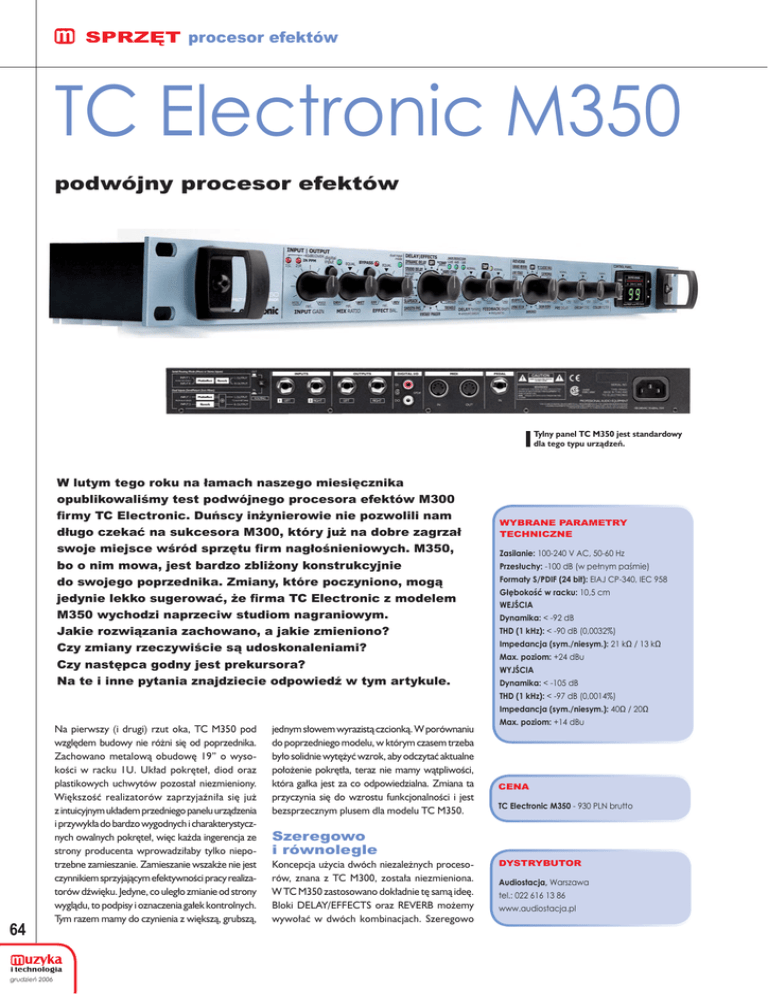 SPRZĘT procesor efektów TC Electronic M350 podwójny procesor efektów Tylny panel TC M350 jest standardowy dla tego typu urządzeń. W lutym tego roku na łamach naszego miesięcznika opublikowaliśmy test podwójnego procesora efektów M300 firmy TC Electronic. Duńscy inżynierowie nie pozwolili nam długo czekać na sukcesora M300, który już na dobre zagrzał swoje miejsce wśród sprzętu firm nagłośnieniowych. M350, bo o nim mowa, jest bardzo zbliżony konstrukcyjnie do swojego poprzednika. Zmiany, które poczyniono, mogą jedynie lekko sugerować, że firma TC Electronic z modelem M350 wychodzi naprzeciw studiom nagraniowym. Jakie rozwiązania zachowano, a jakie zmieniono? Czy zmiany rzeczywiście są udoskonaleniami? Czy następca godny jest prekursora? Na te i inne pytania znajdziecie odpowiedź w tym artykule. WYBRANE PARAMETRY TECHNICZNE Zasilanie: 100-240 V AC, 50-60 Hz Przesłuchy: -100 dB (w pełnym paśmie) Formaty S/PDIF (24 bit): EIAJ CP-340, IEC 958 Głębokość w racku: 10,5 cm WEJŚCIA Dynamika: < -92 dB THD (1 kHz): < -90 dB (0,0032%) Impedancja (sym./niesym.): 21 kΩ / 13 kΩ Max. poziom: +24 dBu WYJŚCIA Dynamika: < -105 dB THD (1 kHz): < -97 dB (0,0014%) Impedancja (sym./niesym.): 40Ω / 20Ω 64 grudzień 2006 Na pierwszy (i drugi) rzut oka, TC M350 pod względem budowy nie różni się od poprzednika. Zachowano metalową obudowę 19” o wysokości w racku 1U. Układ pokręteł, diod oraz plastikowych uchwytów pozostał niezmieniony. Większość realizatorów zaprzyjaźniła się już z intuicyjnym układem przedniego panelu urządzenia i przywykła do bardzo wygodnych i charakterystycznych owalnych pokręteł, więc każda ingerencja ze strony producenta wprowadziłaby tylko niepotrzebne zamieszanie. Zamieszanie wszakże nie jest czynnikiem sprzyjającym efektywności pracy realizatorów dźwięku. Jedyne, co uległo zmianie od strony wyglądu, to podpisy i oznaczenia gałek kontrolnych. Tym razem mamy do czynienia z większą, grubszą, jednym słowem wyrazistą czcionką. W porównaniu do poprzedniego modelu, w którym czasem trzeba było solidnie wytężyć wzrok, aby odczytać aktualne położenie pokrętła, teraz nie mamy wątpliwości, która gałka jest za co odpowiedzialna. Zmiana ta przyczynia się do wzrostu funkcjonalności i jest bezsprzecznym plusem dla modelu TC M350. Szeregowo i równolegle Koncepcja użycia dwóch niezależnych procesorów, znana z TC M300, została niezmieniona. W TC M350 zastosowano dokładnie tę samą ideę. Bloki DELAY/EFFECTS oraz REVERB możemy wywołać w dwóch kombinacjach. Szeregowo Max. poziom: +14 dBu CENA TC Electronic M350 - 930 PLN brutto DYSTRYBUTOR Audiostacja, Warszawa tel.: 022 616 13 86 www.audiostacja.pl procesor efektów SPRZĘT – na podany sygnał (stereo) nakładany jest jeden z efektów opóźnieniowych (lub dynamicznych) sekcji multiefektowej, który w następnym kroku okraszony zostaje pogłosem, za który odpowiedzialna jest oddzielna sekcja. Całość wędruje na wyjście stereofoniczne urządzenia. Inaczej sprawa przedstawia się w równoległej konfiguracji procesorów. Wówczas sygnał dostarczony do lewego monofonicznego kanału wejściowego (Input 1) traktowany jest efektami z sekcji DELAY/EFFECTS, natomiast sygnał podany na prawy kanał wejściowy (Input 2) podany jest obróbce generatora pogłosów. Suma wprowadzonych i przetworzonych sygnałów powraca na wyjście stereofoniczne. Wyboru między trybem szeregowym i równoległym dokonujemy przyciskiem umieszczonym niezbyt komfortowo (bez zmian w stosunku do TC M300) na tylnym panelu. O wyborze procedury równoległej informuje nas świecąca zielona dioda DUAL INPUT MODE, analogicznie do modelu TC M300. WET. Ostatnią gałką z tej sekcji jest EFFECT BAL. za pomocą, którego ustawiamy proporcje między multiefektem a pogłosem. Oprócz tego umieszczone są dwa przyciski –BYPASS, którego działanie jest dwojakie w zależności od konfiguracji bloków efektowych (MUTE dla równoległego ułożenia i klasyczny BYPASS, czyli podanie wejścia bezpośrednio na wyjście, dla trybu szeregowego) oraz przycisk DIGITAL INPUT, którym wybieramy pomiędzy wejściem analogowym a cyfrowym. Dioda umieszczona powyżej nie świeci się, gdy sygnał pobierany jest z wejścia analogowego, świeci się, gdy używamy wejścia cyfrowego. Miganie diody oznacza próbę synchronizacji lub jej utratę, wówczas po upływie kilku sekund urządzenie automatycznie przełącza się na pobór sygnału z wejścia analogowego. INPUT | OUTPUT Blok multiefektów Panel przedni podzielony jest na cztery sekcje. W pierwszej z nich INPUT | OUTPUT znajdują się trzy pokrętła. Pokrętło INPUT GAIN służy do wysterowania poziomu wejściowego sygnału. Dla sygnałów analogowych regulacja możliwa jest w zakresie od -10dB do 14dB, zaś dla cyfrowych od -18 dB do 6 dB. O poziomie sygnału na wejściu informują nas, znajdujące się powyżej pokręteł, dwie diody (odpowiednio dla kanału lewego i prawego) świecące w trzech kolorach: zielonym (obecność sygnału na wejściu), żółtym (prawidłowe wysterowanie) i tym, którego nie lubimy – czerwonym (przesterowanie sygnału). Kolejne pokrętło oznaczone napisem MIX RATIO ma zastosowanie przy doborze proporcji między sygnałem wejściowym (DRY) a efektem (WET). Standardowo, przy użyciu procesora w pętli wysyłka/powrót, ustawiamy pokrętło w pozycji Pierwsza sekcja TC M350 – INPUT/OUTPUT, a w niej gałki odpowiadające za wysterowanie sygnału wejściowego, ustawienie proporcji sygnału wejściowego do wyjściowego oraz balans efektów. Wszelkie patenty opisane powyżej niczym nie różnią się od tych zastosowanych w poprzednim modelu. Począwszy od lewej strony, znajdujemy pokrętło większe od pozostałych (zdecydowanie usprawnia to pracę „po omacku”), którym wybieramy rodzaj stosowanego efektu. Możemy go modyfikować za pomocą dwóch kolejnych gałek. Do wyboru mamy piętnaście algorytmó