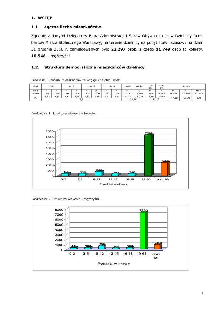 1. WSTĘP 1.1. Łączna liczba mieszkańców. Zgodnie z danymi Delegatury Biura Administracji i Spraw Obywatelskich w Dzielnicy Rembertów Miasta Stołecznego Warszawy, na terenie dzielnicy na pobyt stały i czasowy na dzień 31 grudnia 2010 r. zameldowanych było 22.297 osób, z czego 11.749 osób to kobiety, 10.548 – mężczyźni. 1.2. Struktura demograficzna mieszkańców dzielnicy. Tabela nr 1. Podział mieszkańców ze względu na płeć i wiek. Wiek Płeć Liczba % 0-5 M 764 3,42 6-12 K 744 3,33 M 738 3,31 13-15 K M 708 305 3,18 1,37 19,01 16-18 K 299 1,34 M 337 1,51 K 346 1,55 19-65 pow. pow. 65 60 M K 1.014 2.356 4,56 10,57 15,13 19-60 M K 7.390 7.296 33,14 32,72 65,86 Razem M 10.548 K 11.749 47,30 52,70 M+K 22.297 100 Wykres nr 1. Struktura wiekowa – kobiety. 8000 7296 7000 6000 5000 4000 3000 2356 2000 1000 406 338 708 346 299 0 0-2 3-5 6-12 13-15 16-18 19-60 pow. 60 Przedział wiekowy Wykres nr 2. Struktura wiekowa - mężczyźni. 8000 7390 7000 6000 5000 4000 3000 2000 1000 412 327 738 1014 305 337 13-15 16-18 0 0-2 3-5 6-12 19-65 pow . 65 Przedział w iekow y 4 Wykres nr 3. Charakterystyka społeczno – demograficzna. 66,86% dzieci i młodzież 15,13% w iek produkcyjny w iek poprodukcyjny 19,01% Społeczność Rembertowa: • Jest społecznością młodą – prawie 86% mieszkańców nie przekroczyło wieku emerytalnego. • Jedynie około 19% mieszkańców to dzieci i młodzież. W perspektywie 20 – 30 lat, przy zachowaniu istniejących tendencji demograficznych, proces starzenia się społeczności będzie szczególnie dotkliwy – aktualne proporcje mogą się odwrócić. • Prawie 67% mieszkańców jest w wieku aktywności zawodowej, co sprawia, że szczególne poczucie zagrożenia wywołuje perspektywa utraty pracy. • Około 800 dzieci jest wieku kwalifikującym do korzystania z opieki żłobkowej, zaś ponad 660 dzieci – w wieku kwalifikującym do opieki przedszkolnej. 2. ZADANIA OŚRODKA 1. Zadania własne m. st. Warszawy, realizowane na terenie Dzielnicy Rembertów, określone w ustawie o pomocy społecznej, a także inne zadania – zgodnie z ustaleniami Rady Miasta. 2. Zadania zlecone m. st. Warszawie, określone w ustawie o pomocy społecznej i innych ustawach oraz zadania wynikające z porozumień zawartych z Wojewodą Mazowieckim, innymi jednostkami samorządu terytorialnego i administracją rządową. 3. STRUKTURA ORGANIZACYJNA OŚRODKA 3.1. Struktura organizacyjna Ośrodka. Struktura organizacyjna jest zgodna z Zarządzeniem Nr 6 Dyrektora Ośrodka Pomocy Społecznej Dzielnicy Rembertów m. st. Warszawy z dnia 30 czerwca 2008 r. W ramach regulaminu wyodrębniono następujące podstawowe komórki organizacyjne: 5 1. Dział Pomocy Środowiskowej – dział ten m. in. zajmuje się organizacją pomocy materialnej oraz usługowej poprzez terenowych pracowników socjalnych. 2. Samodzielne Stanowisko ds. Świadczeń – głównym zadaniem pracownika jest realizacja świadczeń, prowadzenie bazy danych oraz przygotowywanie sprawozdań z udzielonej pomocy. 3. Dział ds. Uzależnień i Pomocy Specjalistycznej – pracownicy działu prowadzą poradnictwo specjalistyczne, Agencję Poradnictwa Zawodowego i Pośrednictwa Pracy oraz Klub Wolontariusza 4. Dział Finansowo – Księgowy – prowadzi obsługę finansowo – księgową całego Ośrodka. 5. Dział Administracyjny – pracownicy działu m. in. czuwają nad prawidłową eksploatacją nieruchomości oraz majątku, sprawami kadrowymi oraz obsługą kancelaryjną Ośrodka. 6. Dom Dziennego Pobytu – jest placówką wsparcia o zasięgu lokalnym, ukierunkowaną na utrzymanie osób w podeszłym wieku oraz niepełnosprawnych ruchowo w środowisku zamieszkania; koordynacja Rembertowskiej Akademii Seniora. 7. Samodzielne stanowisko radcy prawnego – stanowisko ds. obsługi prawnej Ośrodka, zadanie realizowane przez podmiot gospodarczy. 3.2. Stan zatrudnienia pracowników. Na dzień 31 grudnia 2010 r. Ośrodek Pomocy Społecznej wraz z placówką wsparcia zatrudniał 32 pracowników. Tabela nr 2. Charakterystyka zatrudnienia w Ośrodku Pomocy Społecznej – stan na dzień 31 grudnia 2010 r. Lp. Wykształcenie Liczba pracowników Liczba kobiet Liczba mężczyzn 9 6 3 12 11 1 1. Podyplomowe 2. Wyższe 3. Wyższe zawodowe (licencjat, inżynier) 5 3 2 4. Policealne 2 2 0 5. Średnie 2 2 0 6. Zawodowe 2 1 1 32 25 7 Liczba pracowników ogółem Pracownicy Ośrodka Pomocy Społecznej cały czas podnoszą swoje kwalifikacje: aktualnie pięciu pracowników uzupełnia wykształcenie. Pracownicy podnoszą swoje kwalifikacje także w innych formach edukacyjnych. W roku 2010 uczestniczyli w następujących przedsięwzięciach: 6 Tabela nr 3. Wykaz szkoleń, w których uczestniczyli pracownicy Ośrodka. Lp. Data 1 17-22.01.10 2 18.01.10 3 27.01.10 4 16.02.10 5 16.02.10 6 19.02.10 7 25.02.10 8 25.0223.03.10 9 02.09-11.10 10 09.03.10 11 10.03.10 12 11.03.10 13 18.03.10 14 14-17.04.10 15 19-21.04.10 16 20.04.10 17 21.04.10 18 04.05.10 19 12.05.10 20 14.05.10 21 17-19.05.10 22 17-19.05.10 23 19.05.10 Tytuł Treningi psychologiczne Przygotowanie do sporządzenia sprawozdania RB-WS za rok 2009 , klasyfikowanie oraz ewidencja wydatków strukturalnych „Zamknięcie roku 2009 w wybranych jednostkach sektora finansów publicznych oraz proces likwidacji niektórych jednostek w 2010 r.” Obowiązki i odpowiedzialność Dyrektorów Szkół za bezpieczne użytkowania budynków w świetle prawa budowlanego. „Administrowanie nieruchomościami” Superwizja: „Praca z rodzinami w tym szczególnie trudnymi oraz problemy uzależnień w tym szczególnie narkomanii” „Zasady zdrowego żywienia w przedszkolu, szkole oraz innych placówkach zbiorowego żywienia „ Szkolenie okresowe BHP dla pracodawców i innych osób na stanowiskach kierowniczych Zajęcia językowe Szkolenie: „Bieżące praktyczne problemy prawa pracy w jednostkach sektora finansów publicznych ze szczególnym uwzględnieniem czasu pracy oraz wynagrodzeń” „Równ