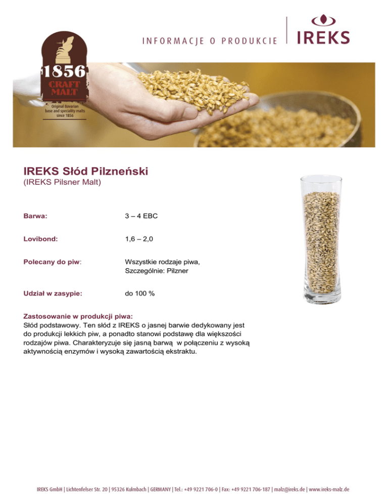 IREKS Słód Pilzneński (IREKS Pilsner Malt) Barwa: 3 – 4 EBC Lovibond: 1,6 – 2,0 Polecany do piw: Wszystkie rodzaje piwa, Szczególnie: Pilzner Udział w zasypie: do 100 % Zastosowanie w produkcji piwa: Słód podstawowy. Ten słód z IREKS o jasnej barwie dedykowany jest do produkcji lekkich piw, a ponadto stanowi podstawę dla większości rodzajów piwa. Charakteryzuje się jasną barwą w połączeniu z wysoką aktywnością enzymów i wysoką zawartością ekstraktu. IREKS Słód Pilzneński (IREKS Pilsner Malt) Standardowa specyfikacja: Ekstrakt w suchej substancji Zawartość wody Barwa brzeczki Barwa brzeczki po gotowaniu Zawartość białka, sucha substancja Azot rozpuszczalny, sucha substancja Liczba Kolbacha pH Lepkość β-glukan w brzeczce kongresowej Friabilimetr kruche szkliste DMS - Prekursory > 81 <5 3-4 5-6 9.5 - 11.5 610 - 780 38.0 - 45.0 5.8 - 6.0 1.45 - 1.60 < 250 > 80 < 2,5 <7 % % Jednostki EBC Jednostki EBC % mg /100 g % mPas mg/l % % ppm Metoda* 3.1.4.2.2 3.1.4.1 3.1.4.2.8.1 3.1.4.2.9 3.1.4.5.1.1 3.1.4.5.2.1 3.1.4.5.3 3.1.4.2.7 3.1.4.4 3.1.4.9.1.2 3.1.3.6 3.1.4.17 * Metoda analityczna zgodna z MEBAK, surowce 2011 Dostawa: Luzem (ciężarówka, wagon); Premiksy możliwe do wykonania w fabryce 500 kg Big Bag 25 kg worek papierowy (na palecie 750 kg, do 32 palet w naczepie TIR) Możliwe dostawy organicznego słodu browarnego Zgodnie z rozporządzeniem o produkcji ekologicznej UE